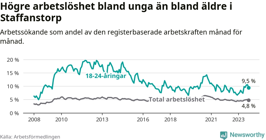 Precis som den totala arbetslösheten stiger arbetslösheten bland unga (+1,7 procentenheter). I oktober var 9,5 procent av 18–24-åringarna inskrivna som arbetssökande (motsvarande 95 personer). Mäter vi antalet inskrivna ser vi en ökning med 20 personer på ett års sikt.