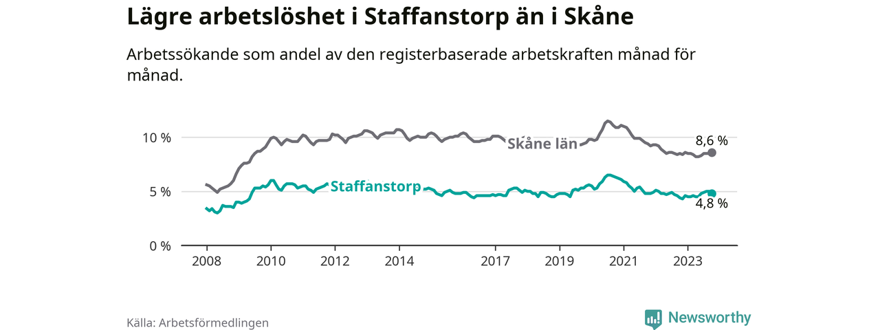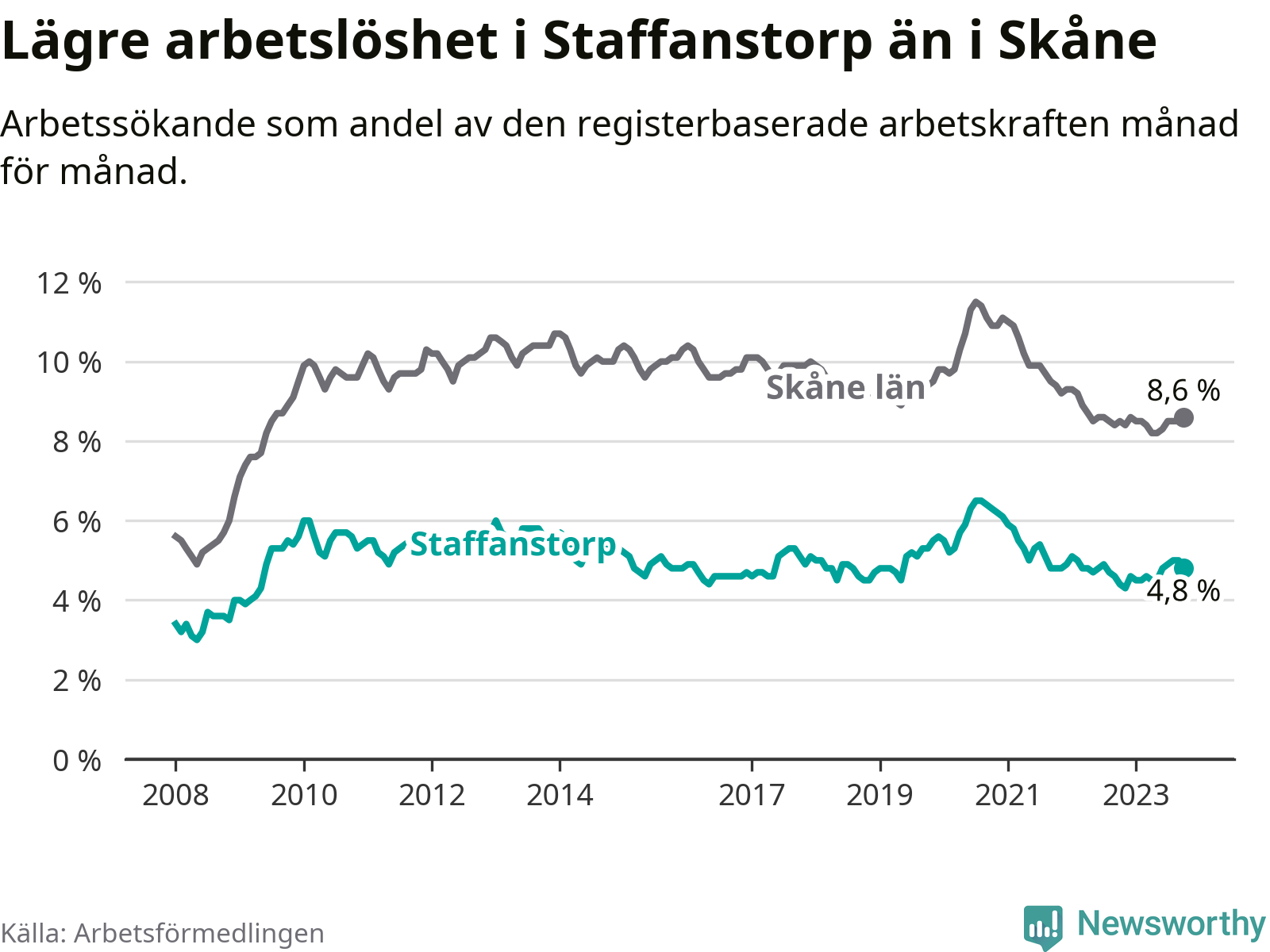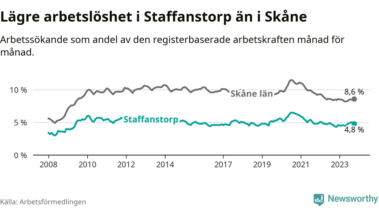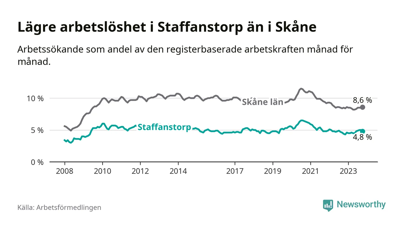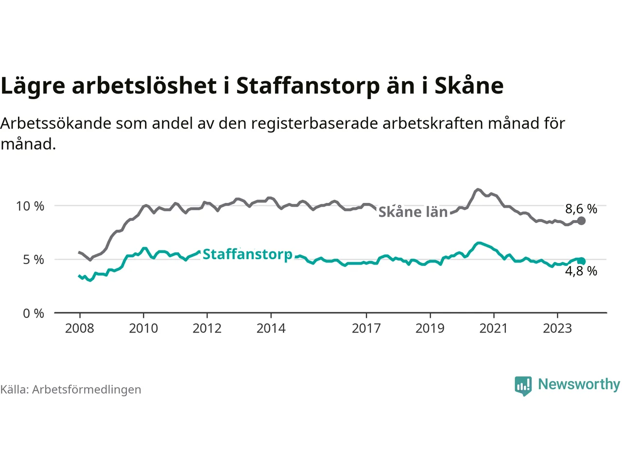 Även om arbetslösheten i Staffanstorp alltså ökar, så ligger den fortfarande under snittet i hela Skåne län (4,8 procent i kommunen, jämfört med 8,6 procent i hela länet). Vellinge har den lägsta arbetslösheten i länet (3,3 procent), medan Malmö har den högsta (12,3 procent). För att Staffanstorp skulle komma ner i samma arbetslöshetsnivå som Vellinge skulle 195 personer behöva sysselsättas.