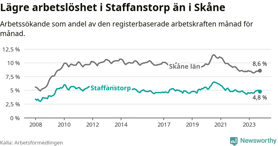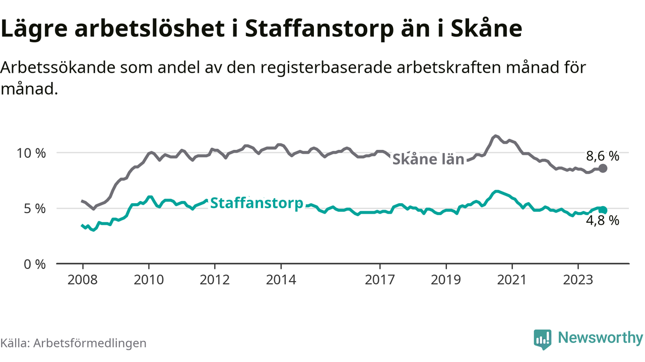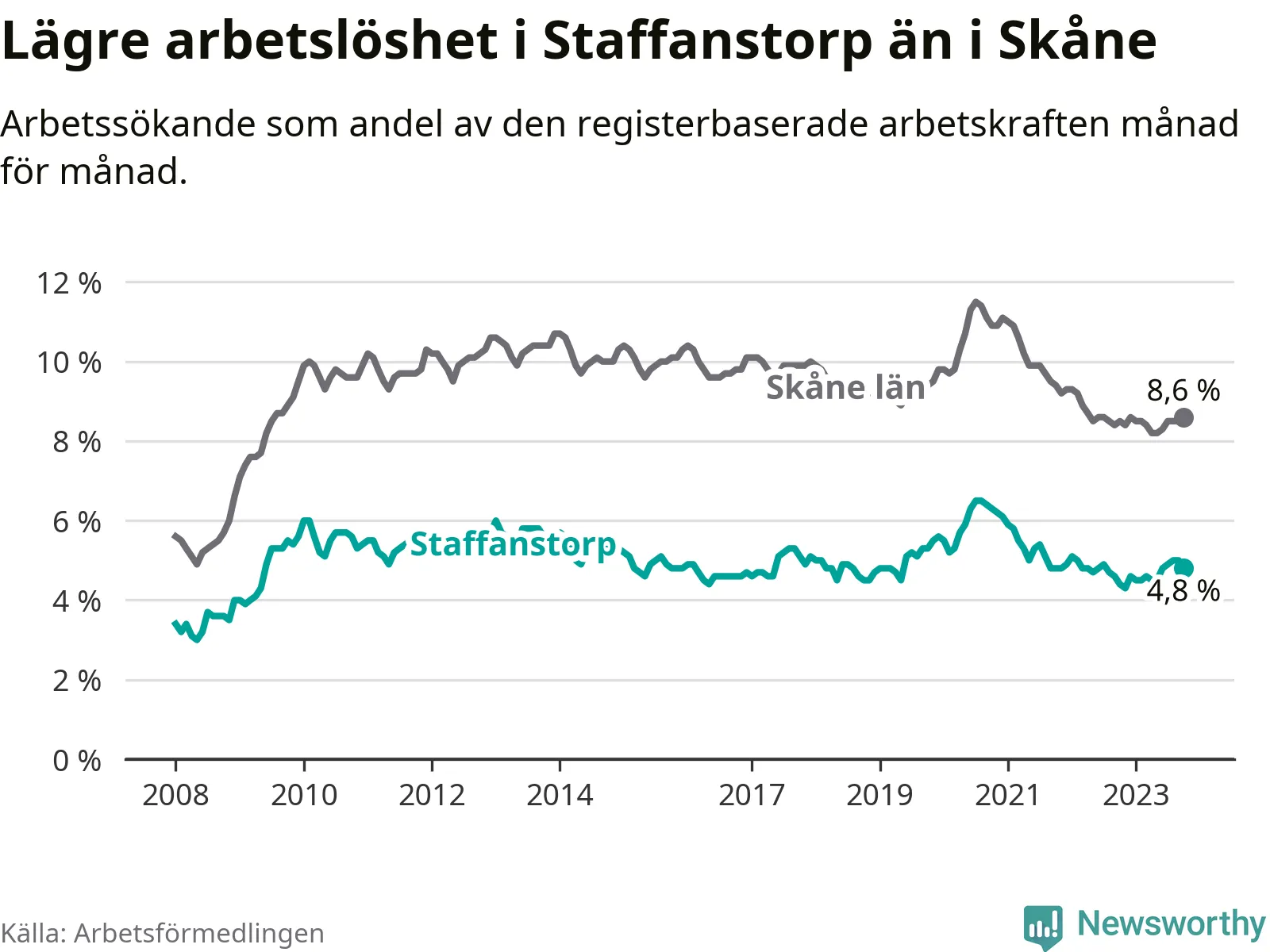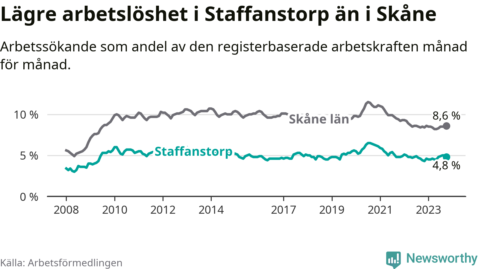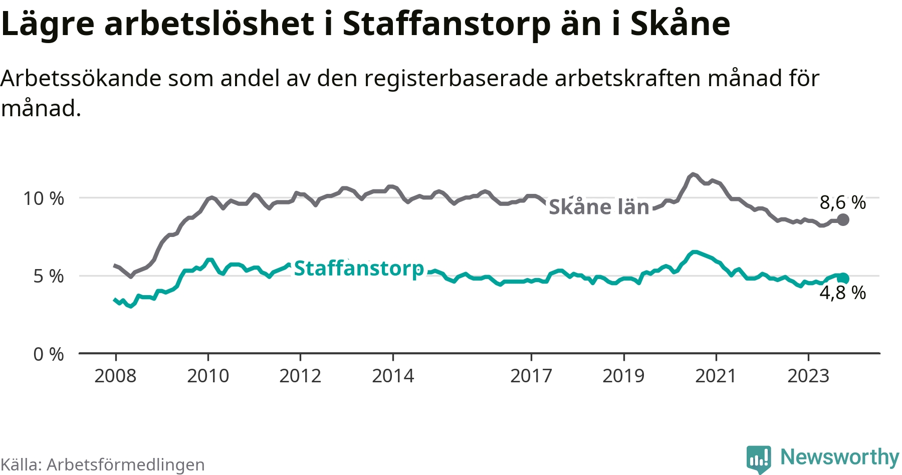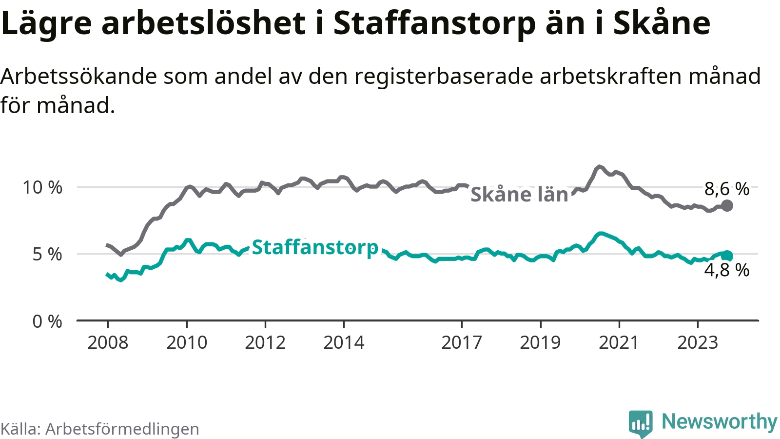 Även om arbetslösheten i Staffanstorp alltså ökar, så ligger den fortfarande under snittet i hela Skåne län (4,8 procent i kommunen, jämfört med 8,6 procent i hela länet). Vellinge har den lägsta arbetslösheten i länet (3,3 procent), medan Malmö har den högsta (12,3 procent). För att Staffanstorp skulle komma ner i samma arbetslöshetsnivå som Vellinge skulle 195 personer behöva sysselsättas.