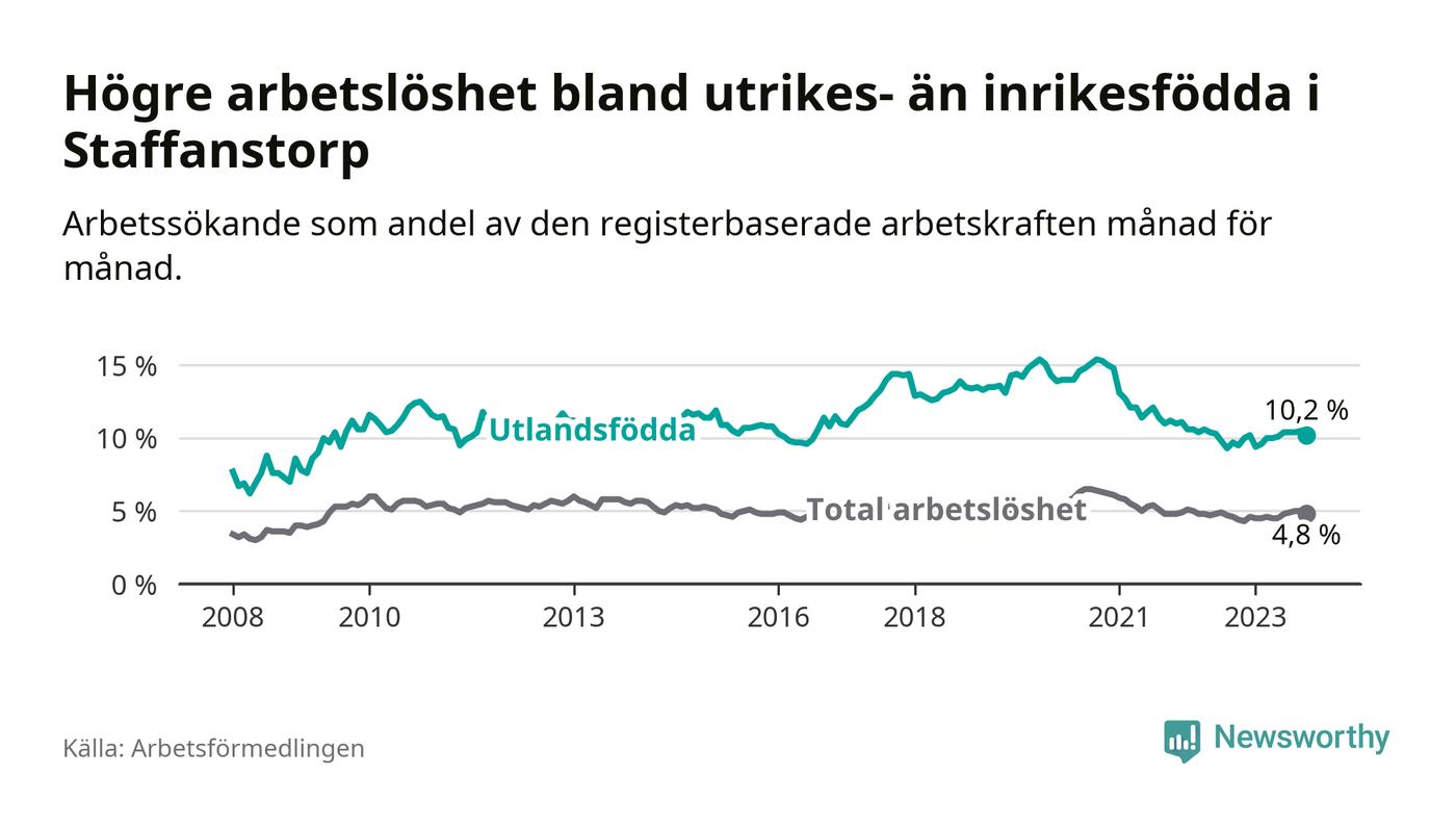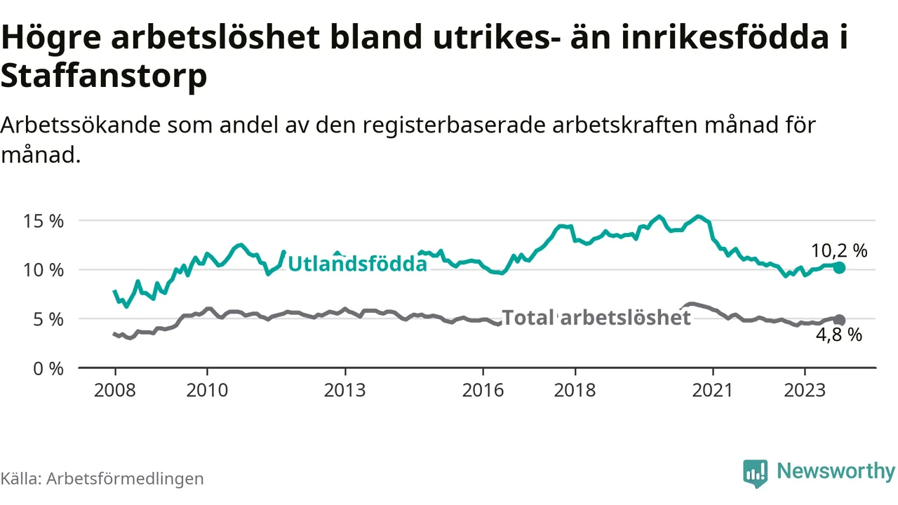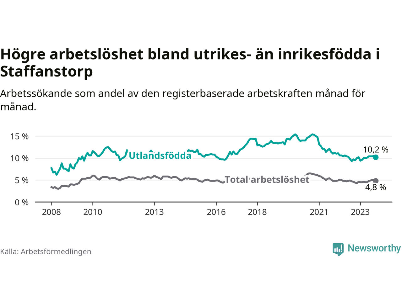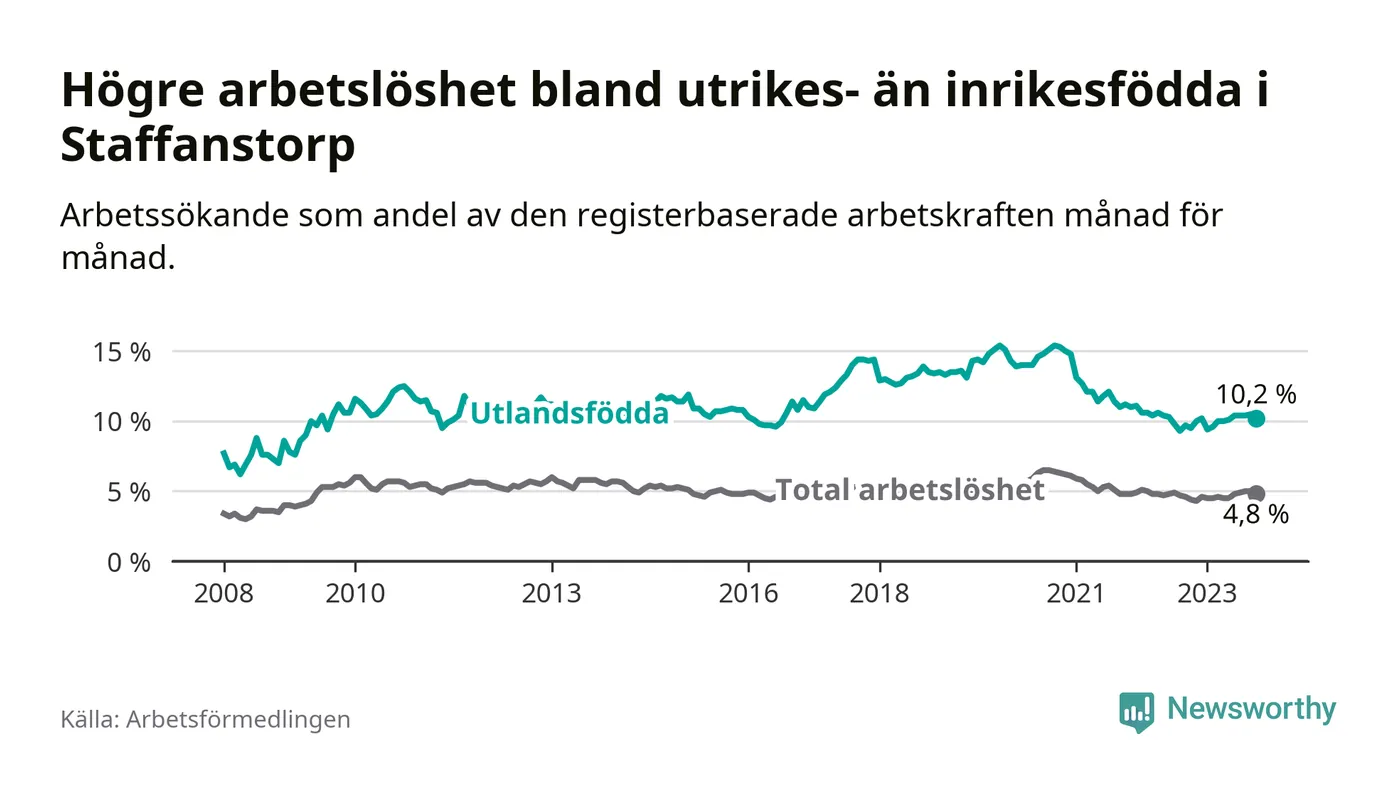 Arbetslösheten bland utlandsfödda var 10,2 procent i Staffanstorp under oktober månad, motsvarande 250 av 2 451 personer. Det är 0,7 procentenheter fler än vid samma tidpunkt i fjol (+38 om man räknar personer).