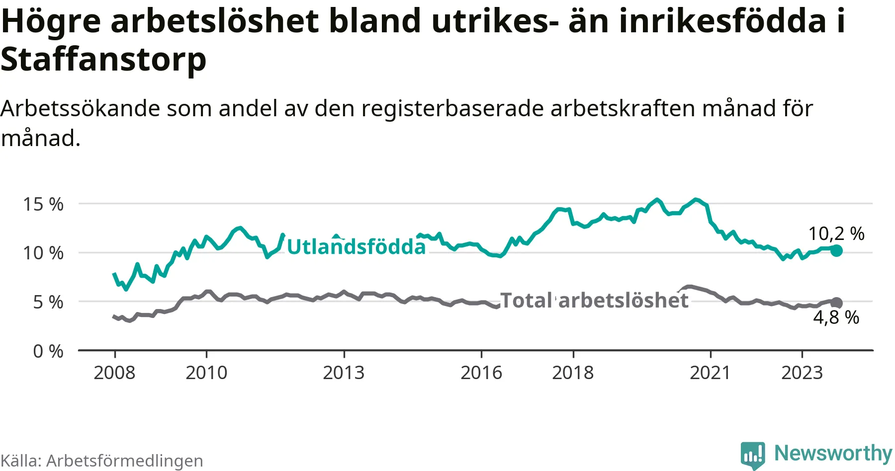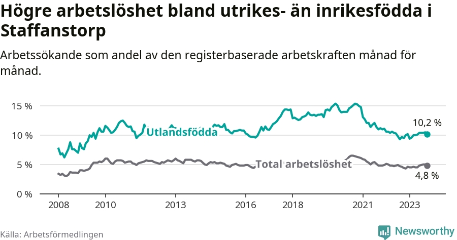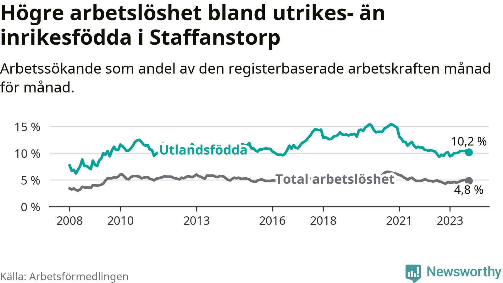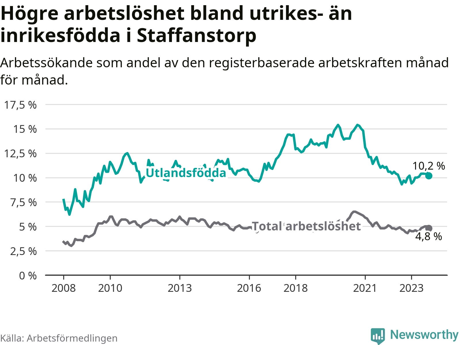 Arbetslösheten bland utlandsfödda var 10,2 procent i Staffanstorp under oktober månad, motsvarande 250 av 2 451 personer. Det är 0,7 procentenheter fler än vid samma tidpunkt i fjol (+38 om man räknar personer).