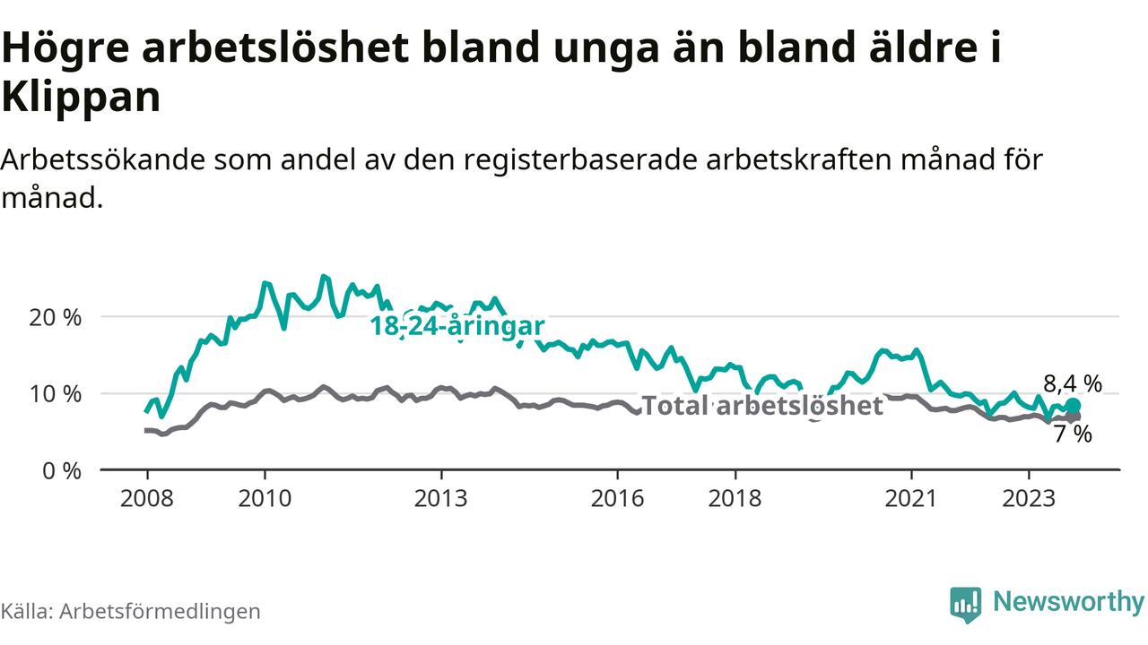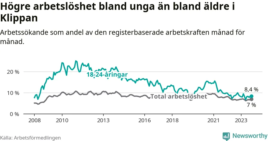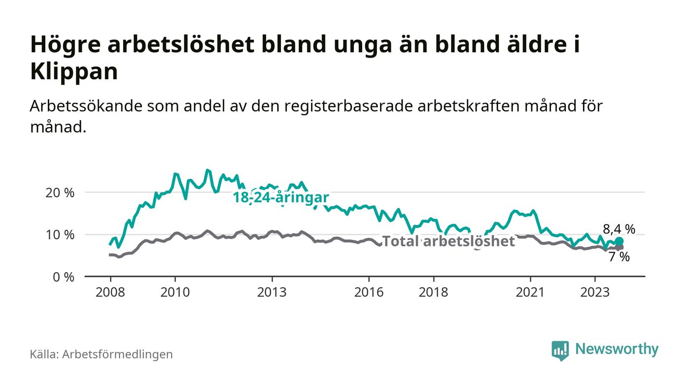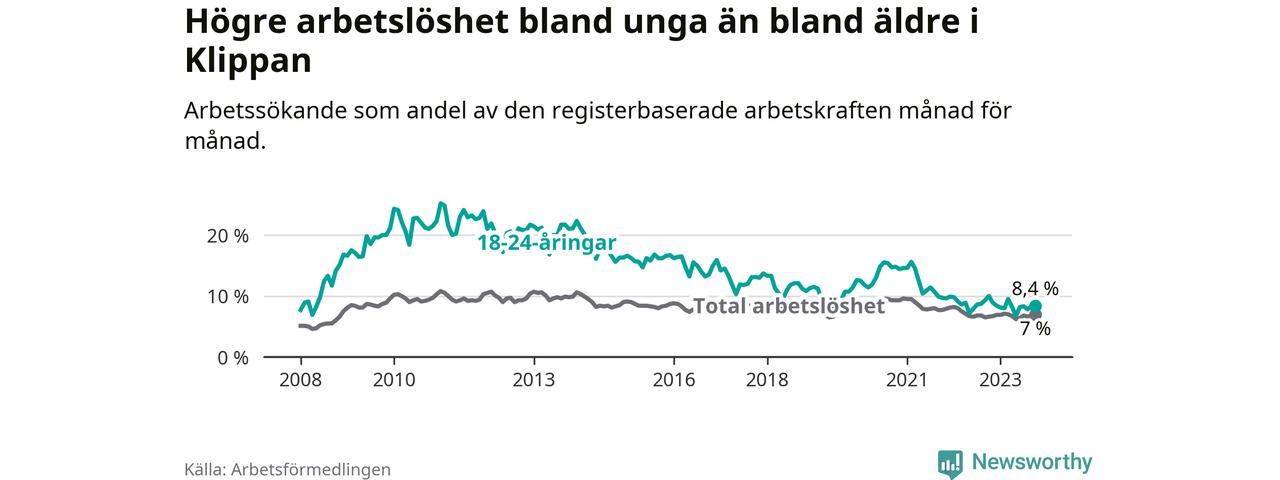 Till skillnad från den totala arbetslösheten sjunker arbetslösheten bland unga (−1,6 procentenheter). I oktober var 8,4 procent av 18–24-åringarna inskrivna som arbetssökande (motsvarande 77 personer). Mäter vi antalet inskrivna ser vi en minskning med 13 personer på ett års sikt.