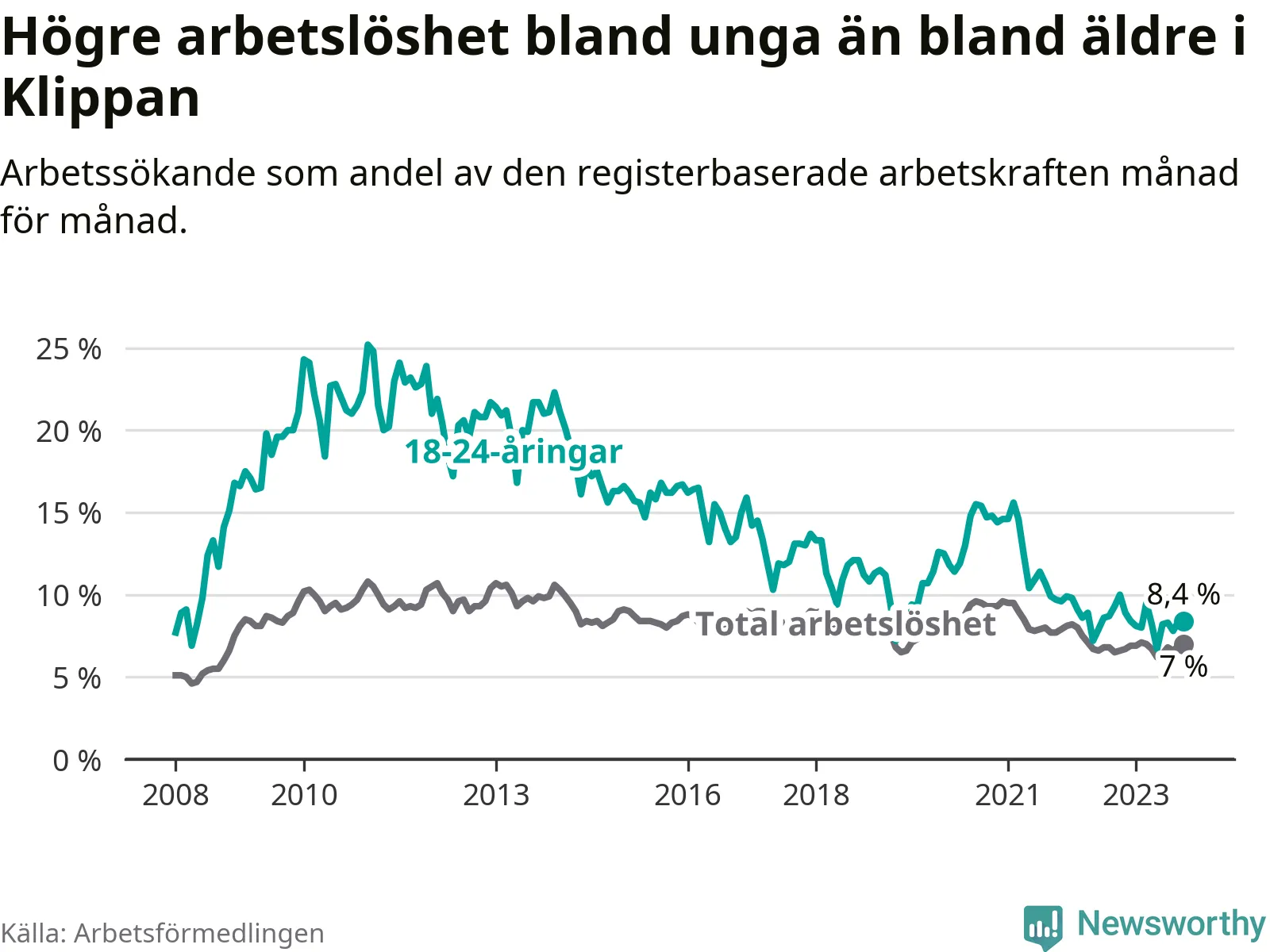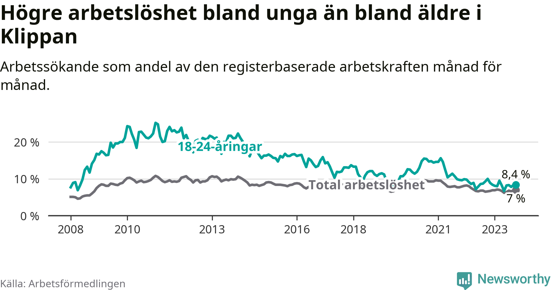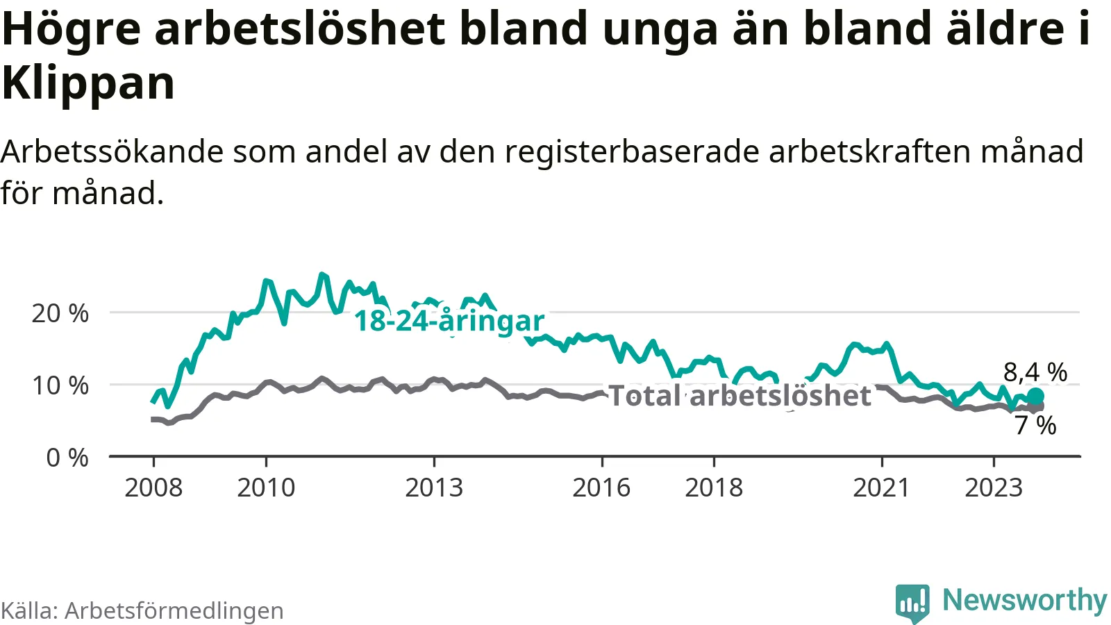 Till skillnad från den totala arbetslösheten sjunker arbetslösheten bland unga (−1,6 procentenheter). I oktober var 8,4 procent av 18–24-åringarna inskrivna som arbetssökande (motsvarande 77 personer). Mäter vi antalet inskrivna ser vi en minskning med 13 personer på ett års sikt.