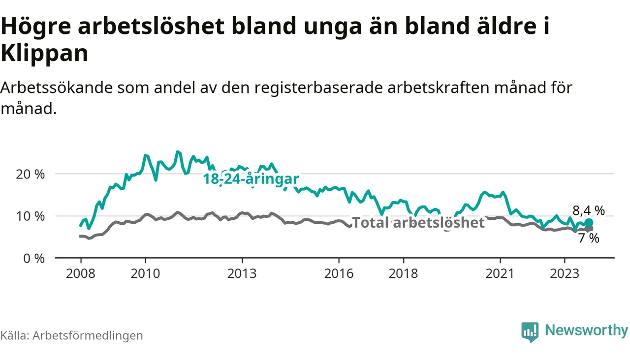 Graf: Arbetslöshet bland unga i Klippans kommun och Skåne län