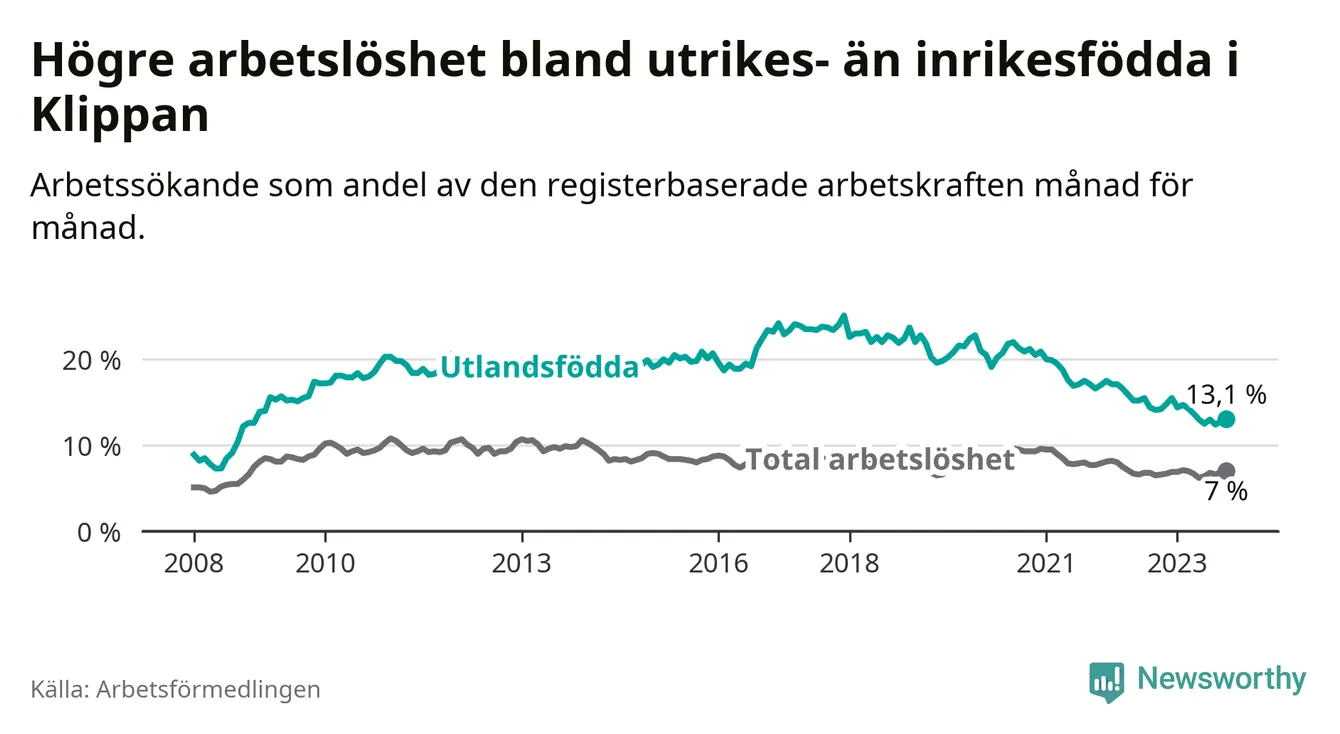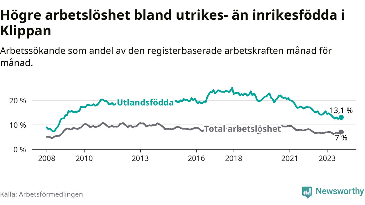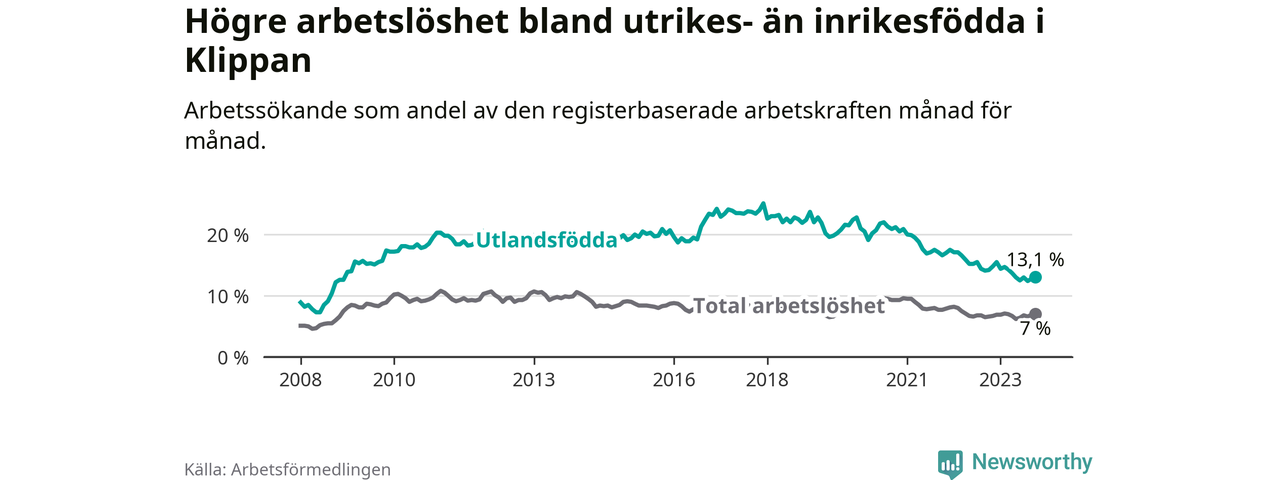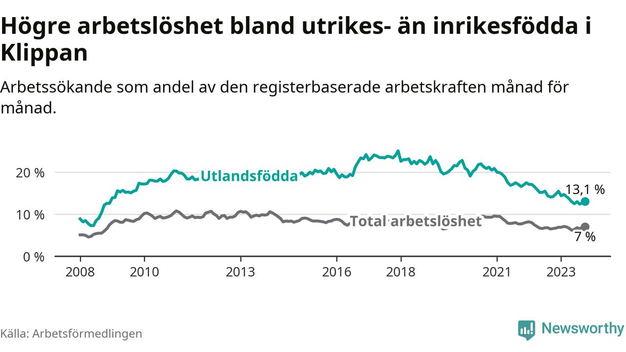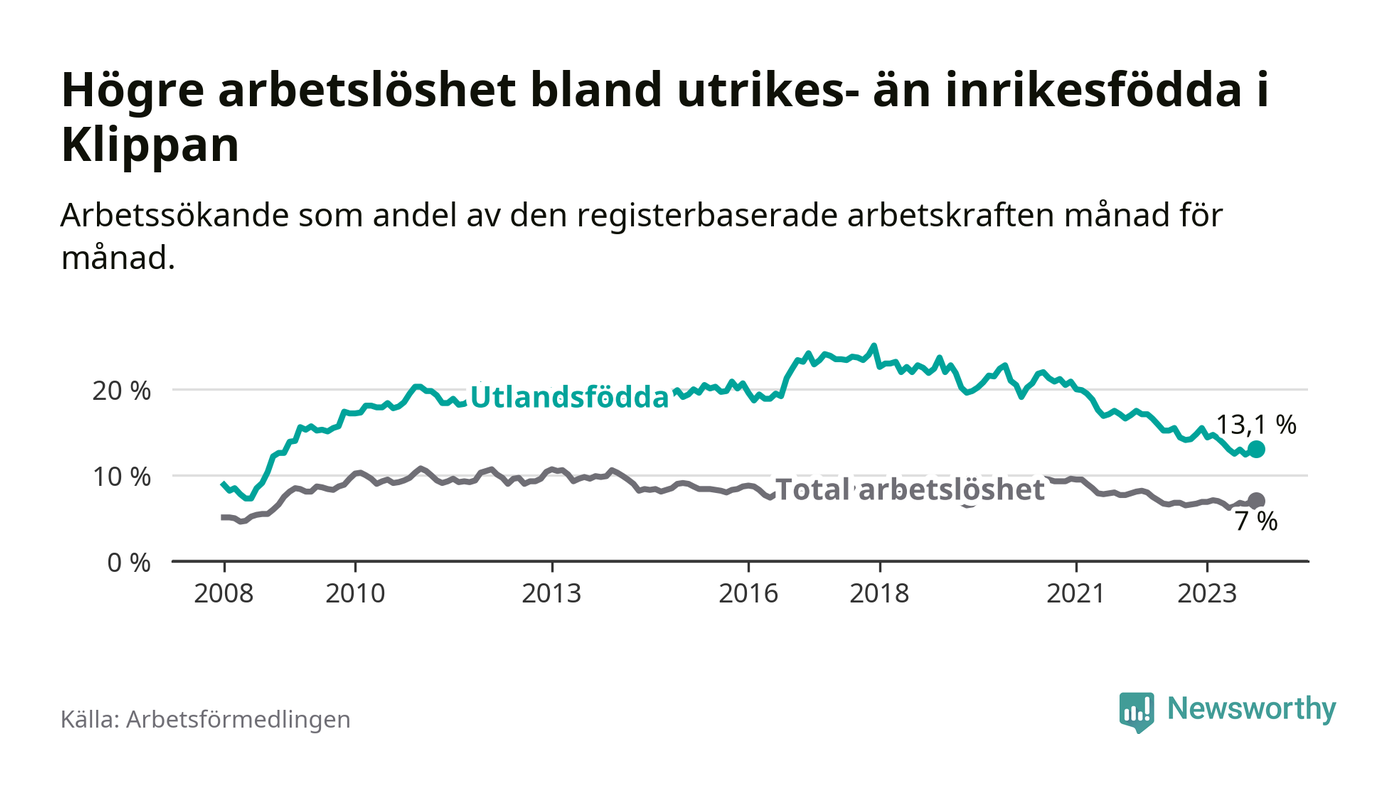 Läs mer om arbetslösheten bland utlandsfödda längre ner i den här texten.