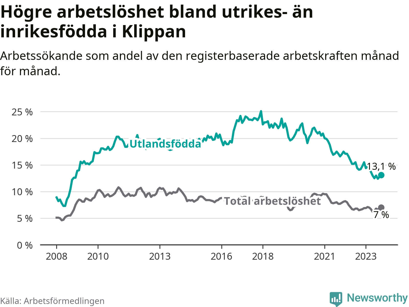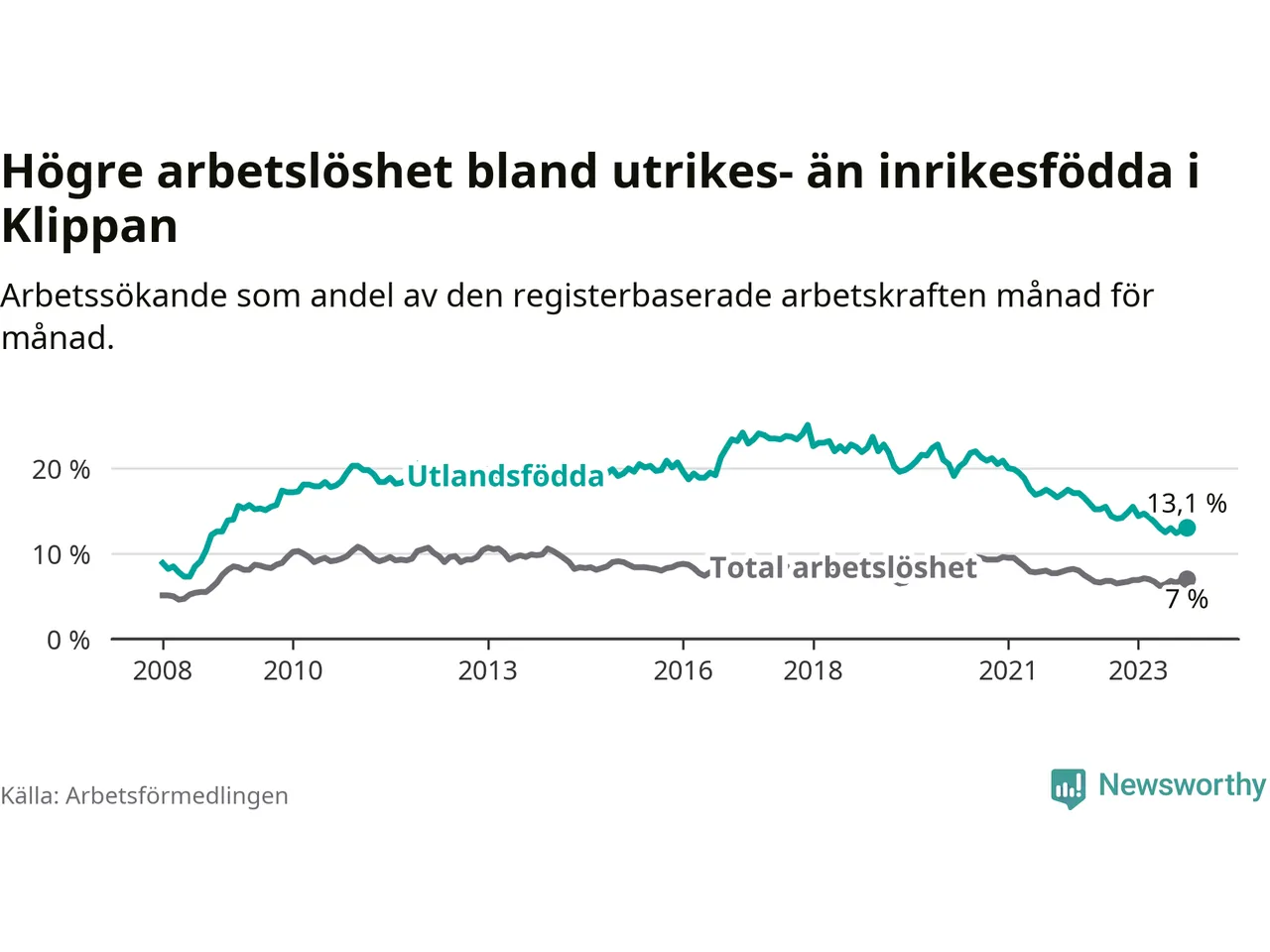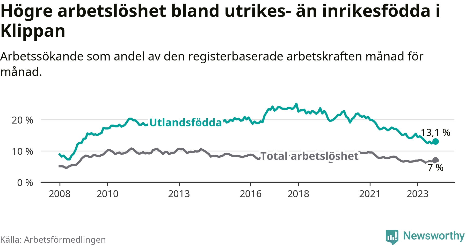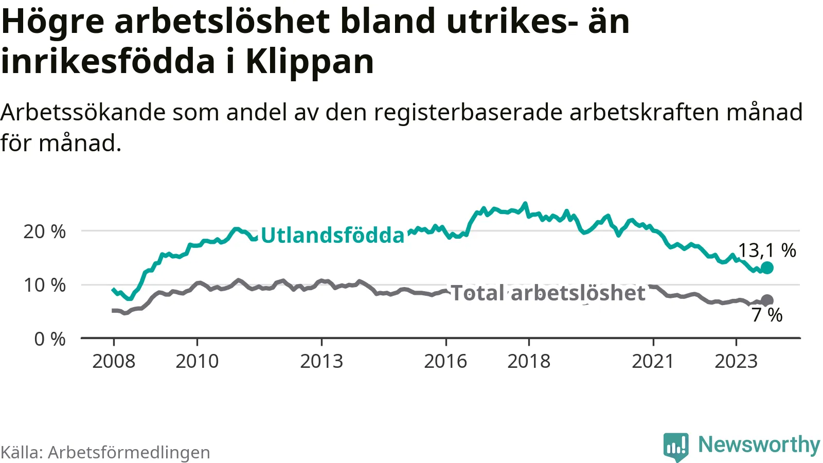 Läs mer om arbetslösheten bland utlandsfödda längre ner i den här texten.