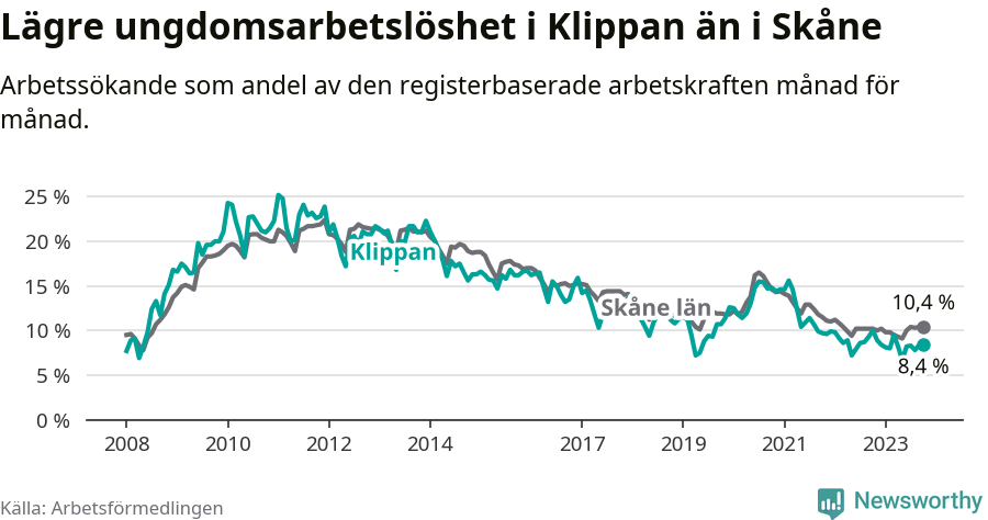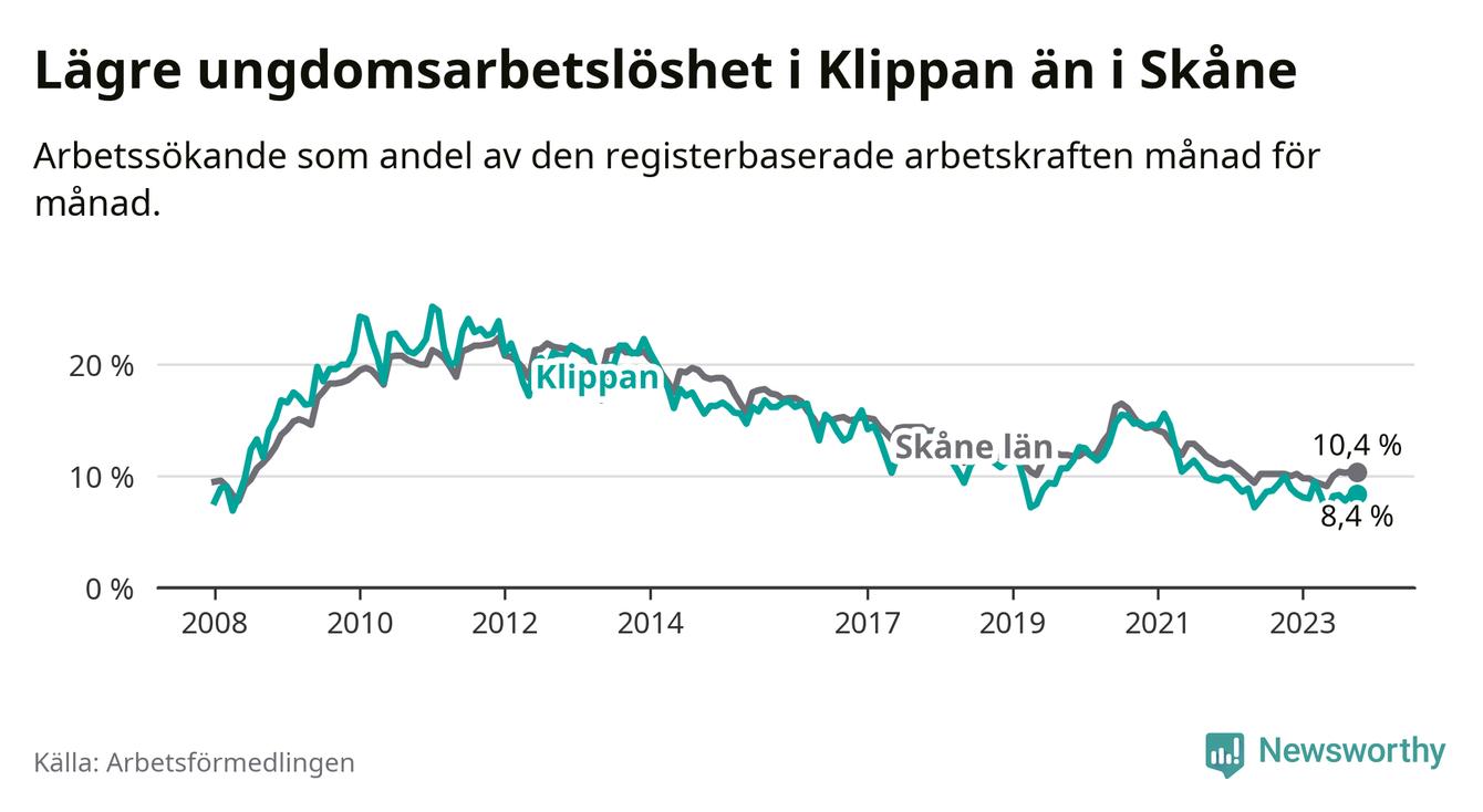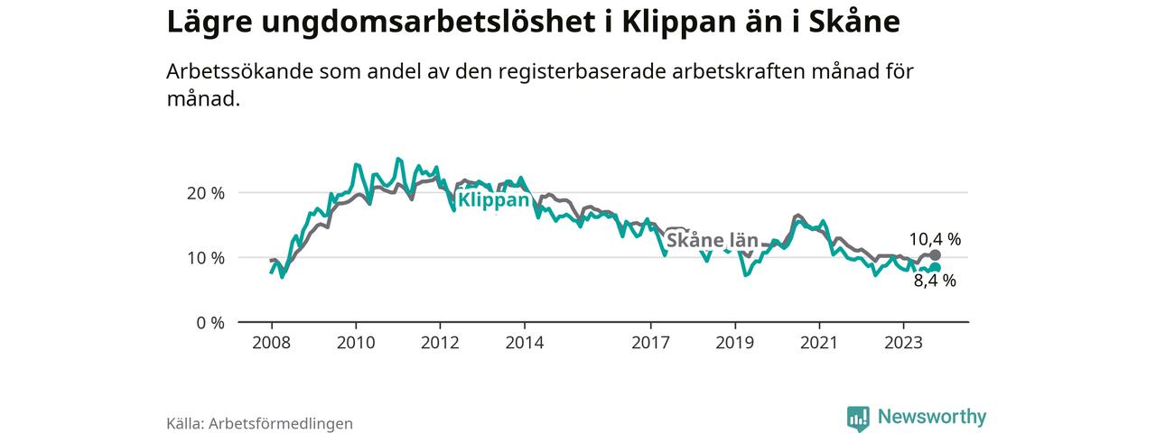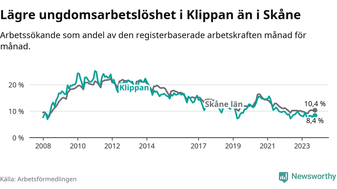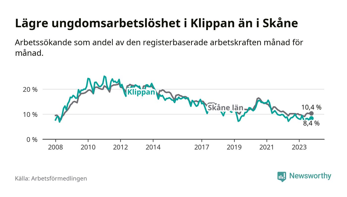 Precis som den totala arbetslösheten ligger ungdomsarbetslösheten i Klippan lägre än i Skåne som helhet. Skillnaden mellan kommunen och länet är 2,0 procentenheter.