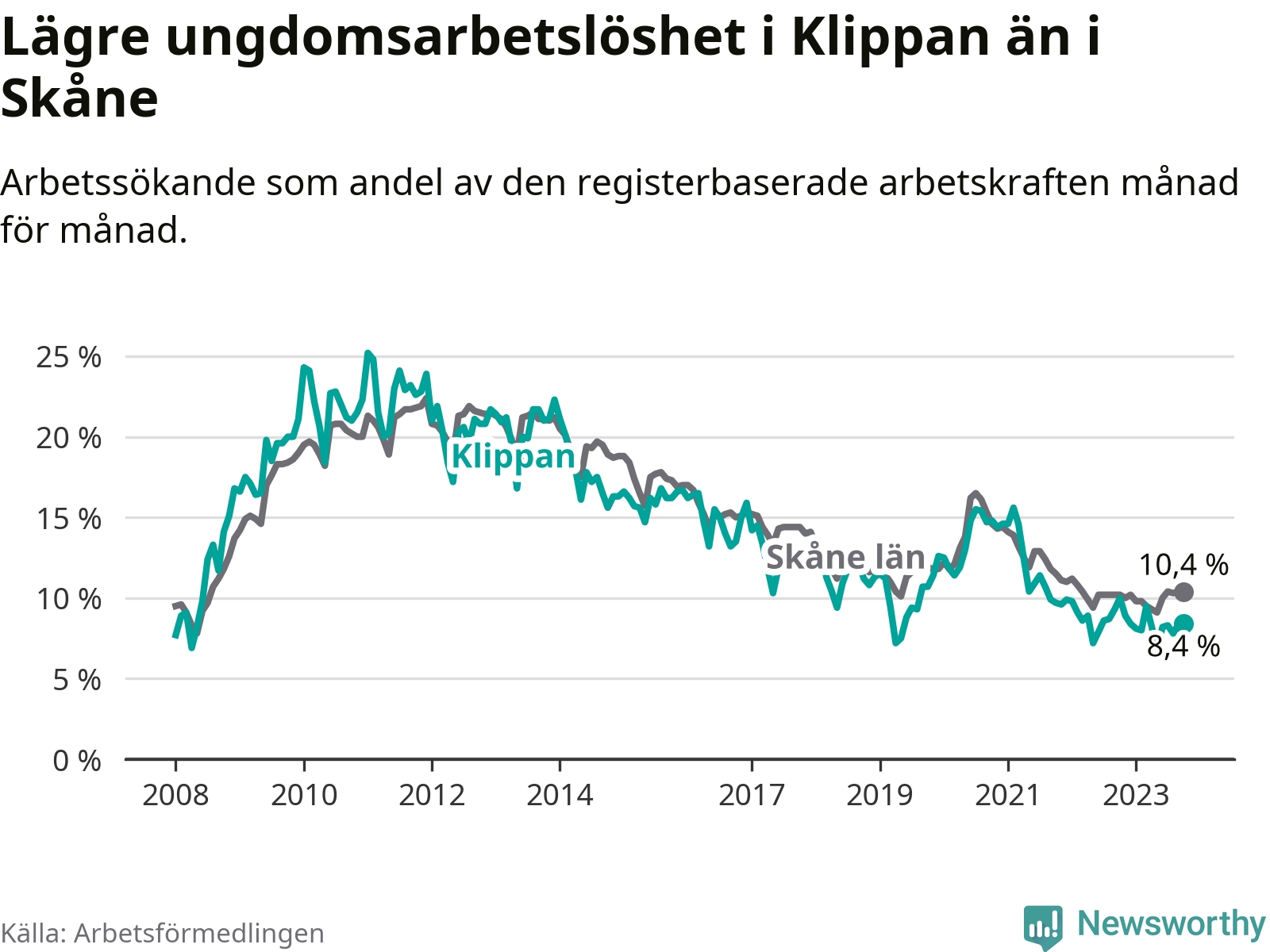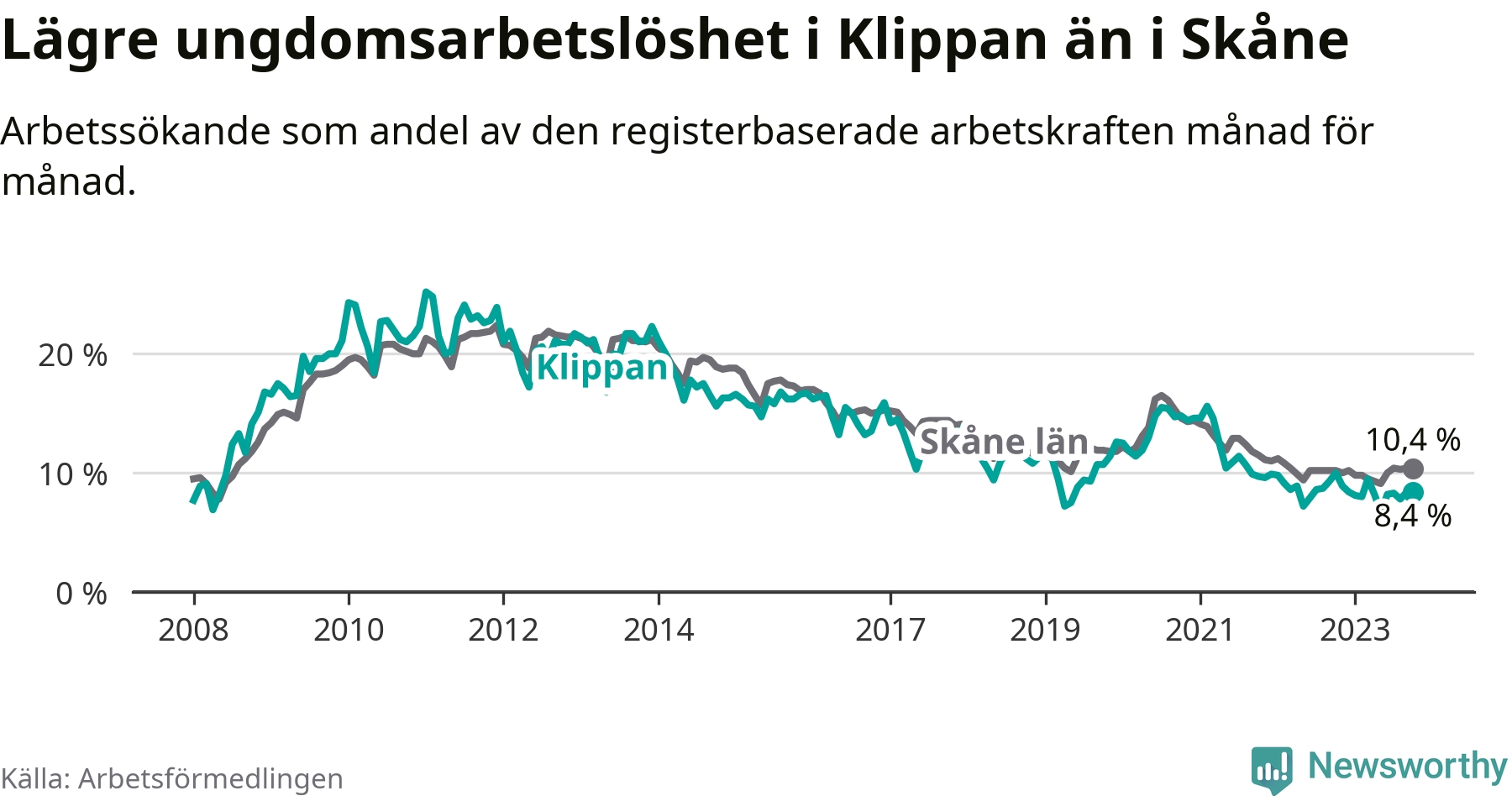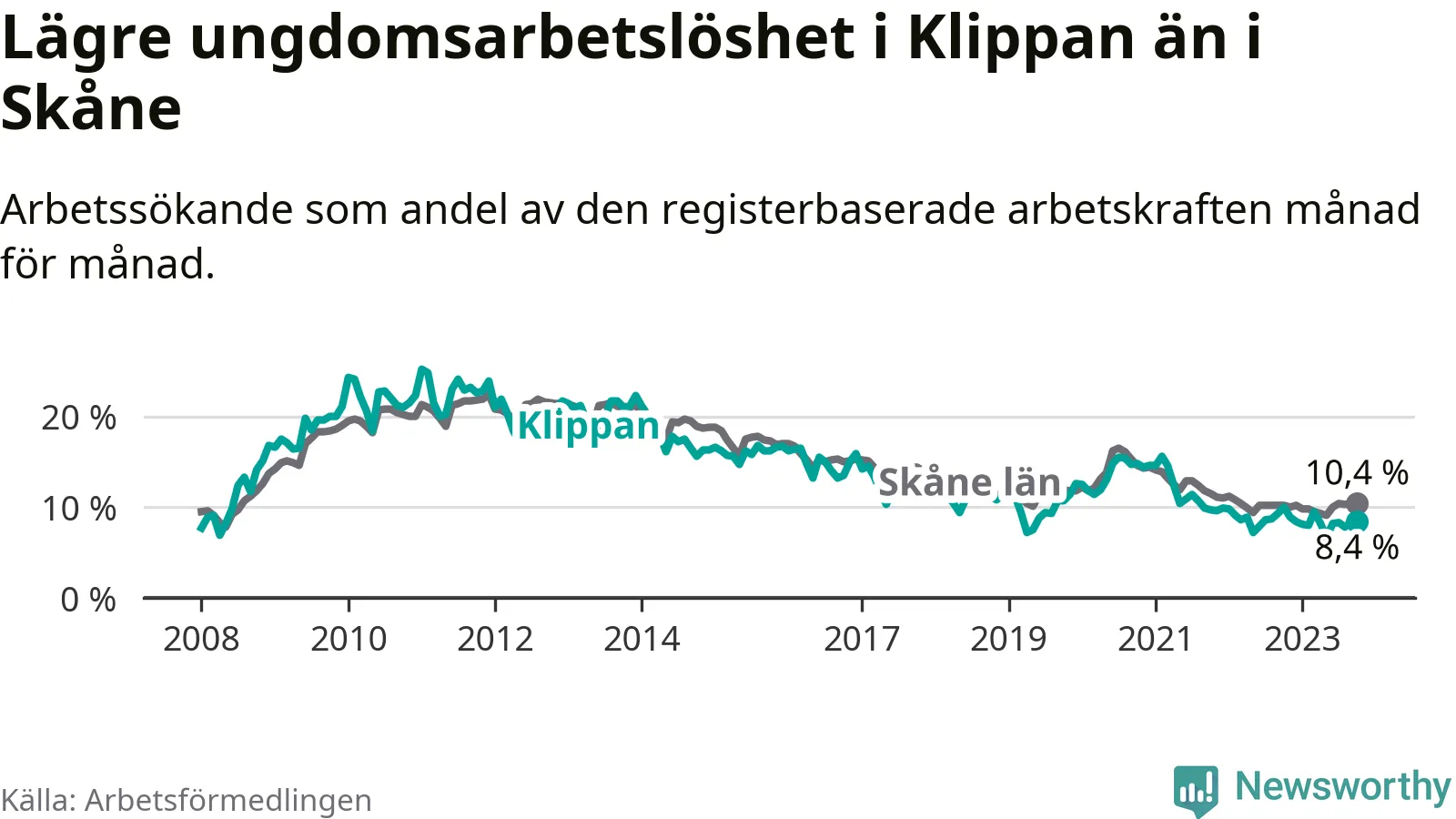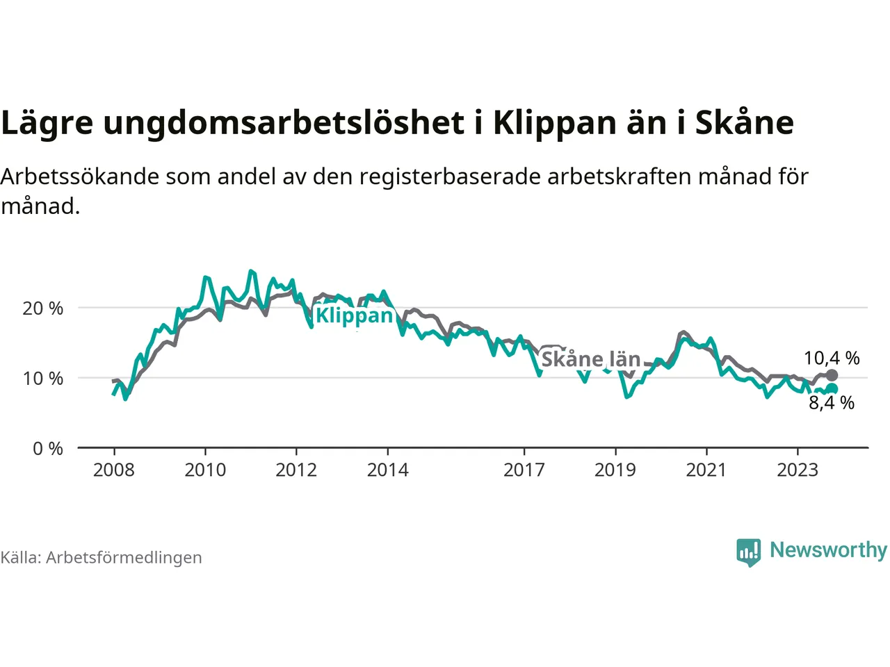 Precis som den totala arbetslösheten ligger ungdomsarbetslösheten i Klippan lägre än i Skåne som helhet. Skillnaden mellan kommunen och länet är 2,0 procentenheter.