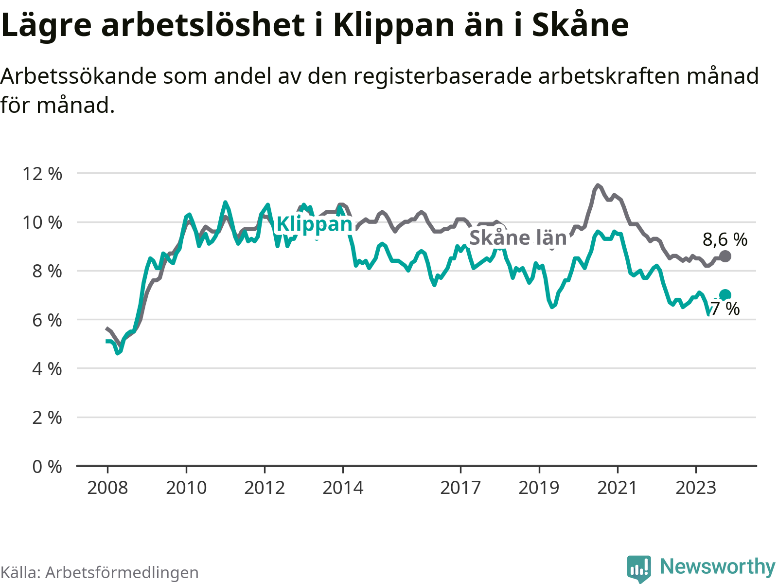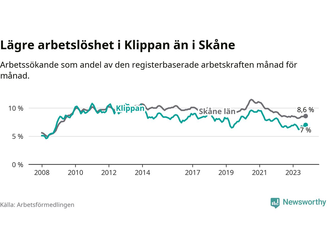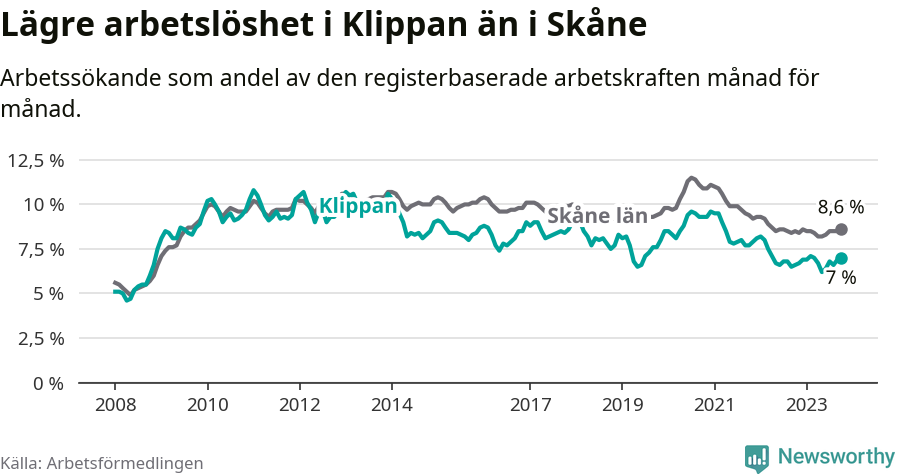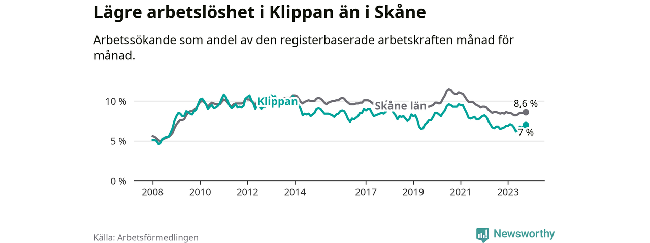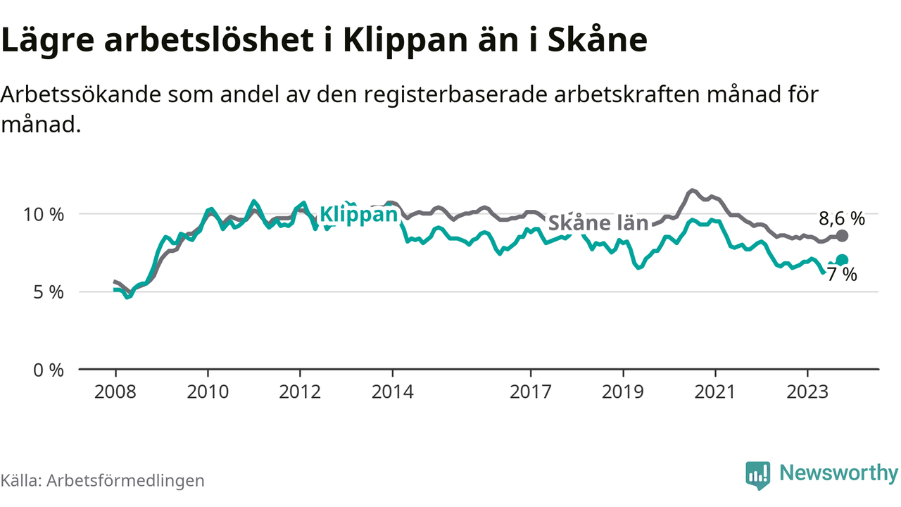 Graf: Arbetslöshet i Klippans kommun och Skåne län