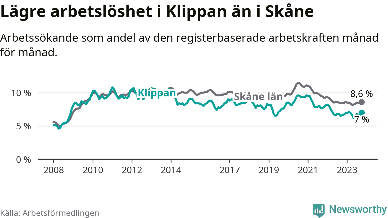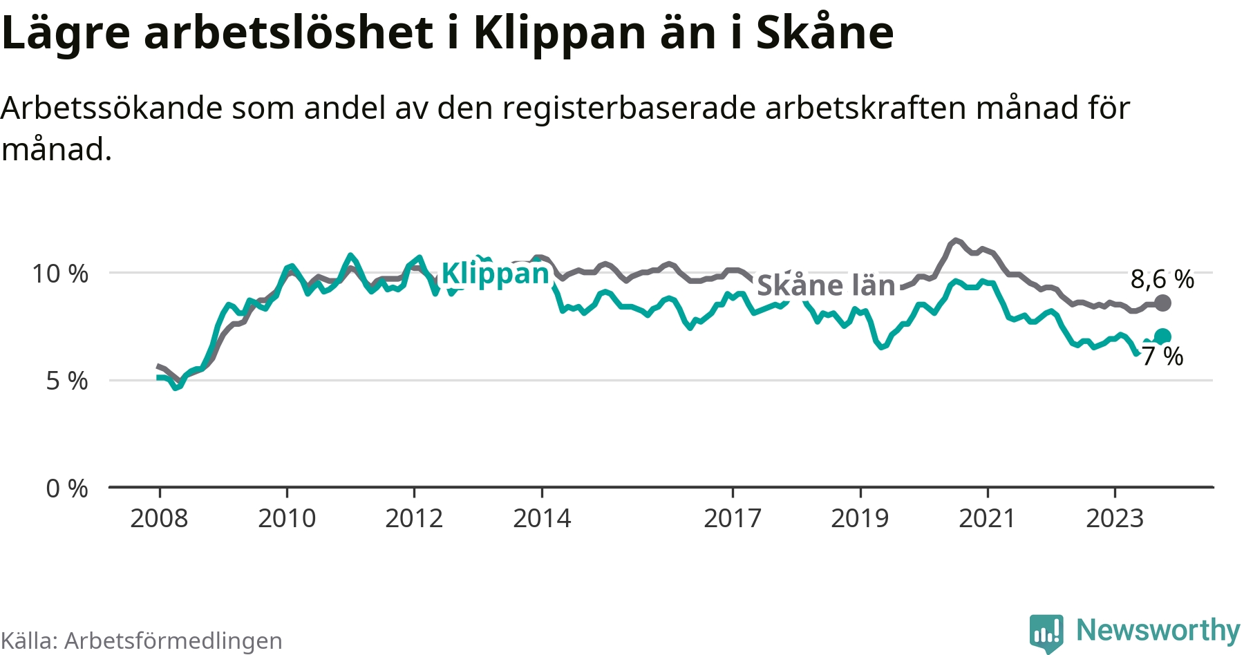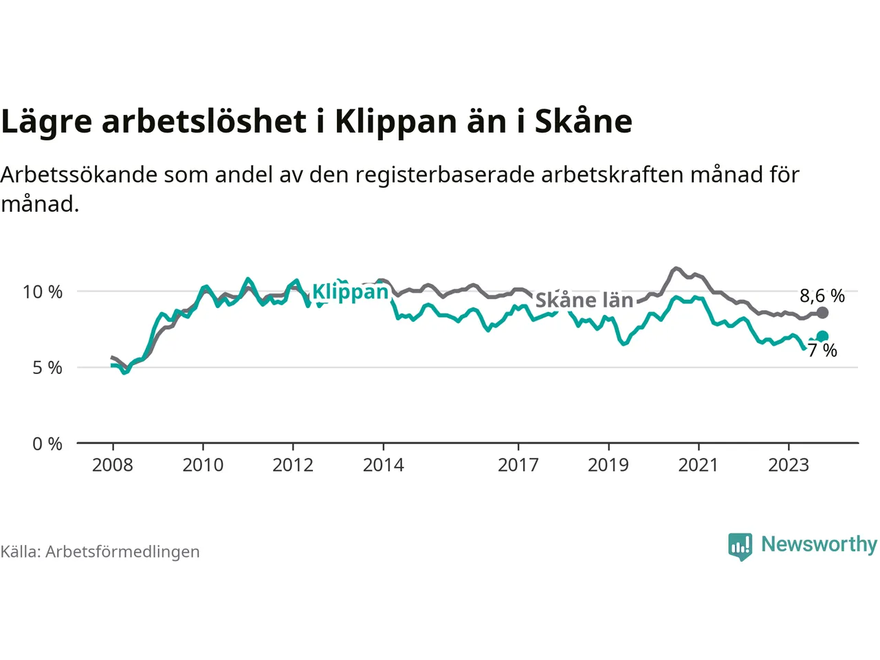 Graf: Arbetslöshet i Klippans kommun och Skåne län