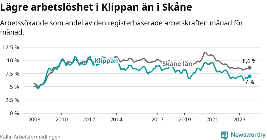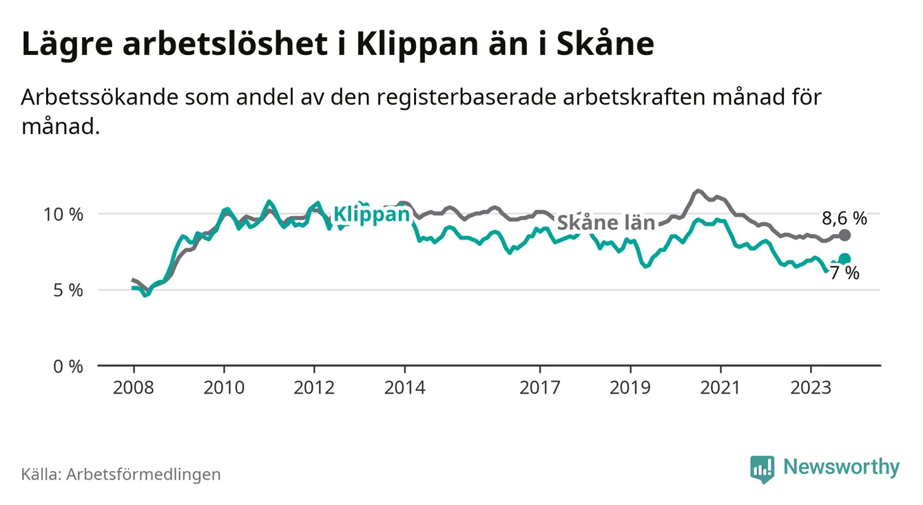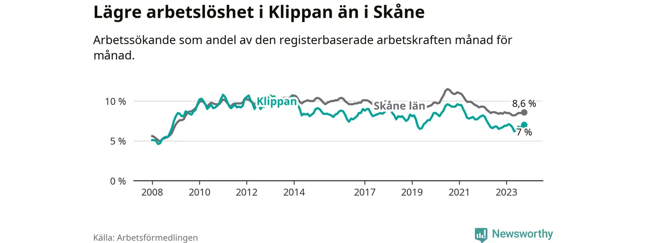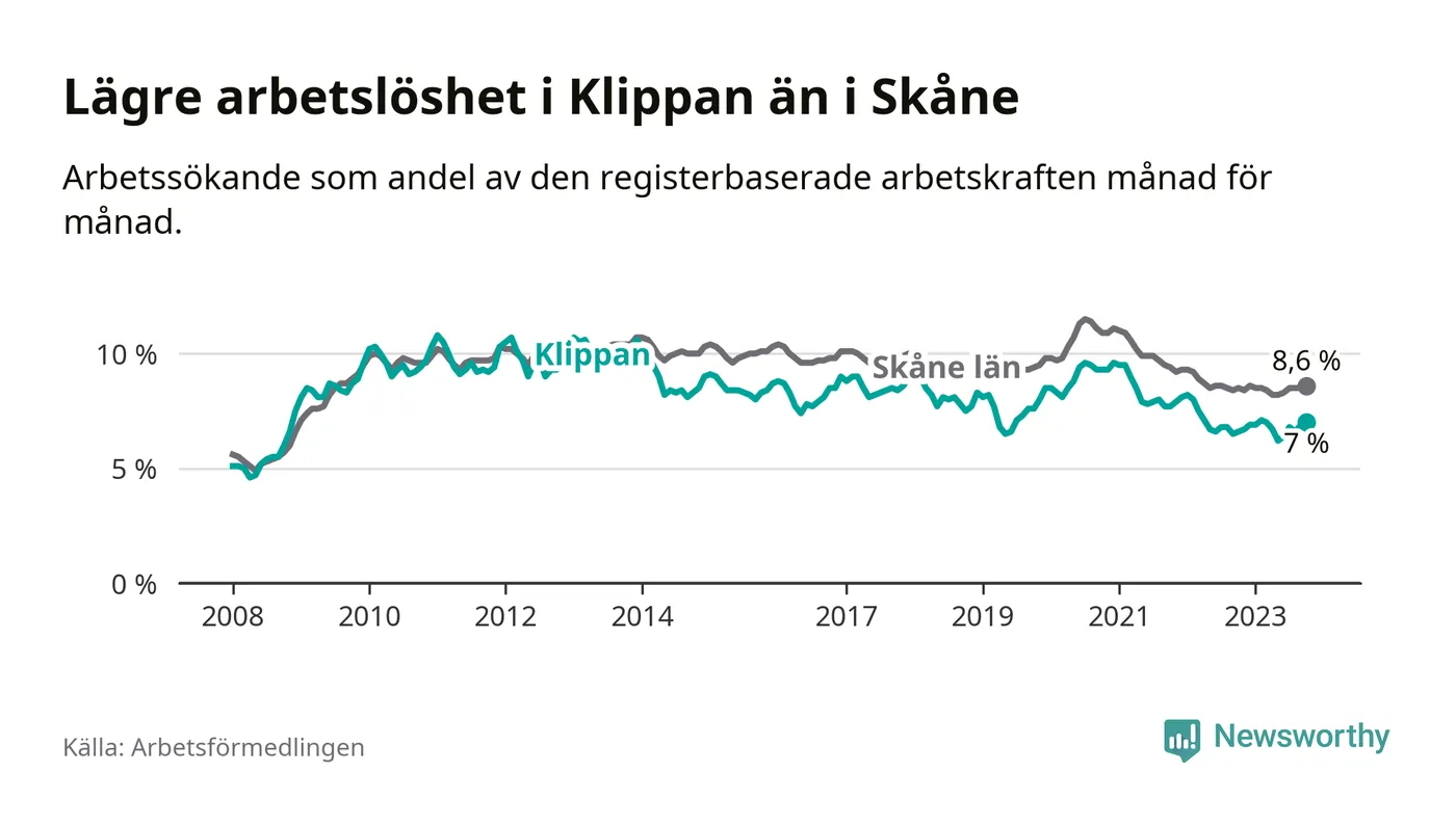 Även om arbetslösheten i Klippan alltså ökar, så ligger den fortfarande under snittet i hela Skåne län (7,0 procent i kommunen, jämfört med 8,6 procent i hela länet). Vellinge har den lägsta arbetslösheten i länet (3,3 procent), medan Malmö har den högsta (12,3 procent). För att Klippan skulle komma ner i samma arbetslöshetsnivå som Vellinge skulle 315 personer behöva sysselsättas.