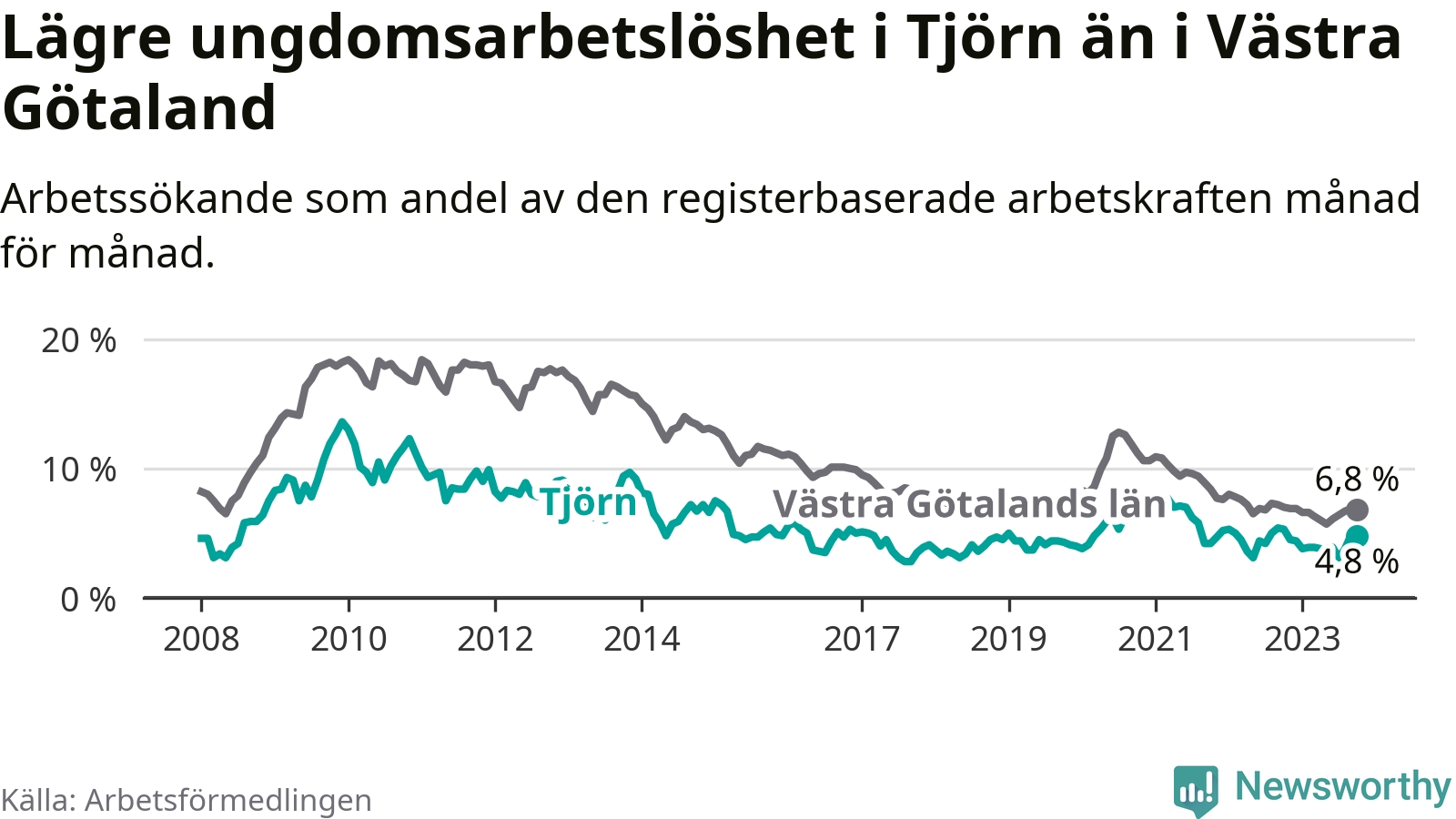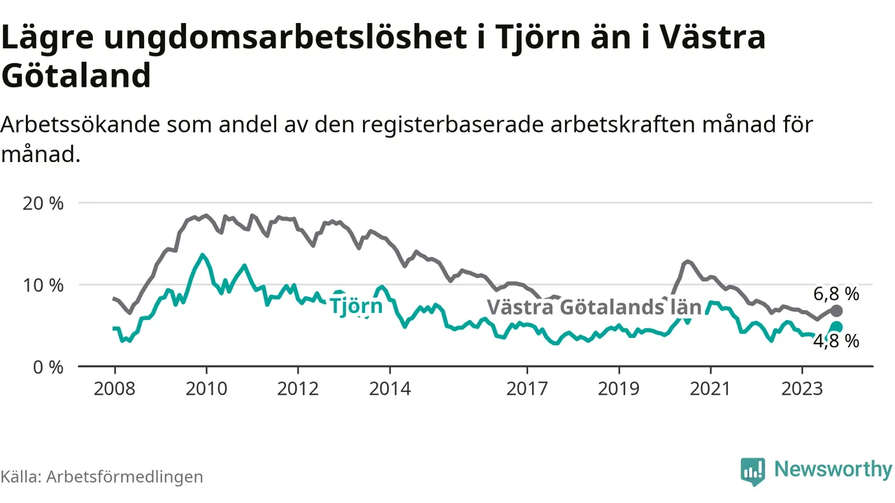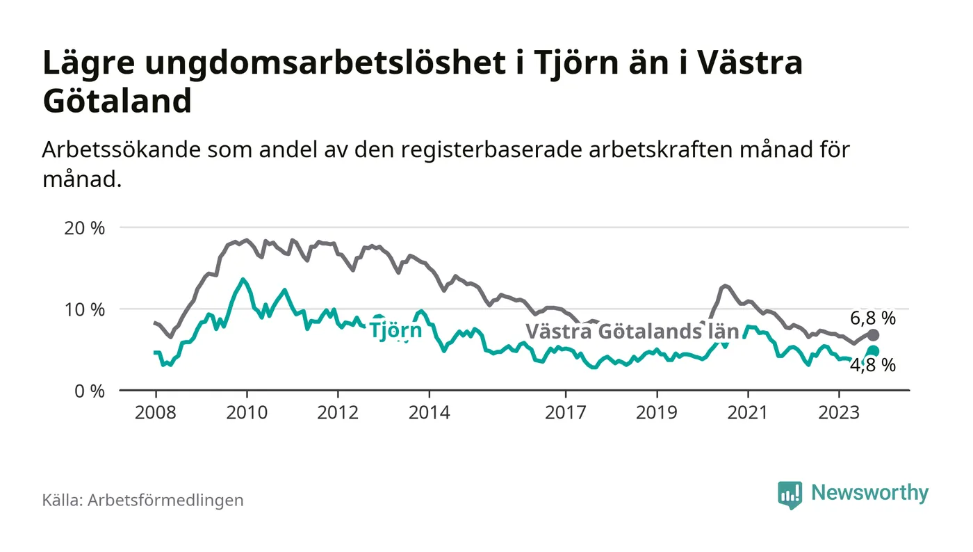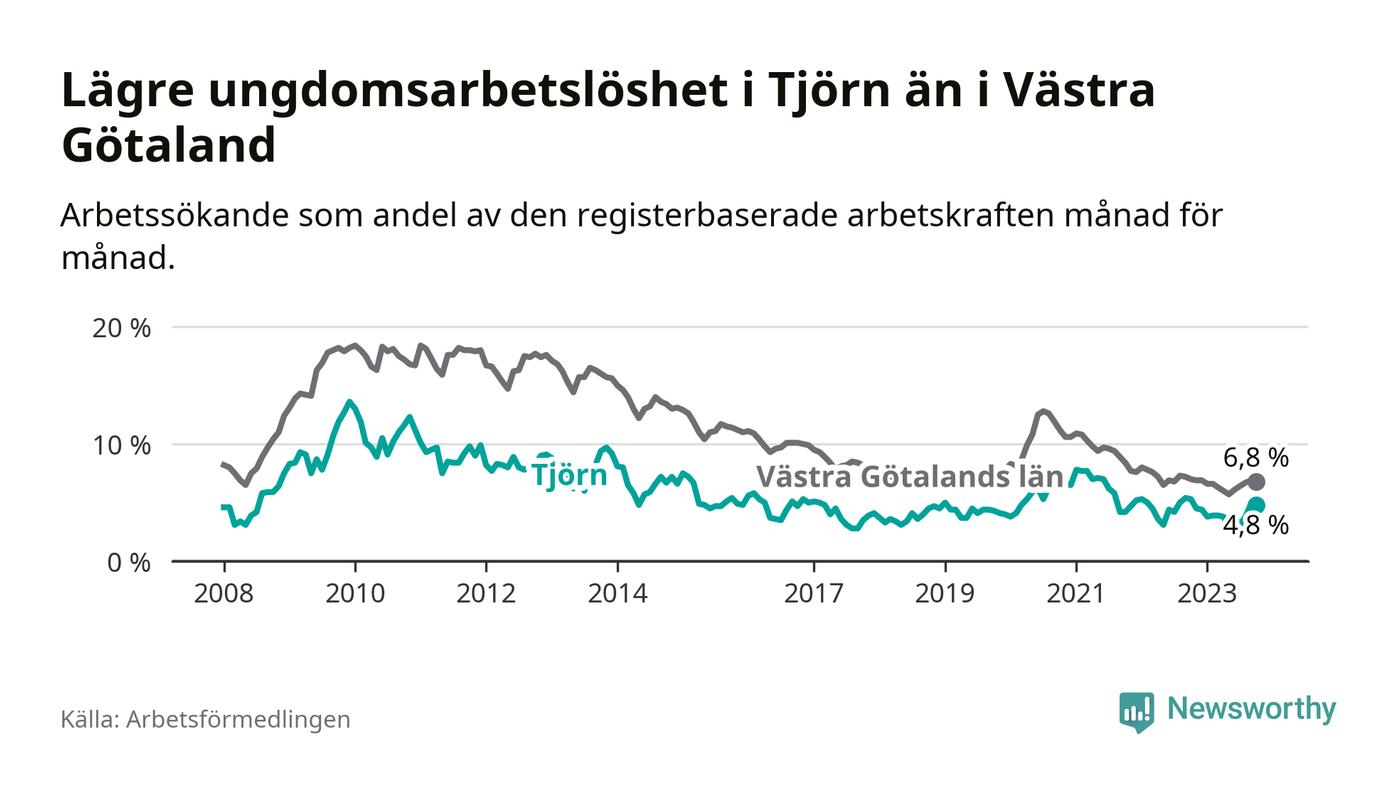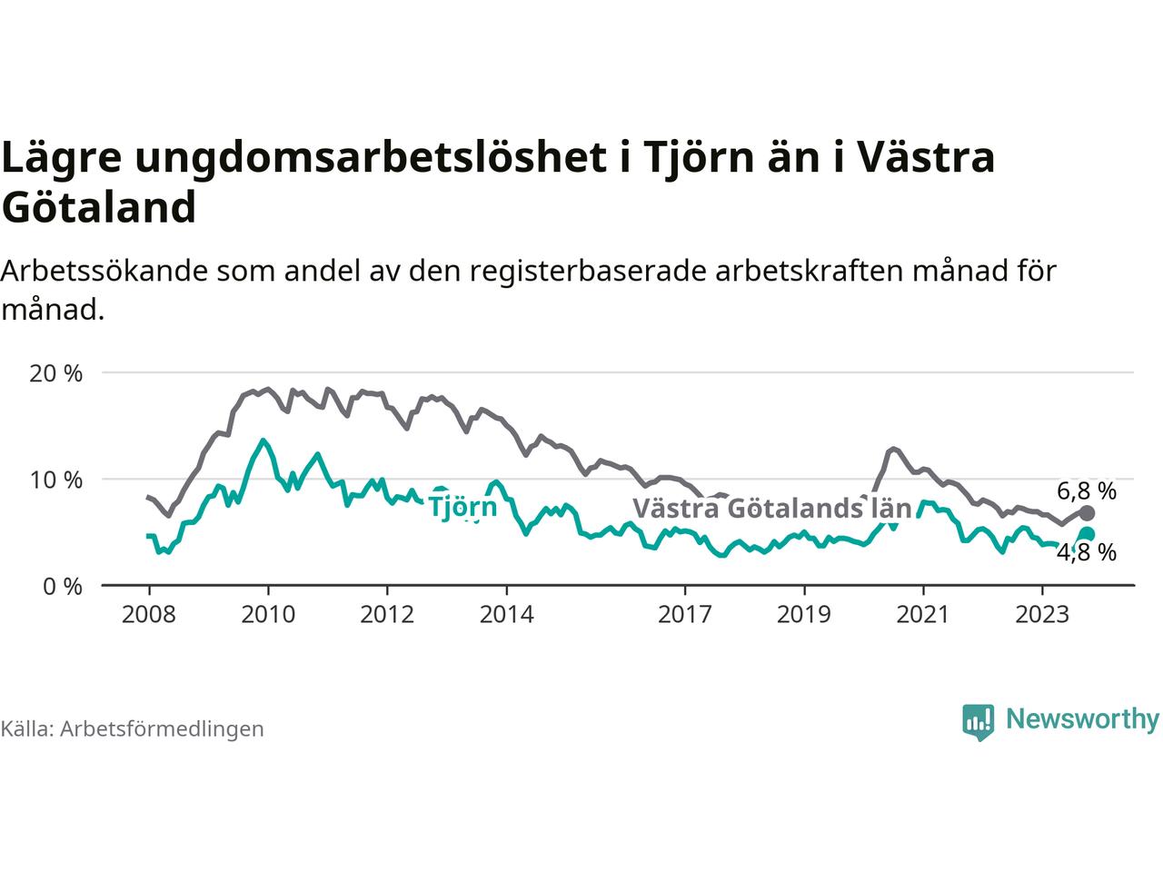 Graf: Arbetslöshet bland unga i Tjörns kommun och Västra Götalands län