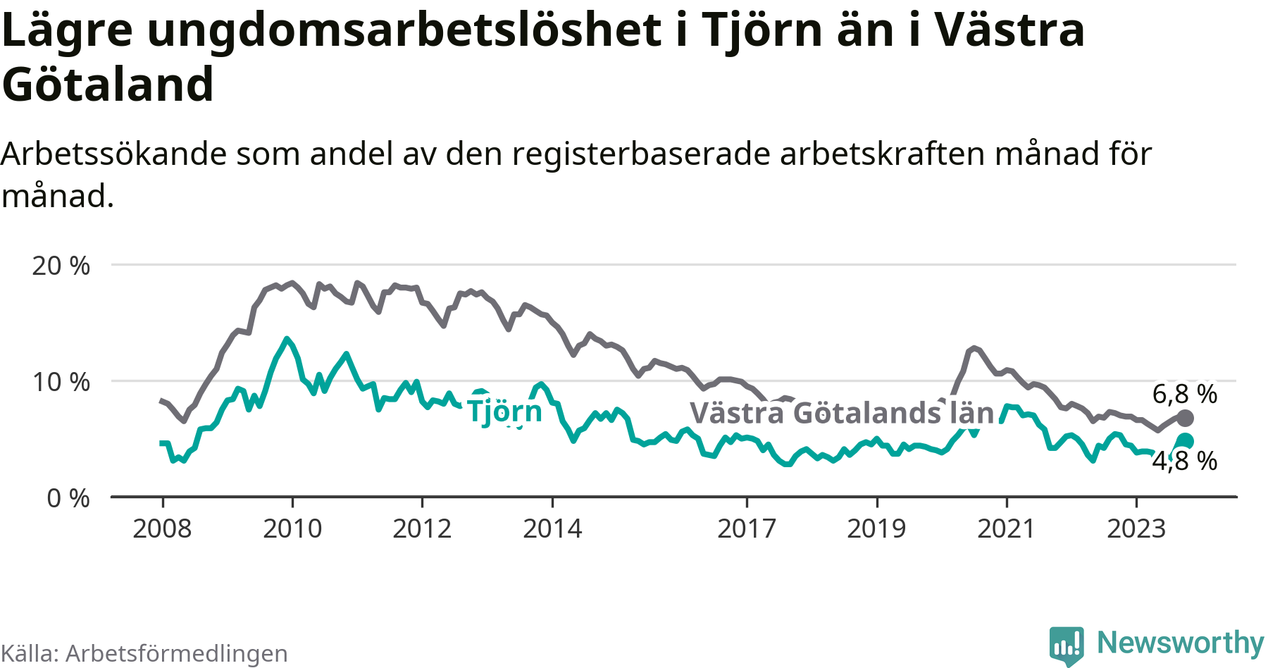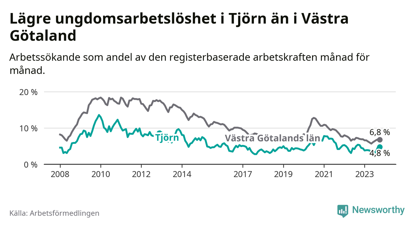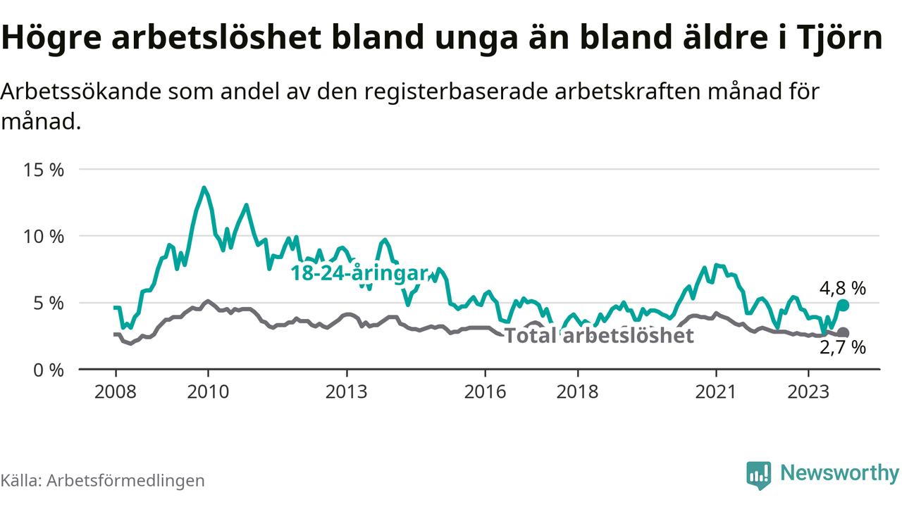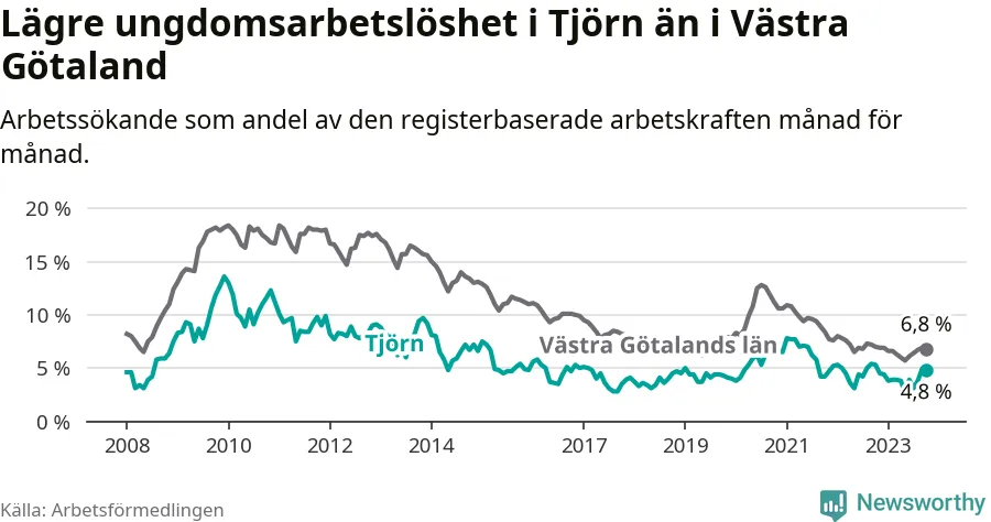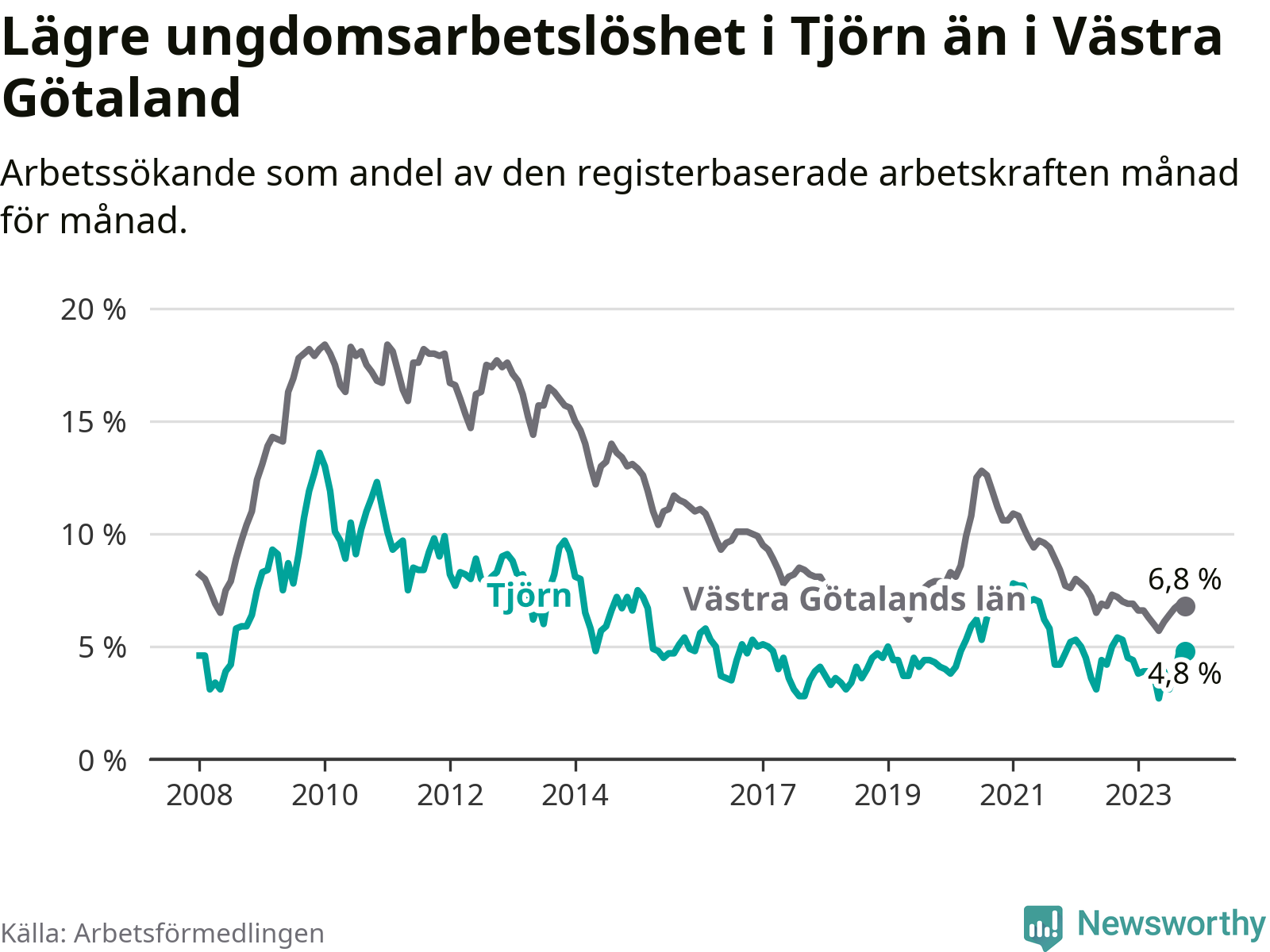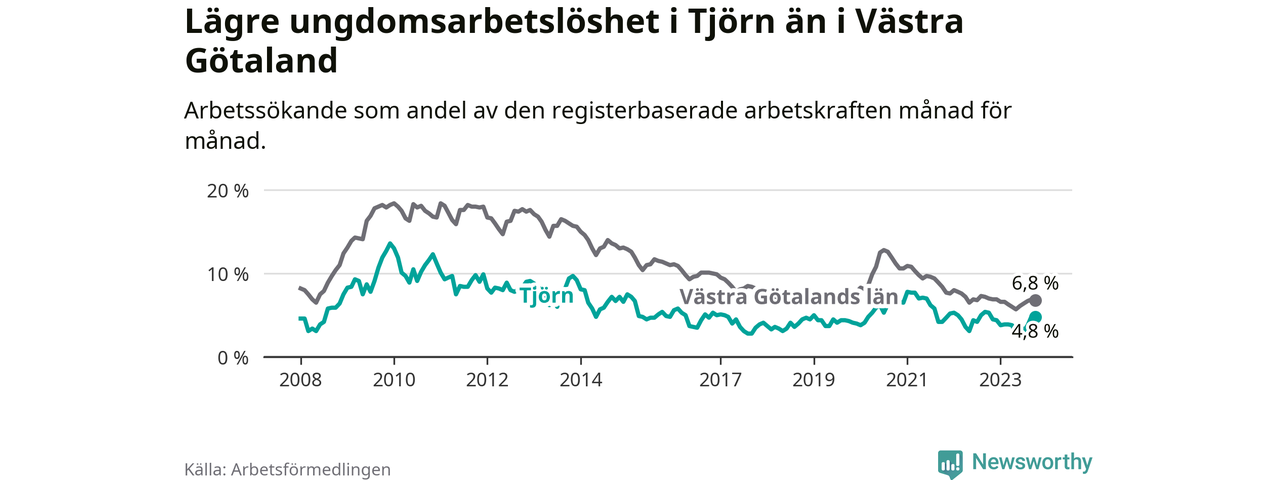 Graf: Arbetslöshet bland unga i Tjörns kommun och Västra Götalands län