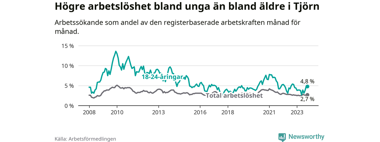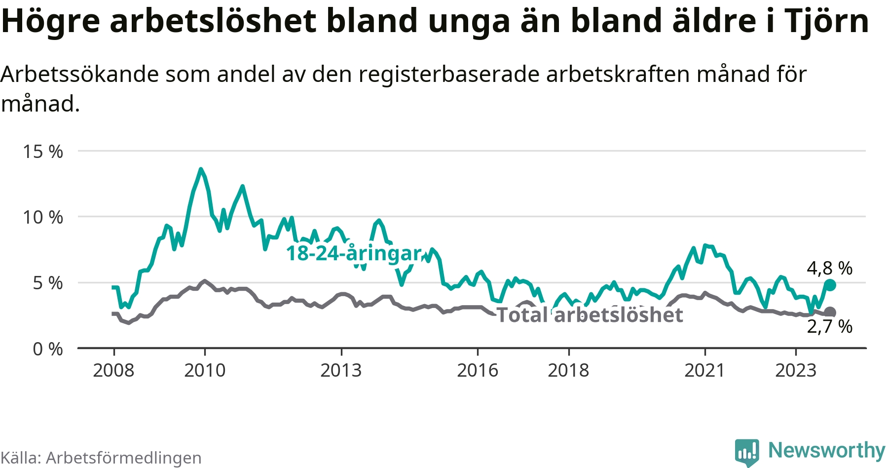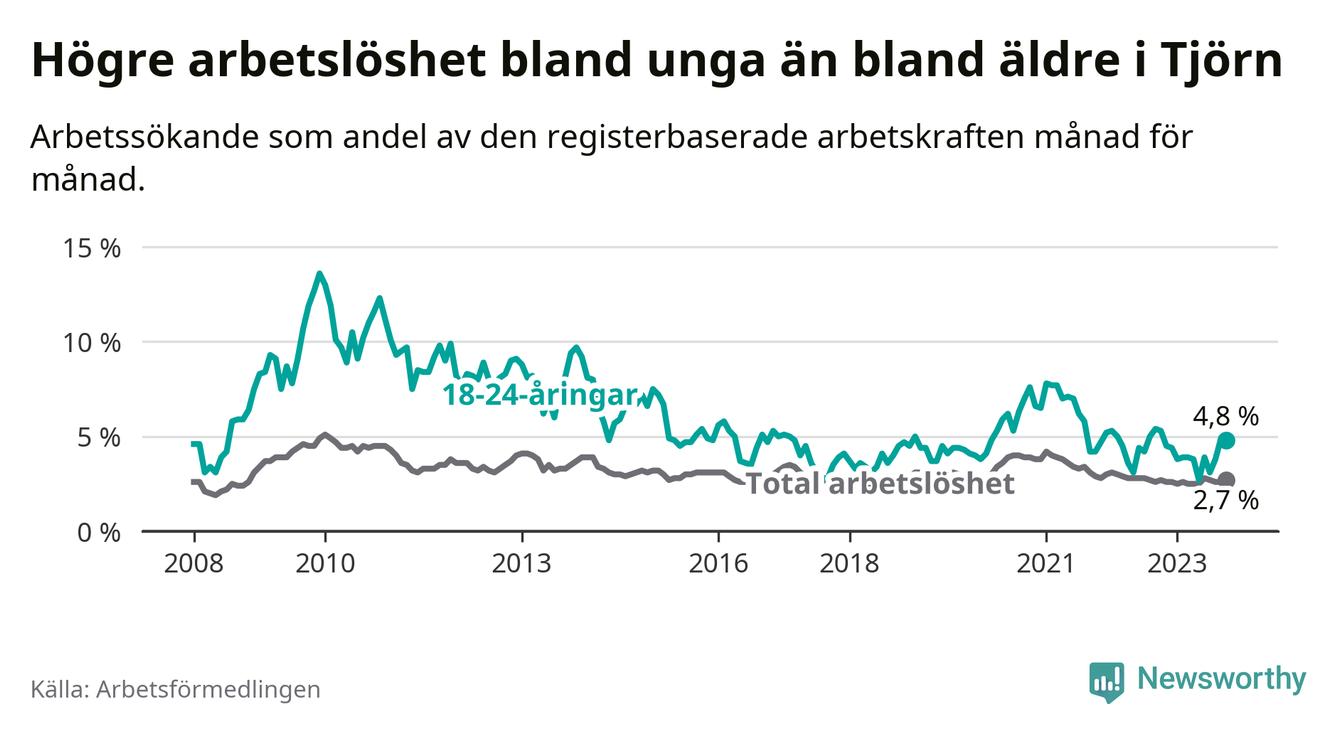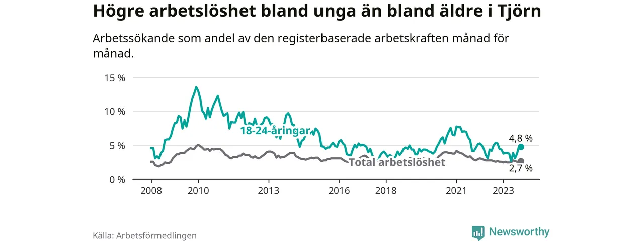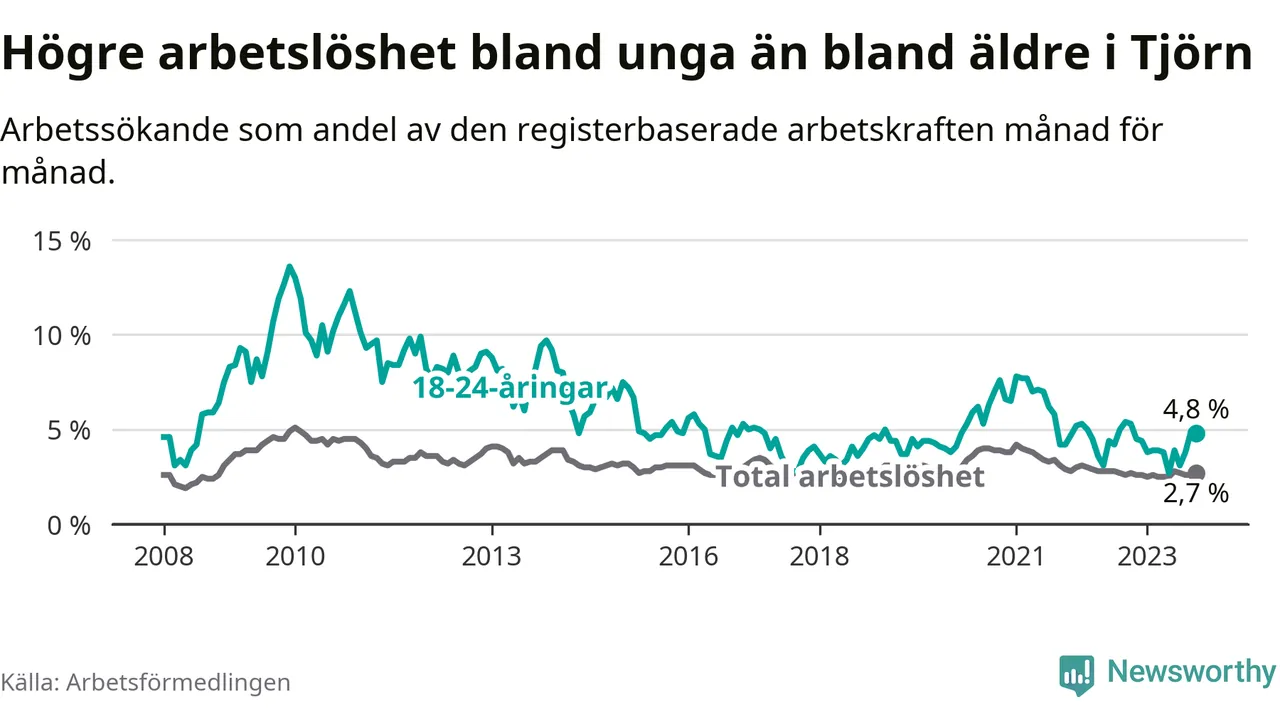Graf: Arbetslöshet bland unga i Tjörns kommun och Västra Götalands län