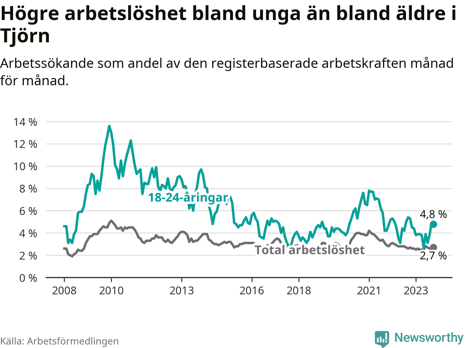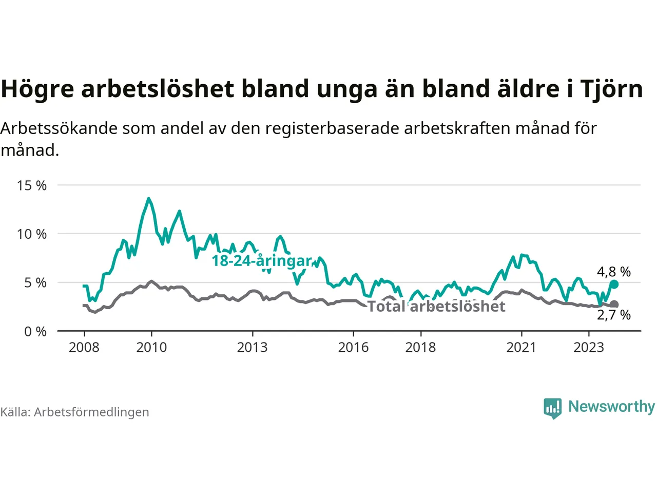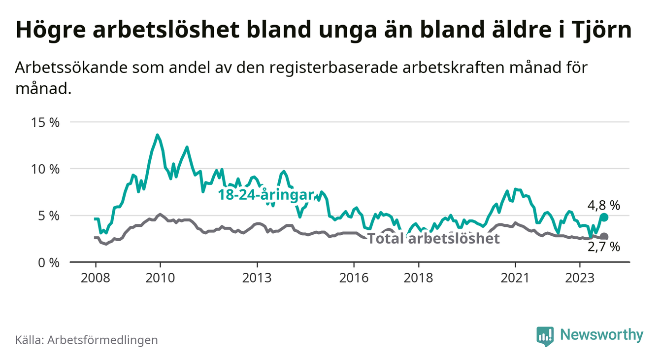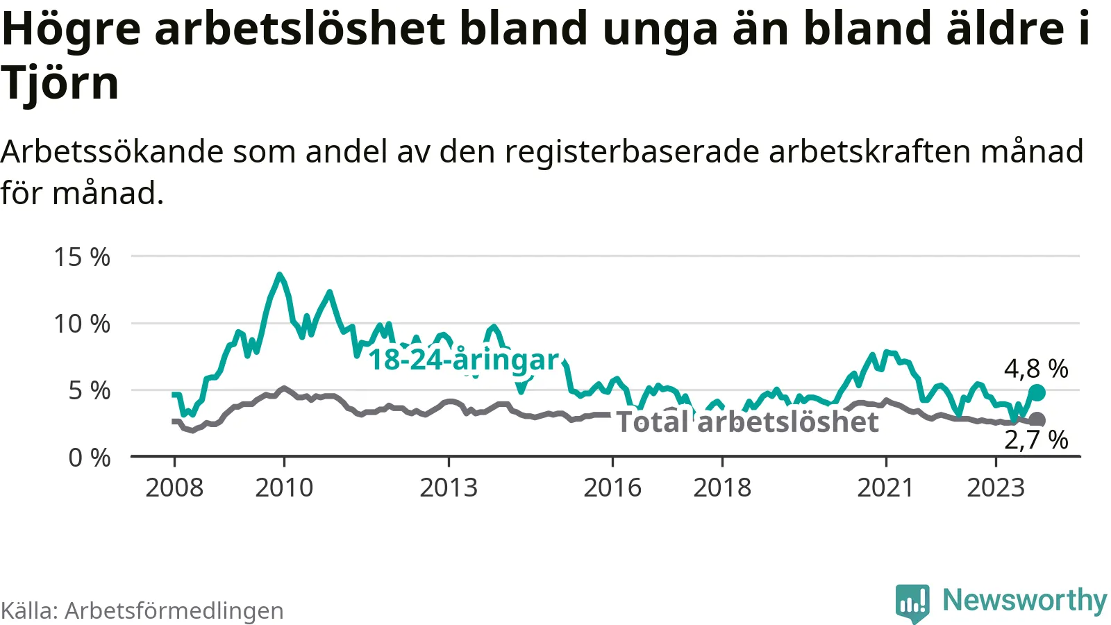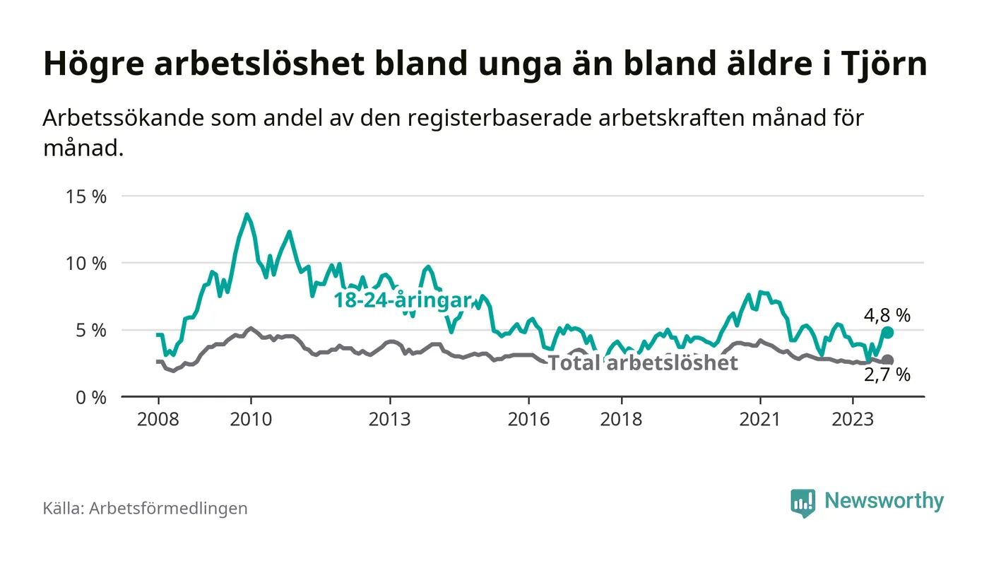 Graf: Arbetslöshet bland unga i Tjörns kommun och Västra Götalands län