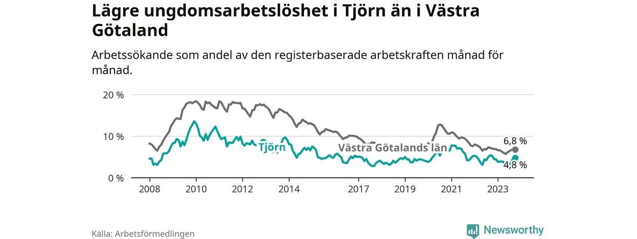 Precis som den totala arbetslösheten ligger ungdomsarbetslösheten på Tjörn lägre än i Västra Götaland som helhet. Skillnaden mellan kommunen och länet är 2,0 procentenheter.