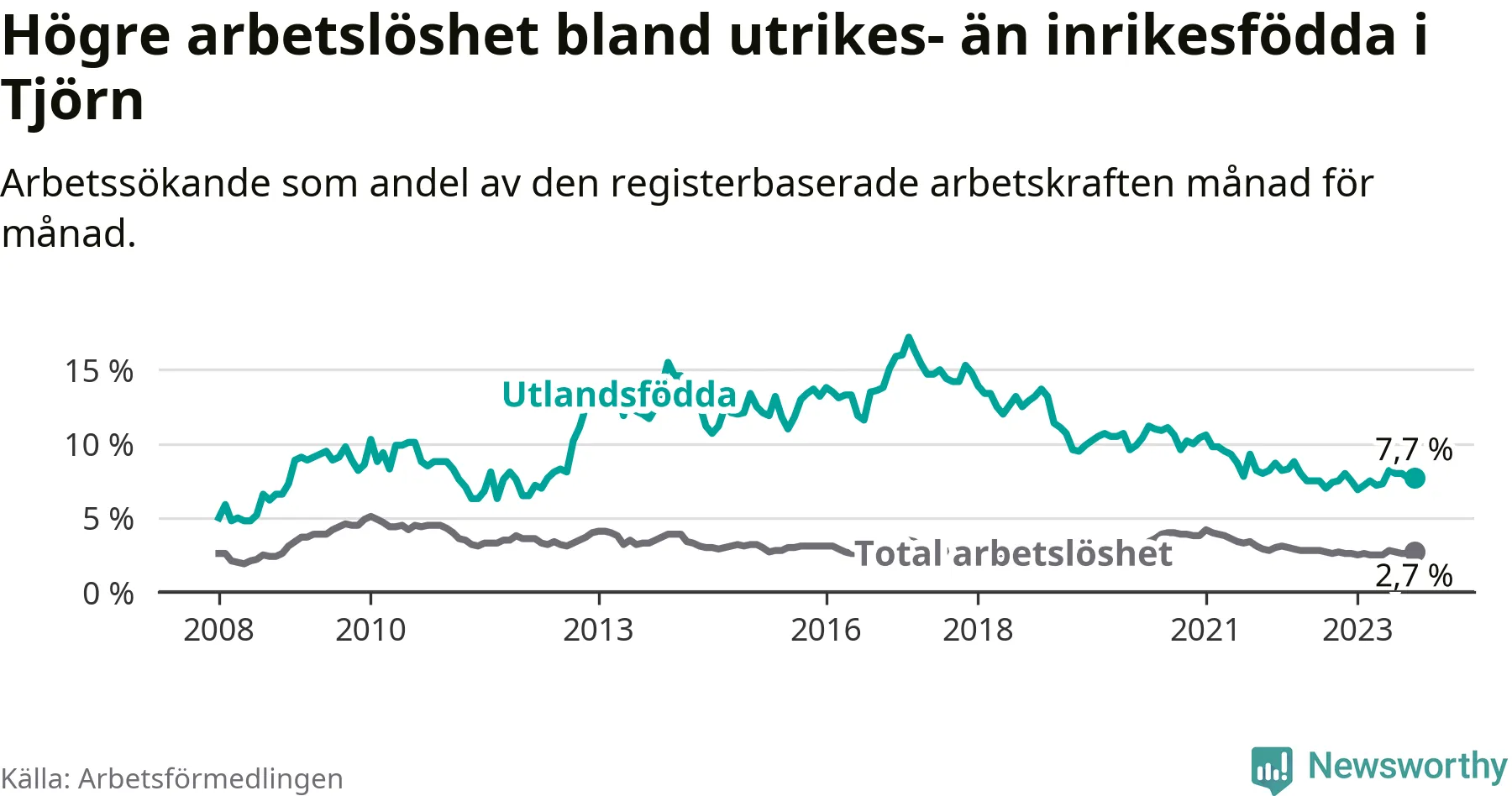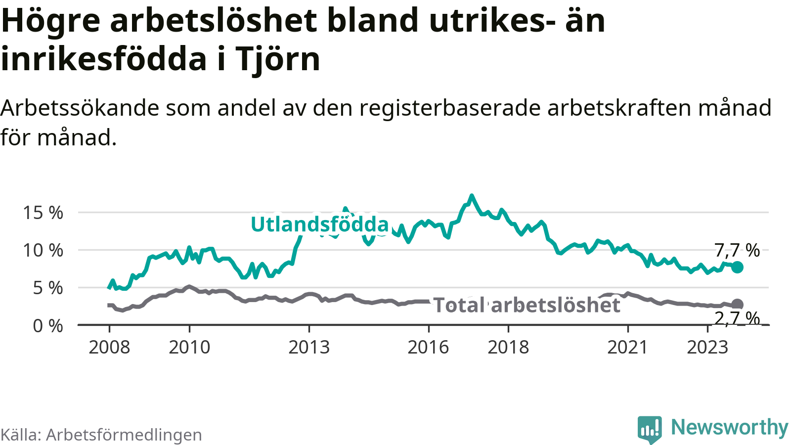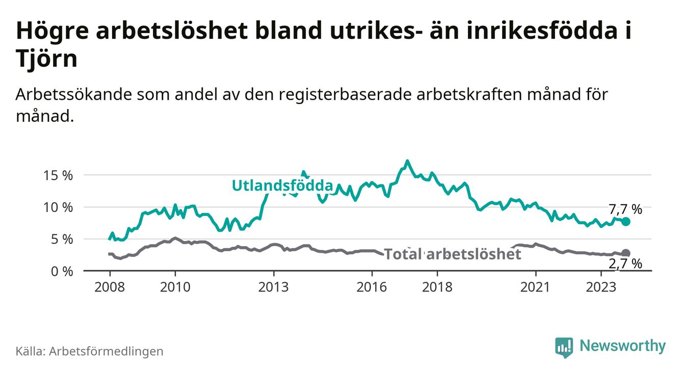 Den här skillnaden i arbetslöshet mellan inrikes- och utrikesfödda är förhållandevis stor på Tjörn om man jämför med andra kommuner i Västra Götaland. Lilla Edet har, relativt sett, den minsta skillnaden i arbetslöshet mellan inrikes- och utrikes födda i länet. Öckerö har den största.