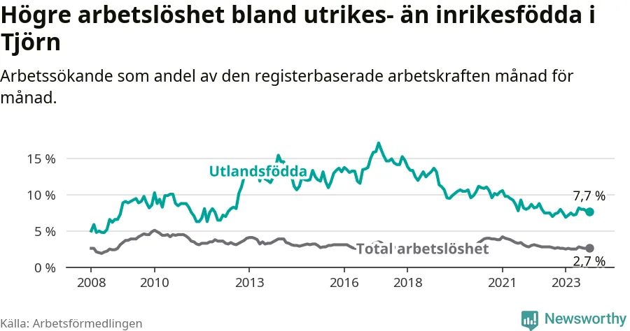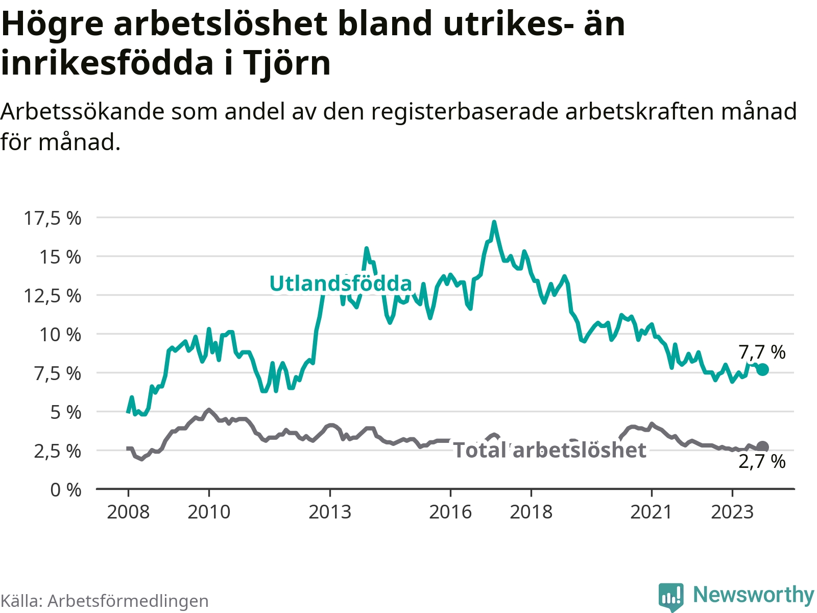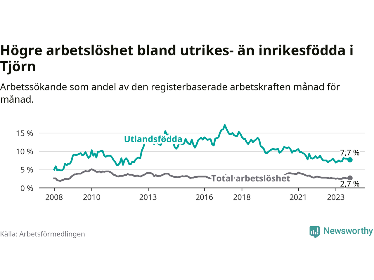Arbetslösheten bland utlandsfödda var 7,7 procent på Tjörn under oktober månad, motsvarande 65 av 844 personer. Det är 0,2 procentenheter fler än vid samma tidpunkt i fjol (+7 om man räknar personer).