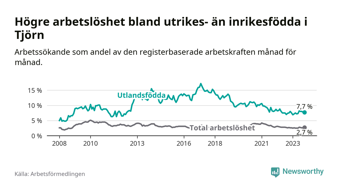 Graf: Skillnad i arbetslöshet mellan utrikesfödda och hela befolkningen i Tjörns kommun
