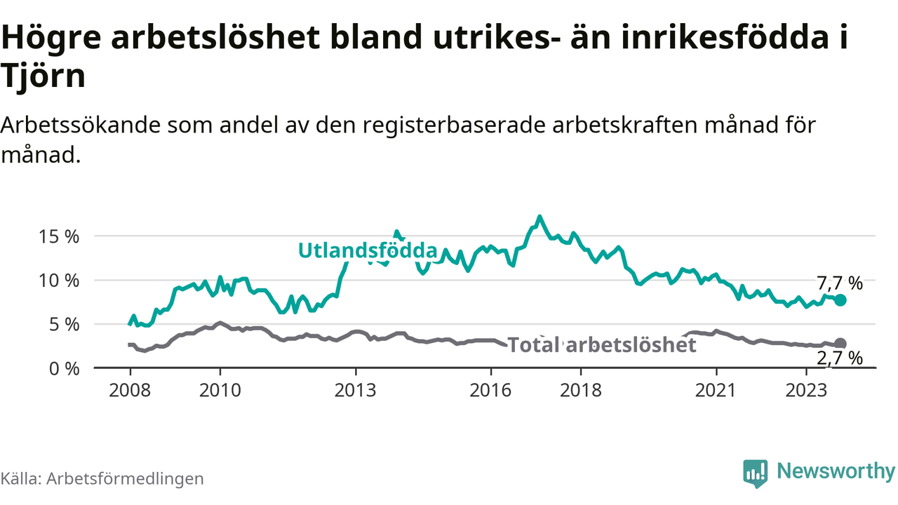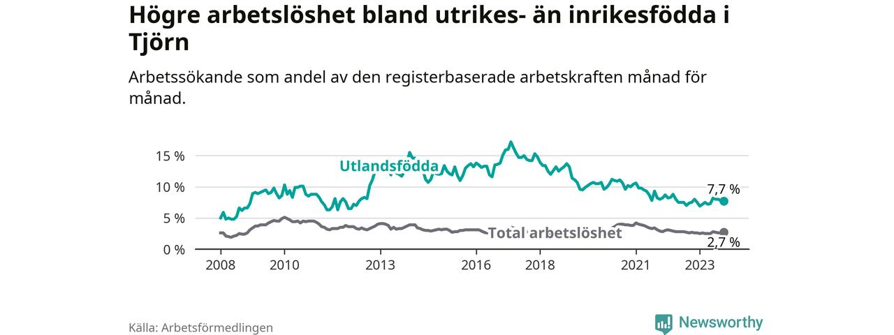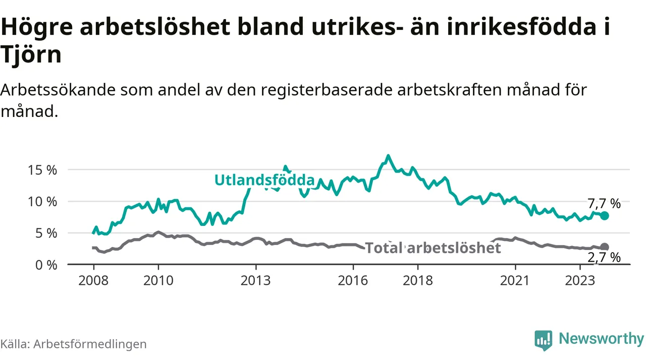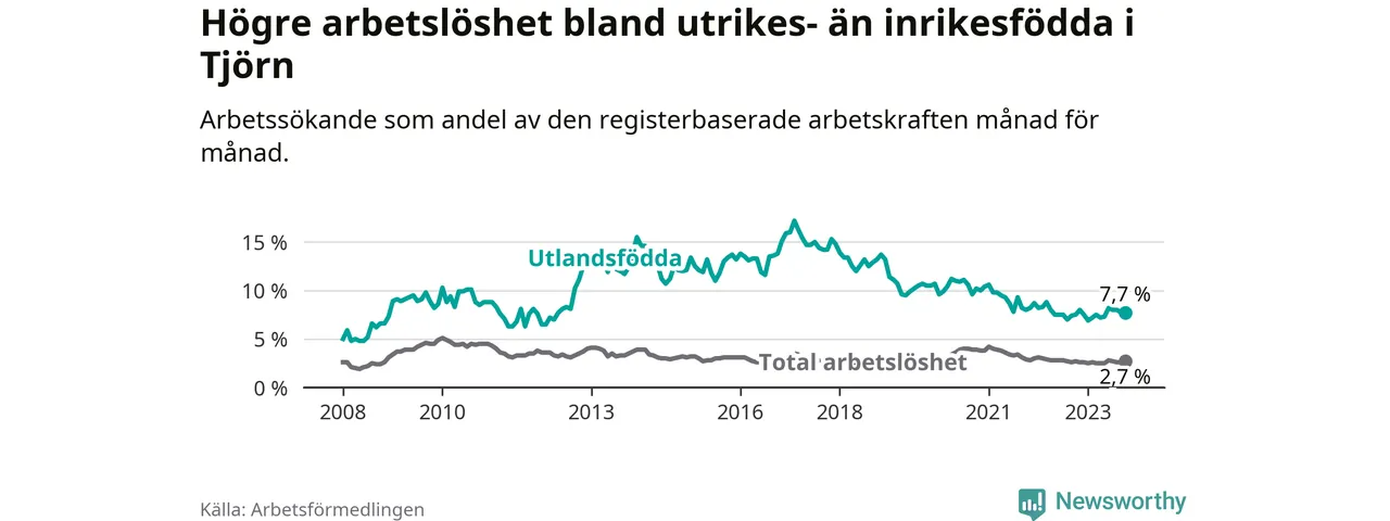 Skillnaden i arbetslöshet mellan utrikesfödda och hela befolkningen är 5,0 procentenheter på Tjörn.