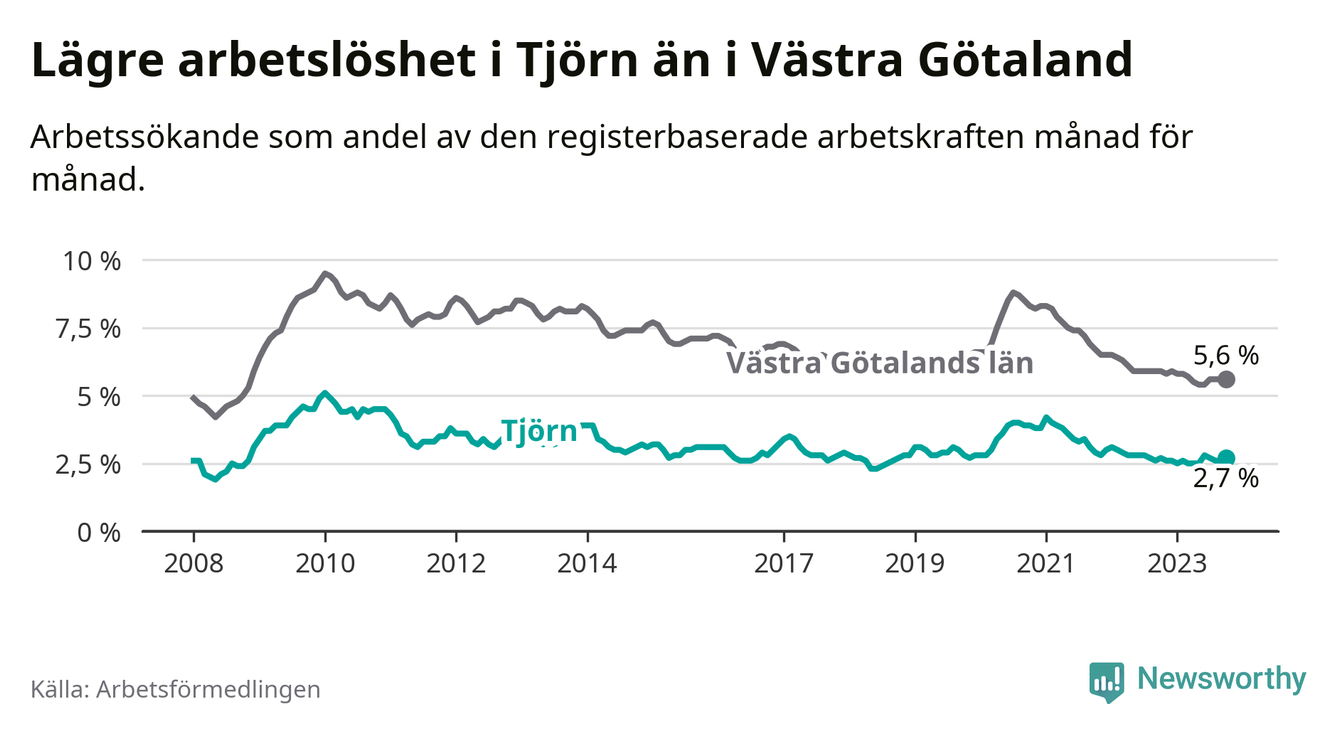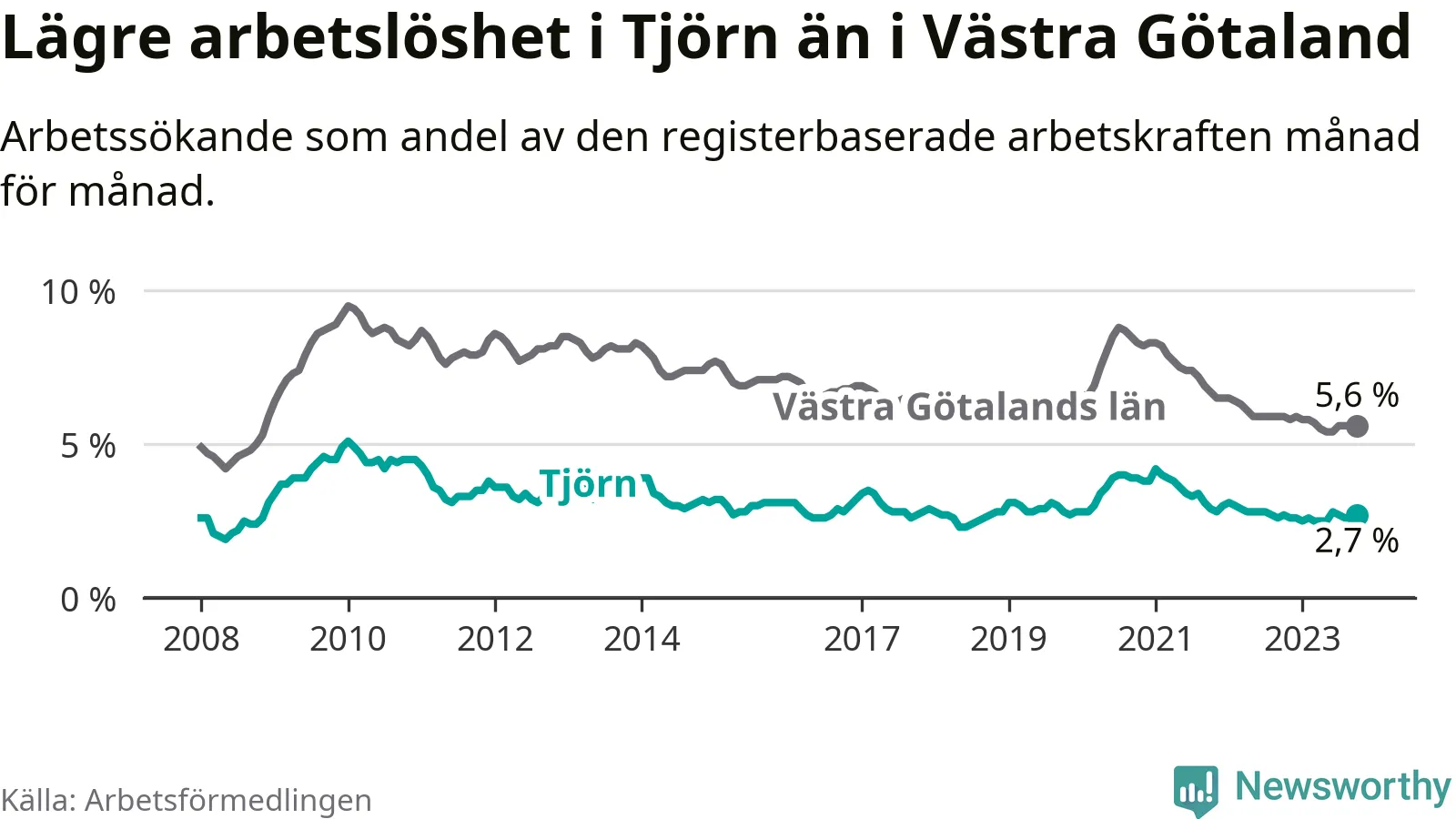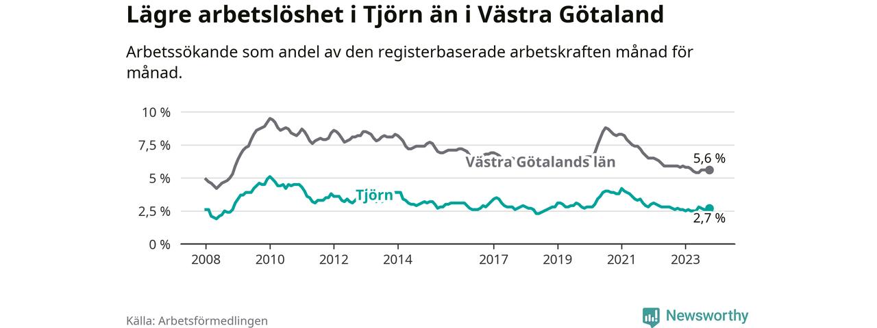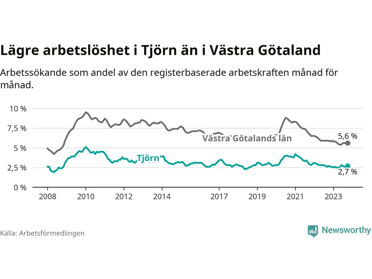 Under oktober månad rapporterade Tjörns kommun en total arbetslöshet på 2,7 procent. Det är i samma nivå som i oktober i fjol. I Västra Götalands län däremot sjunker arbetslösheten