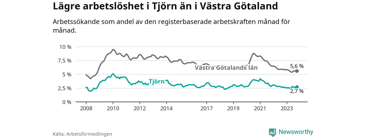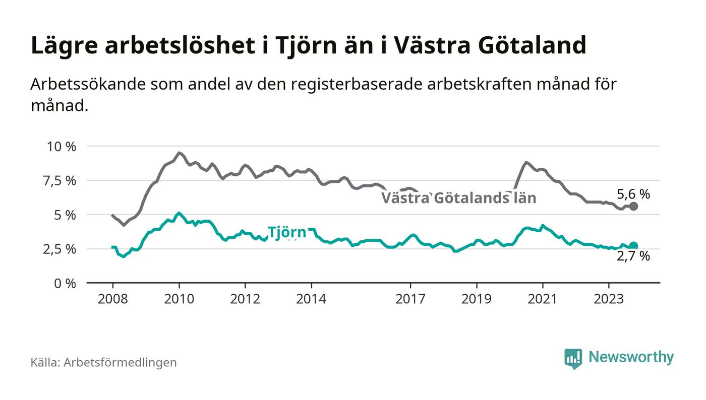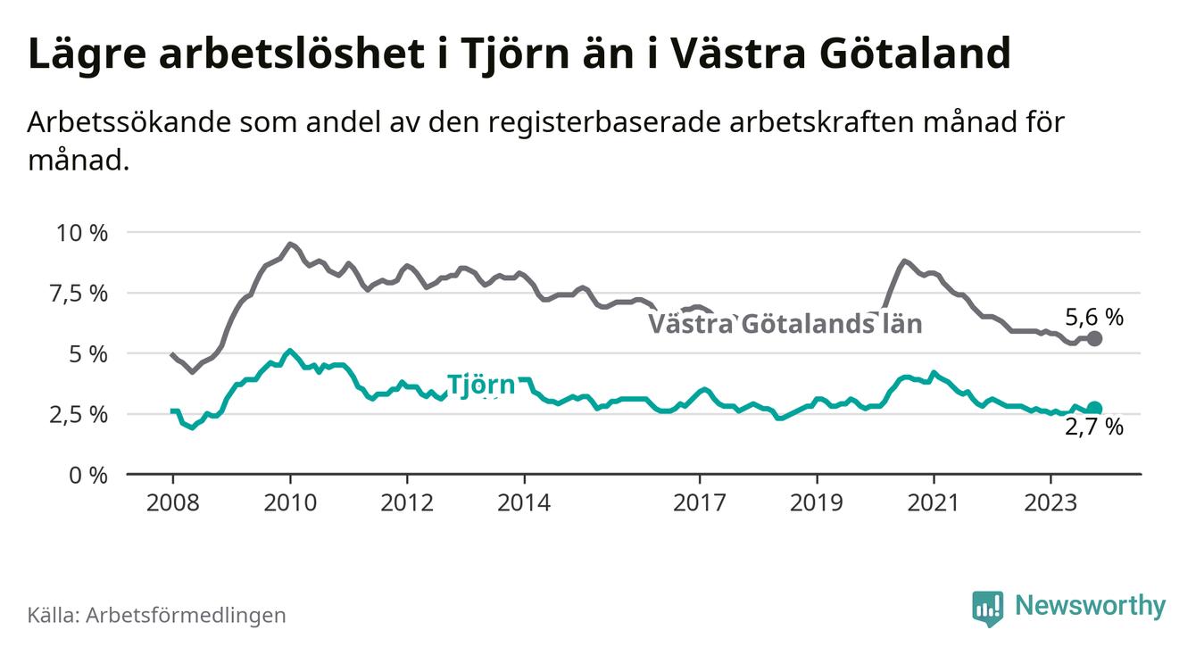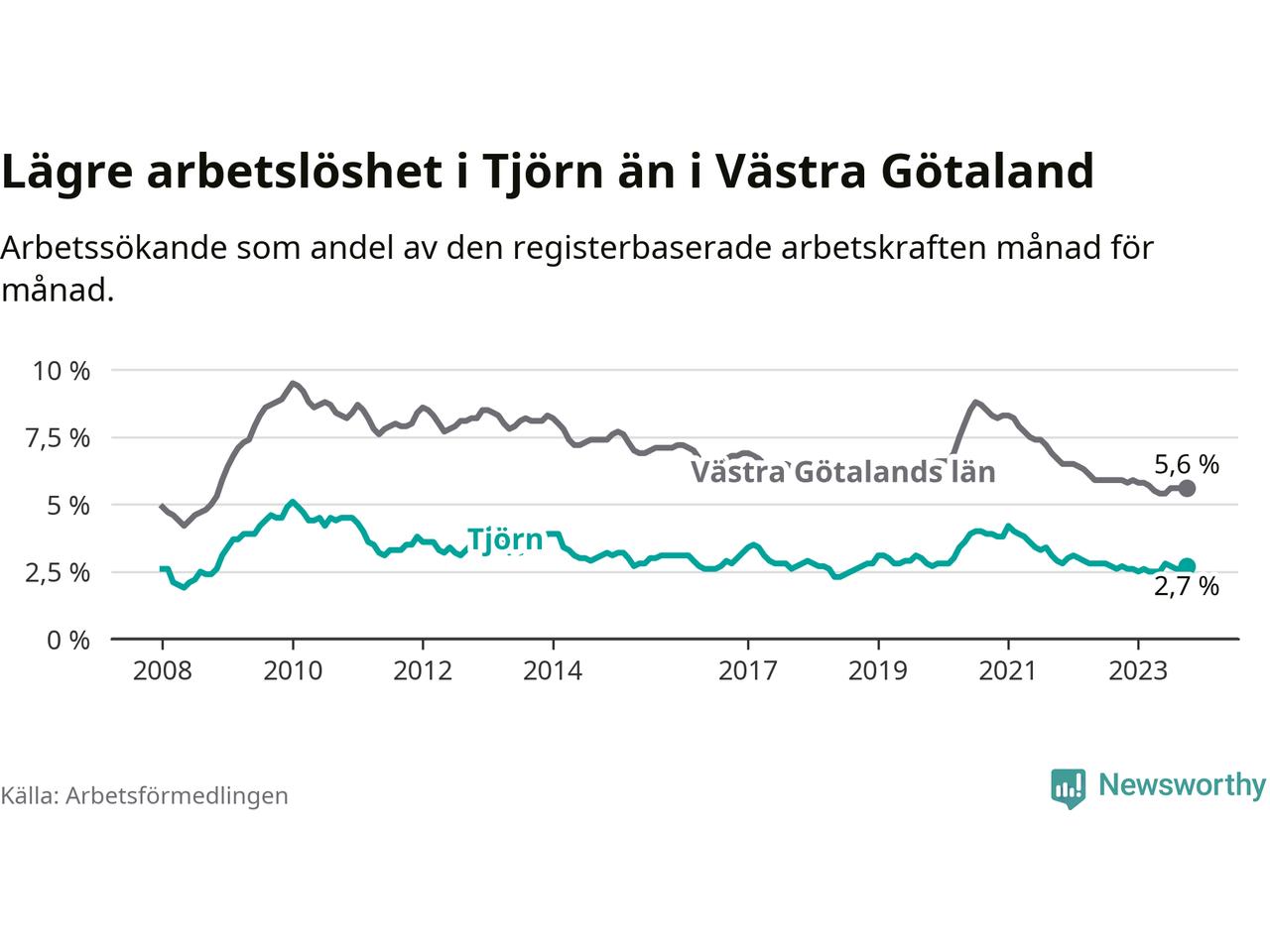 Graf: Arbetslöshet i Tjörns kommun och Västra Götalands län