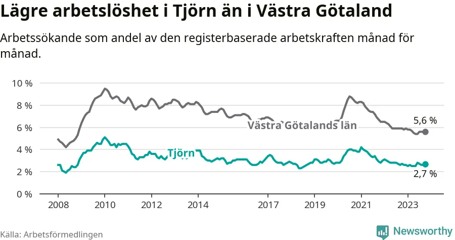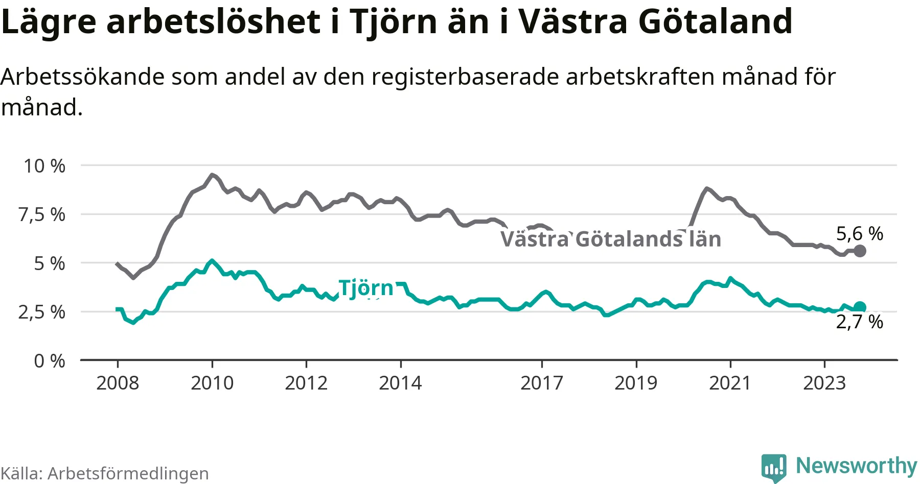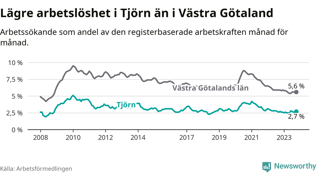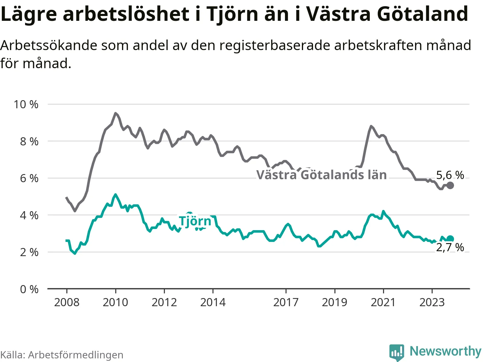 Graf: Arbetslöshet i Tjörns kommun och Västra Götalands län