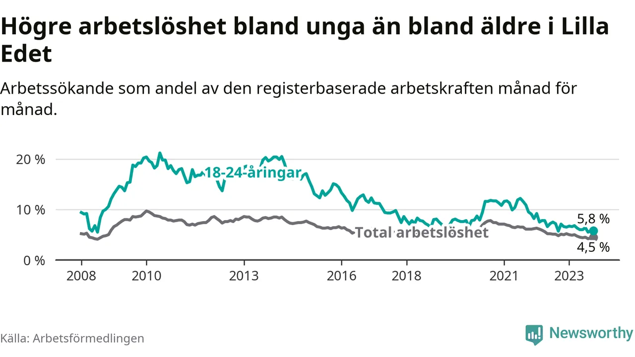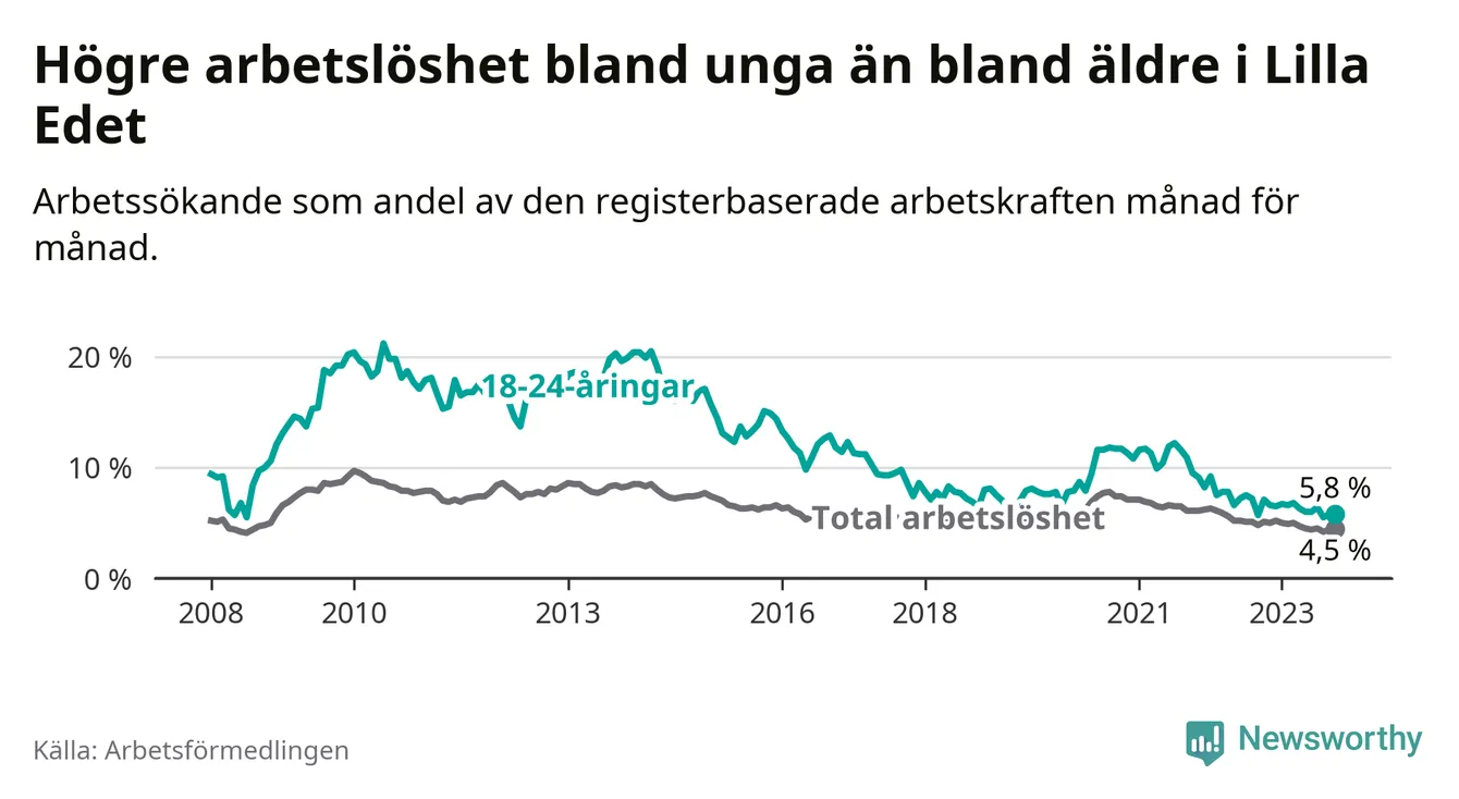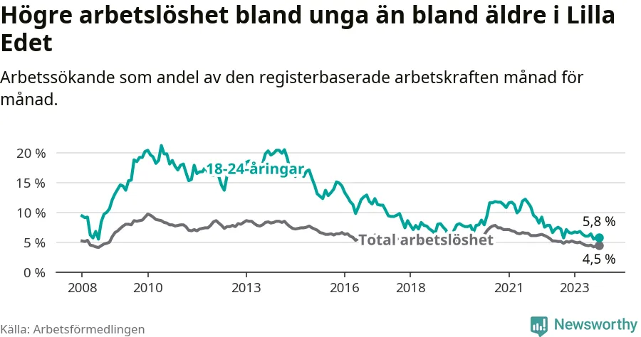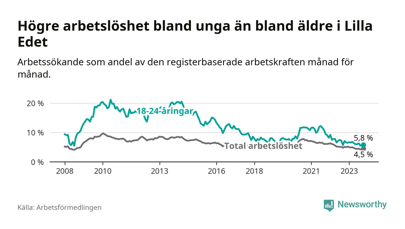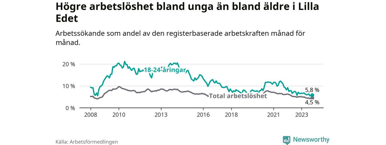 Precis som den totala arbetslösheten sjunker arbetslösheten bland unga (−1,3 procentenheter). I oktober var 5,8 procent av 18–24-åringarna inskrivna som arbetssökande (motsvarande 37 personer). Mäter vi antalet inskrivna ser vi en minskning med sju personer på ett års sikt.