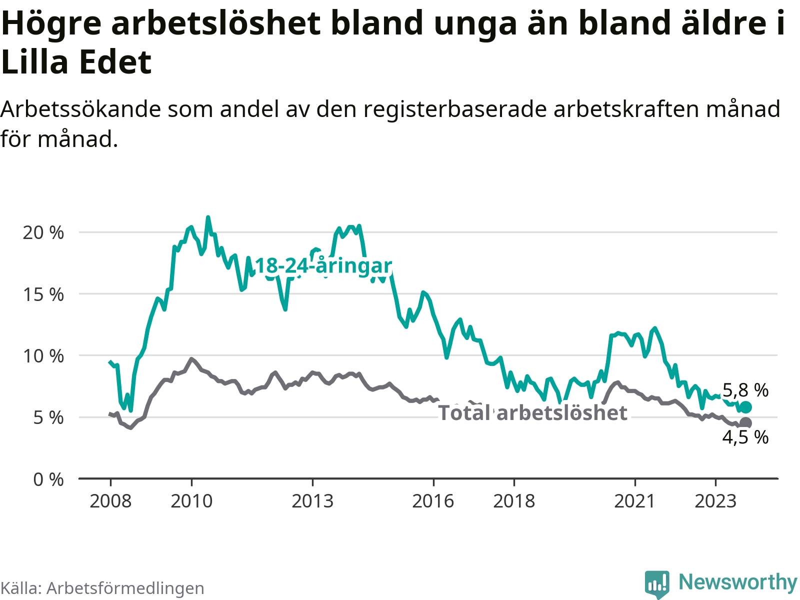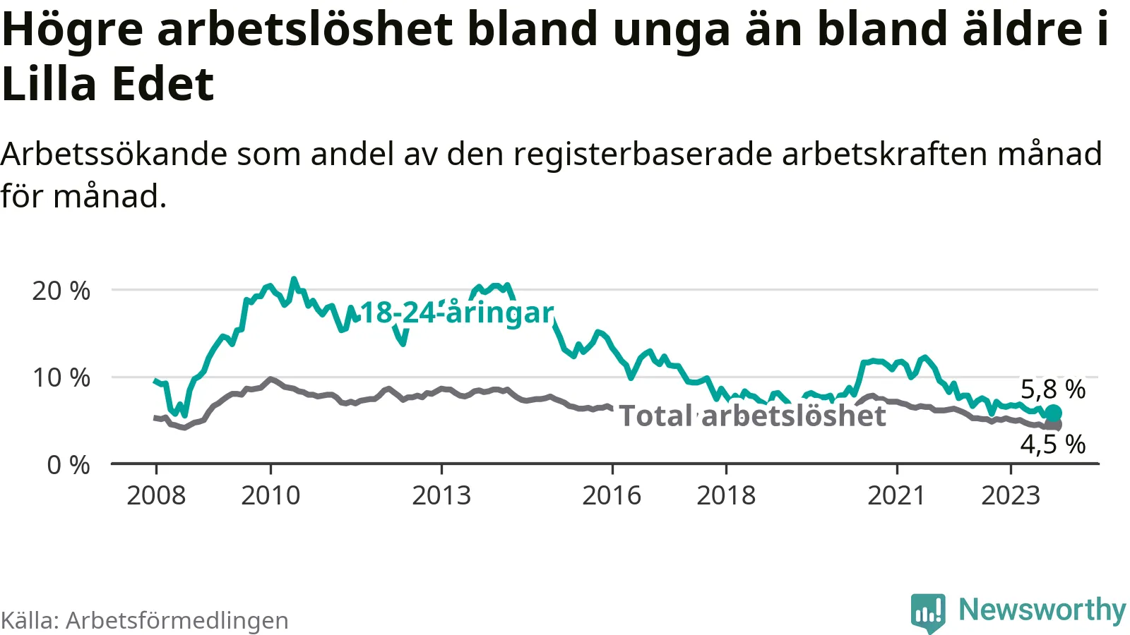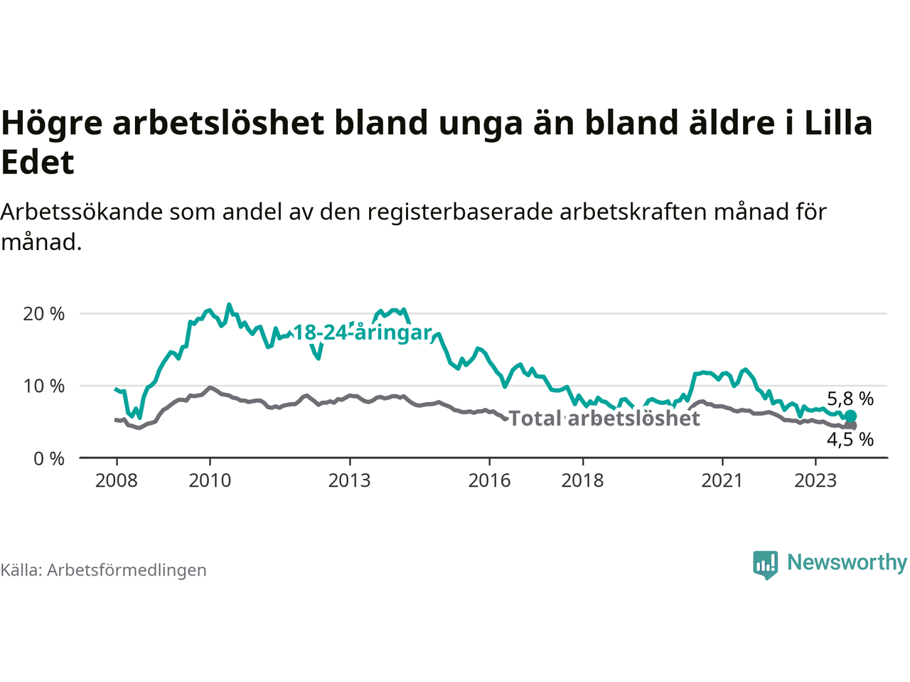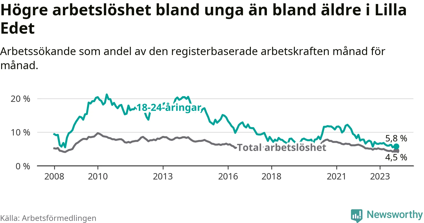 Precis som den totala arbetslösheten sjunker arbetslösheten bland unga (−1,3 procentenheter). I oktober var 5,8 procent av 18–24-åringarna inskrivna som arbetssökande (motsvarande 37 personer). Mäter vi antalet inskrivna ser vi en minskning med sju personer på ett års sikt.