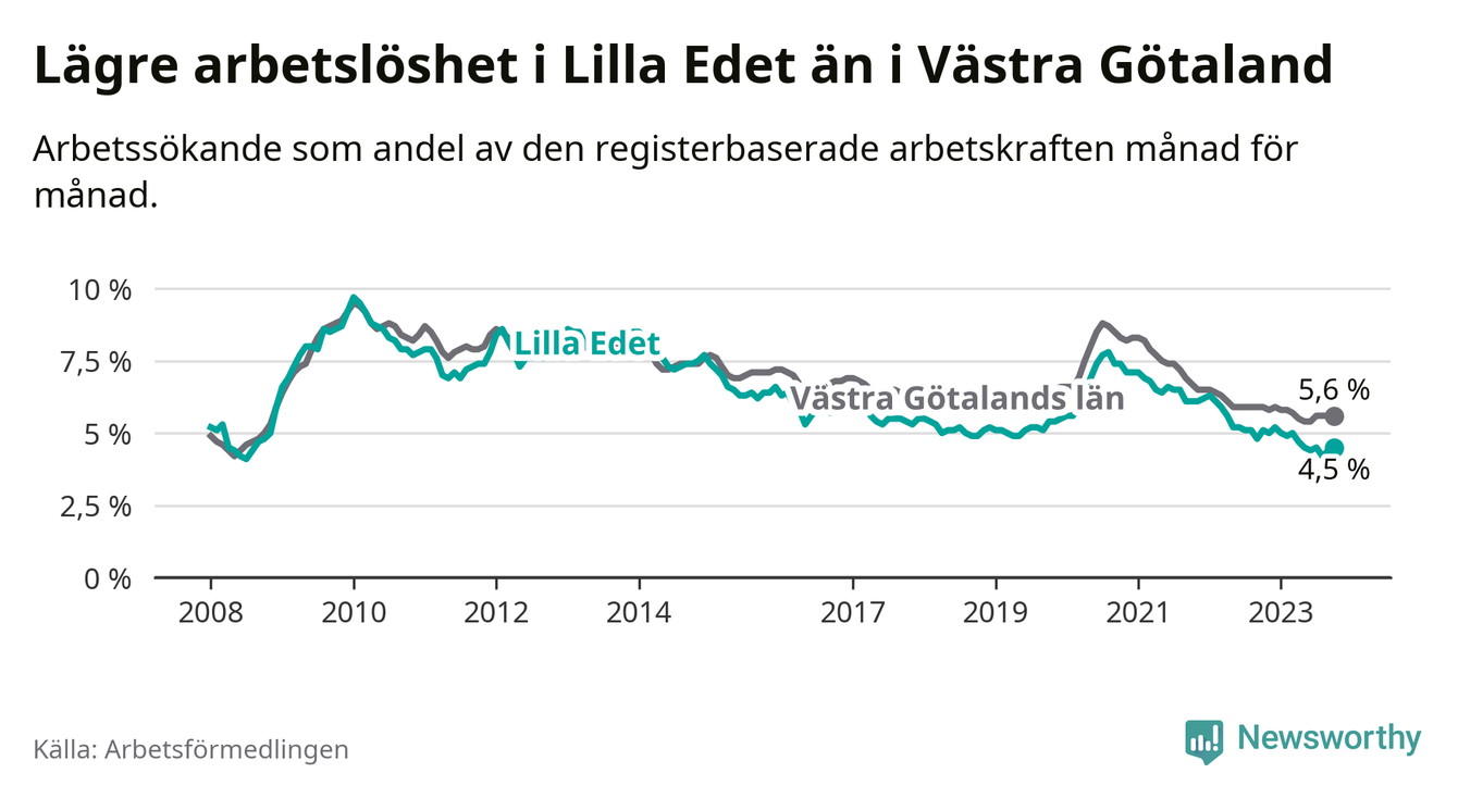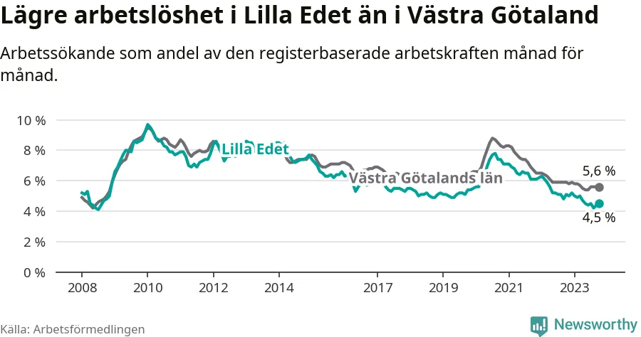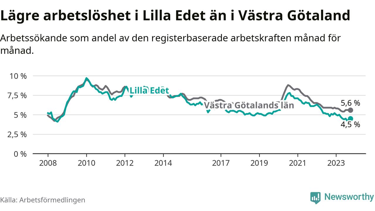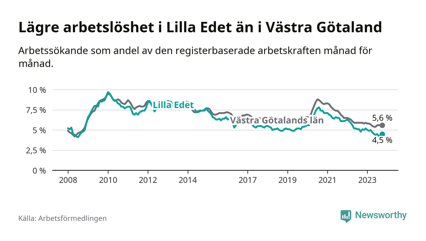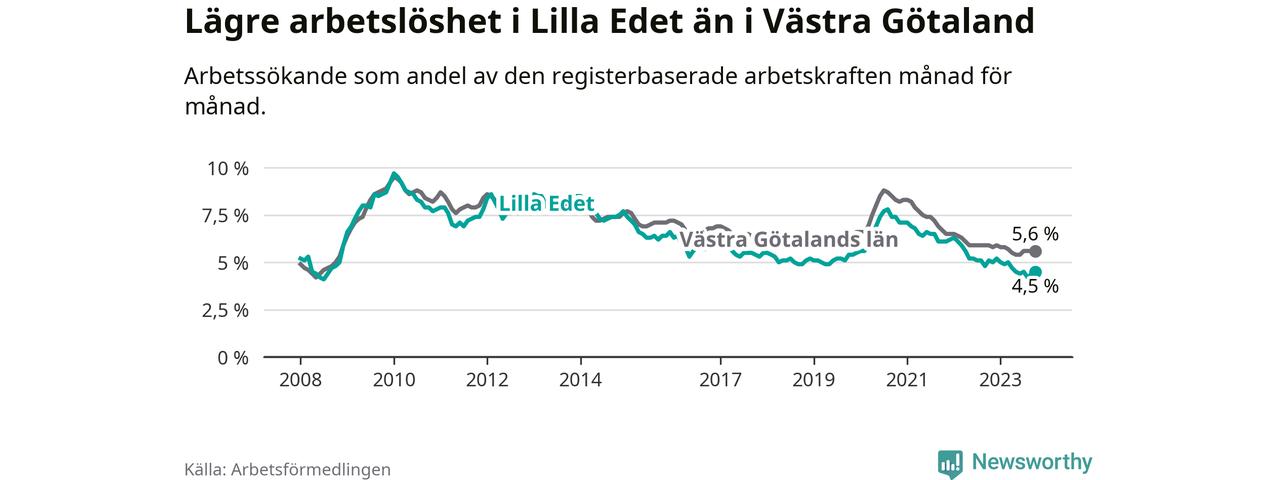 Lilla Edet hade redan tidigare lägre arbetslöshet än snittet i hela Västra Götalands län och nu växer klyftan (4,5 procent i kommunen, jämfört med 5,6 procent i hela länet). Öckerö har den lägsta arbetslösheten i länet (2,4 procent), medan Trollhättan har den högsta (8,4 procent). För att Lilla Edet skulle komma ner i samma arbetslöshetsnivå som Öckerö skulle 149 personer behöva sysselsättas.
