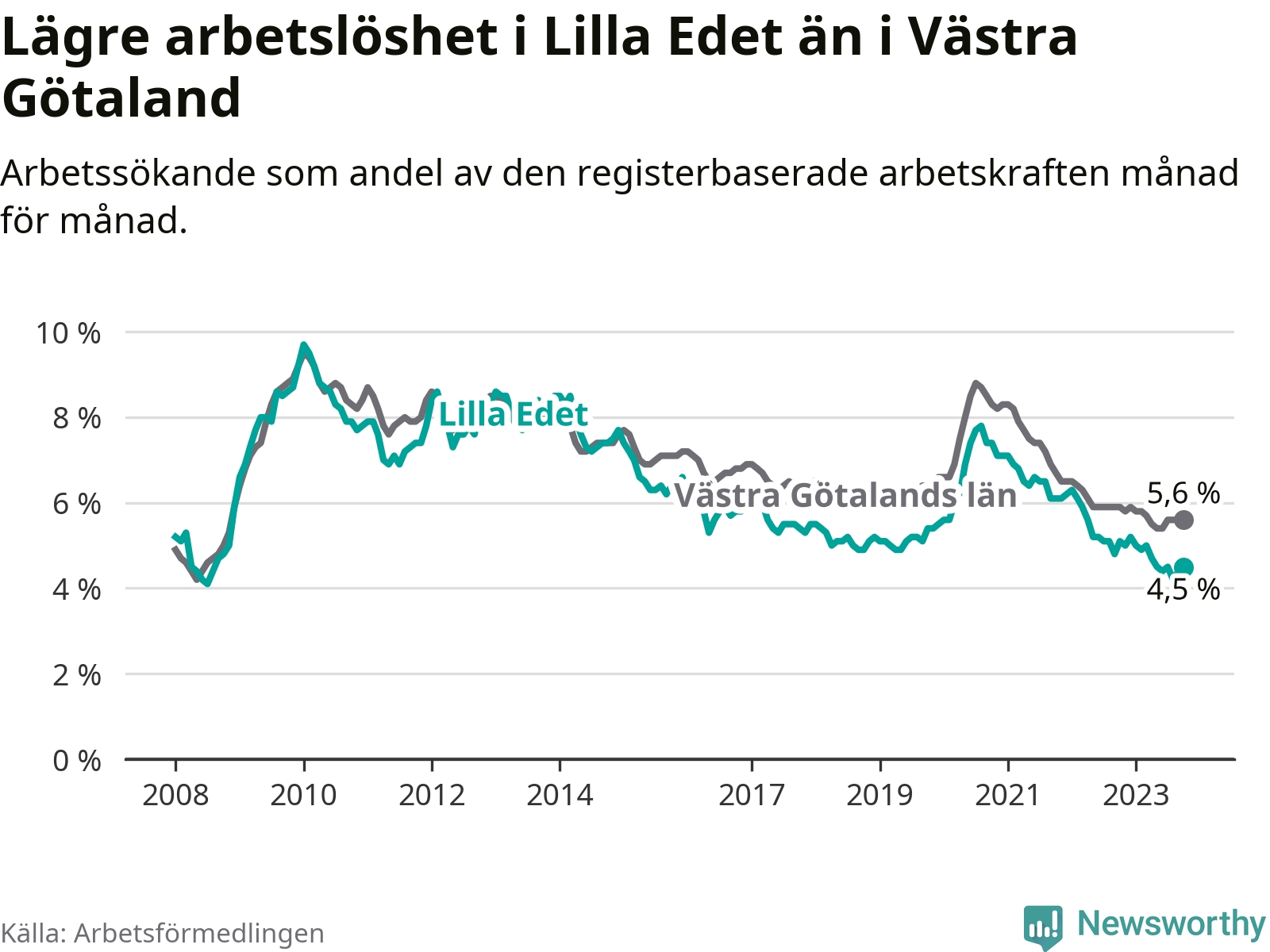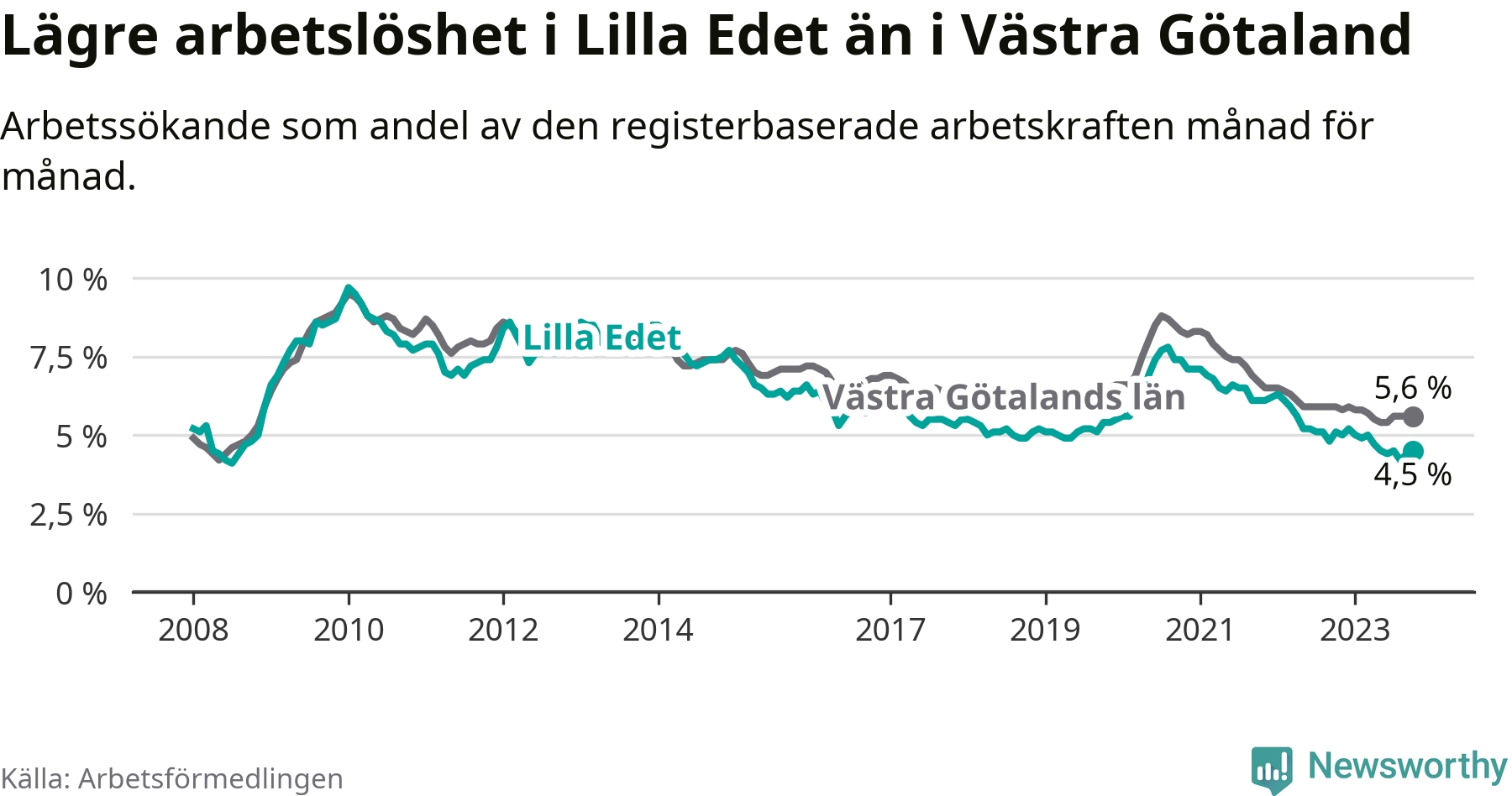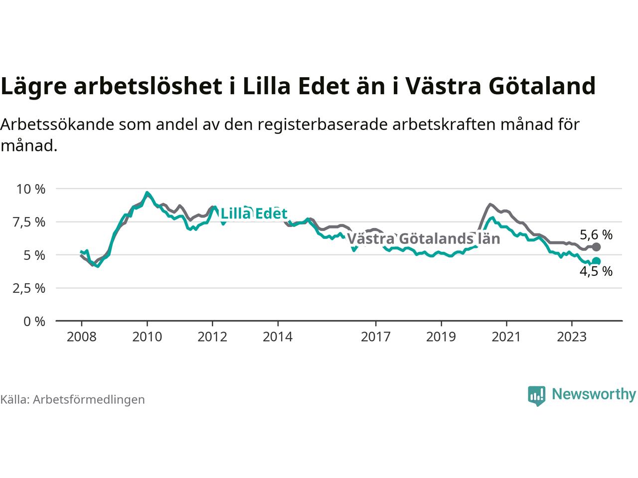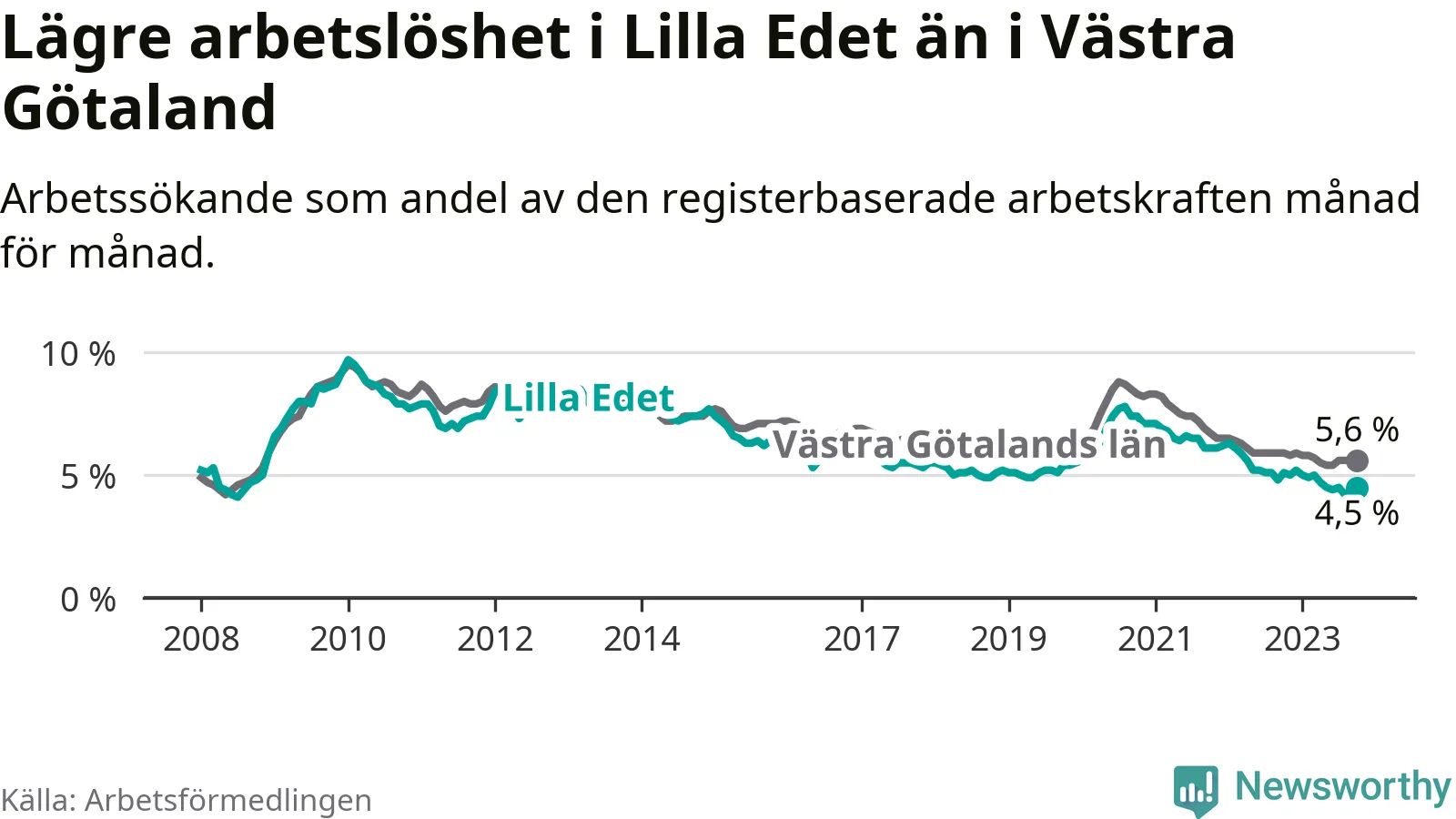 Lilla Edet hade redan tidigare lägre arbetslöshet än snittet i hela Västra Götalands län och nu växer klyftan (4,5 procent i kommunen, jämfört med 5,6 procent i hela länet). Öckerö har den lägsta arbetslösheten i länet (2,4 procent), medan Trollhättan har den högsta (8,4 procent). För att Lilla Edet skulle komma ner i samma arbetslöshetsnivå som Öckerö skulle 149 personer behöva sysselsättas.