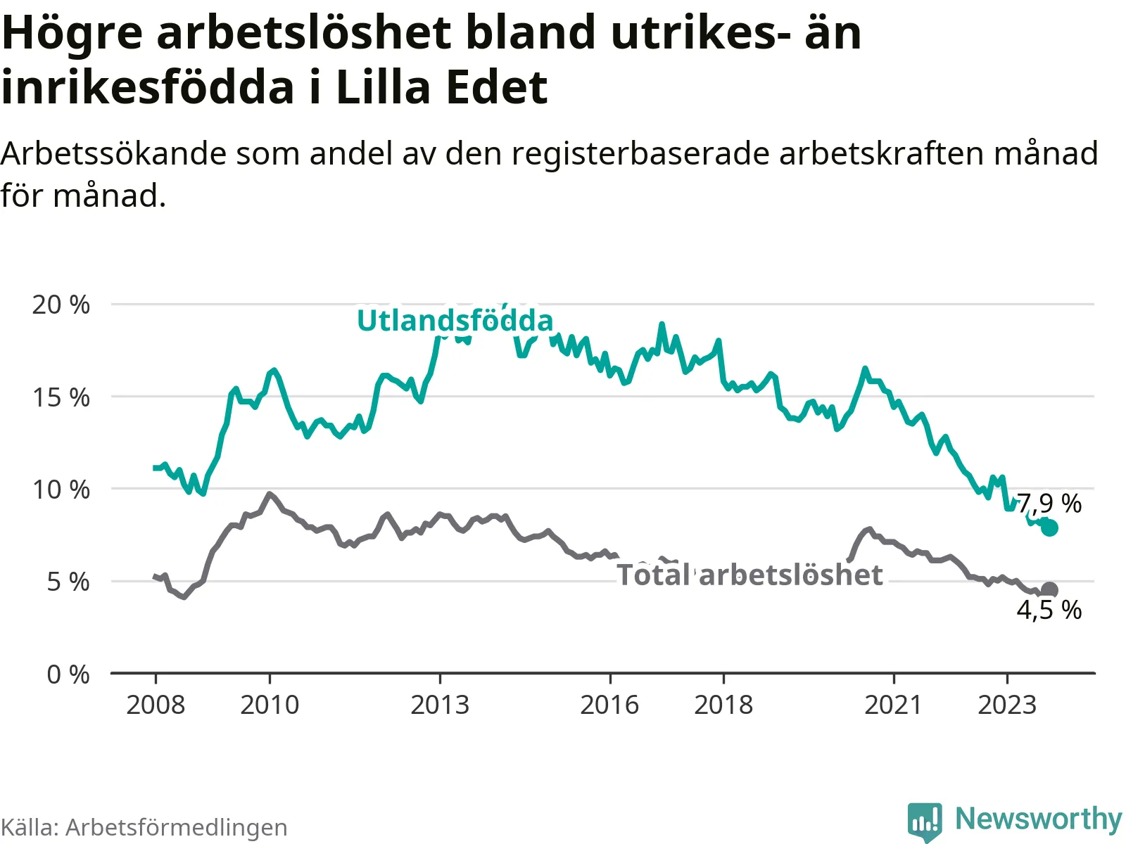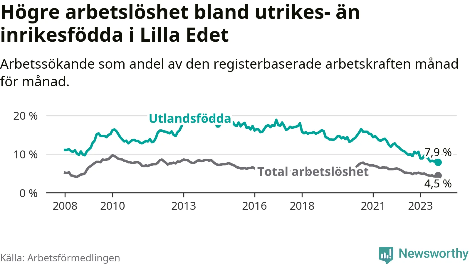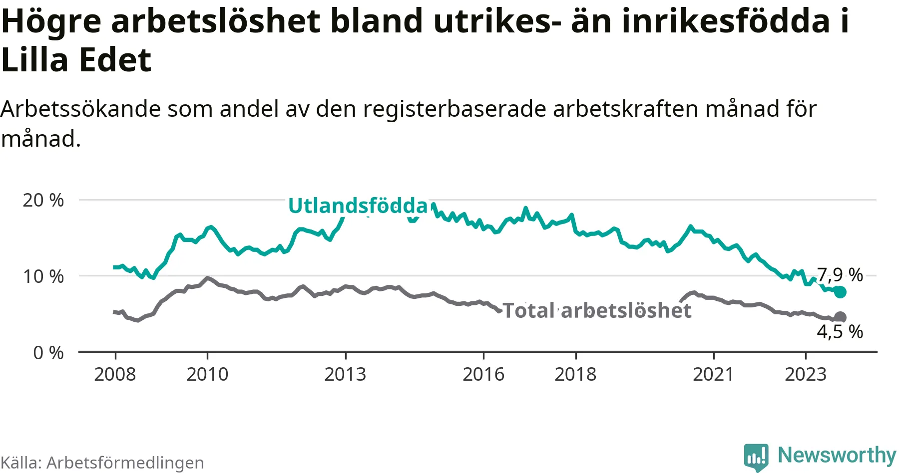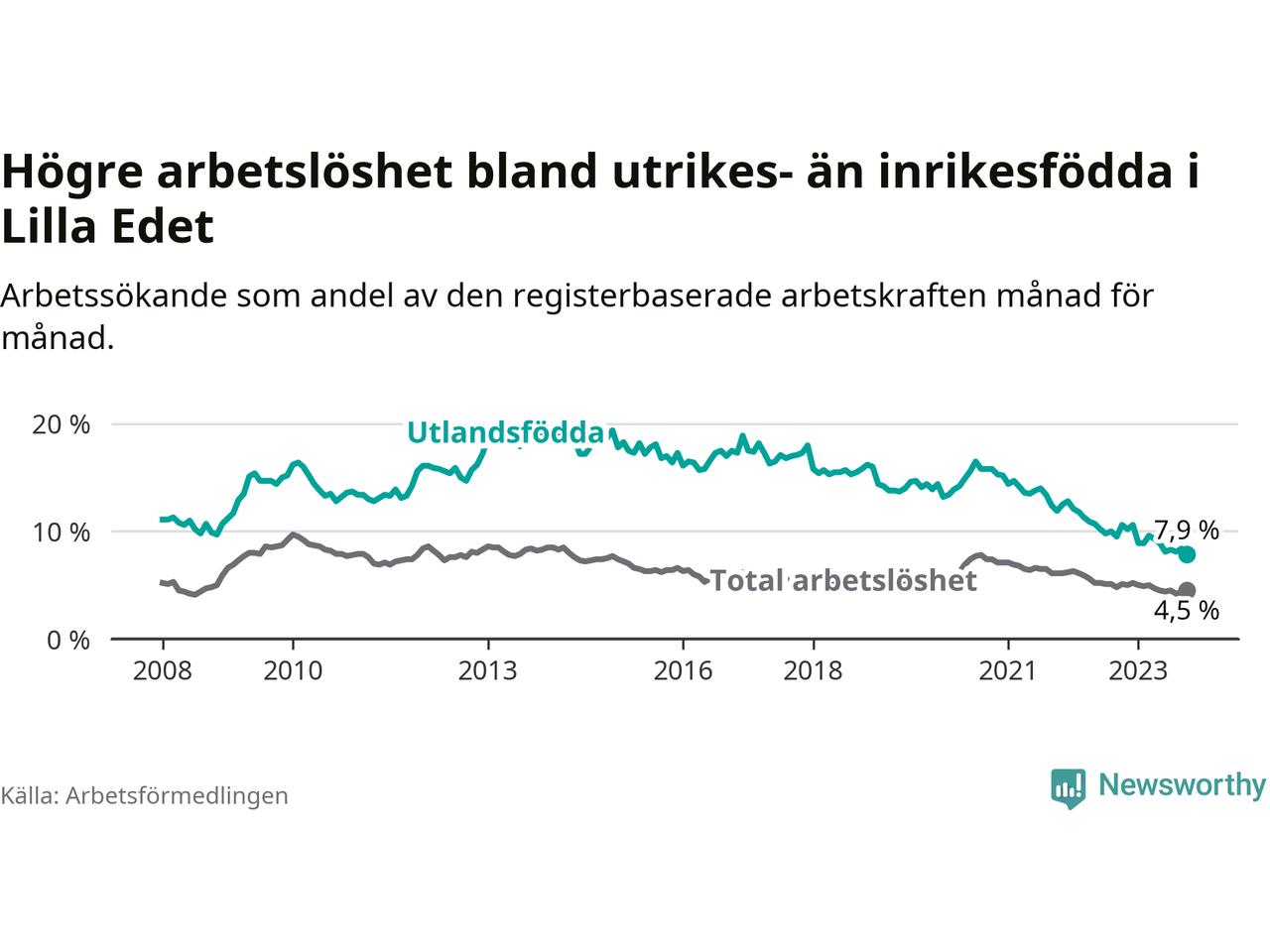 | Bland utlandsfödda | 7,9 % | −2,7 % ▼ | 13,6 % | −1,2 % ▼ | 15,2 % | −1,1 % ▼ |