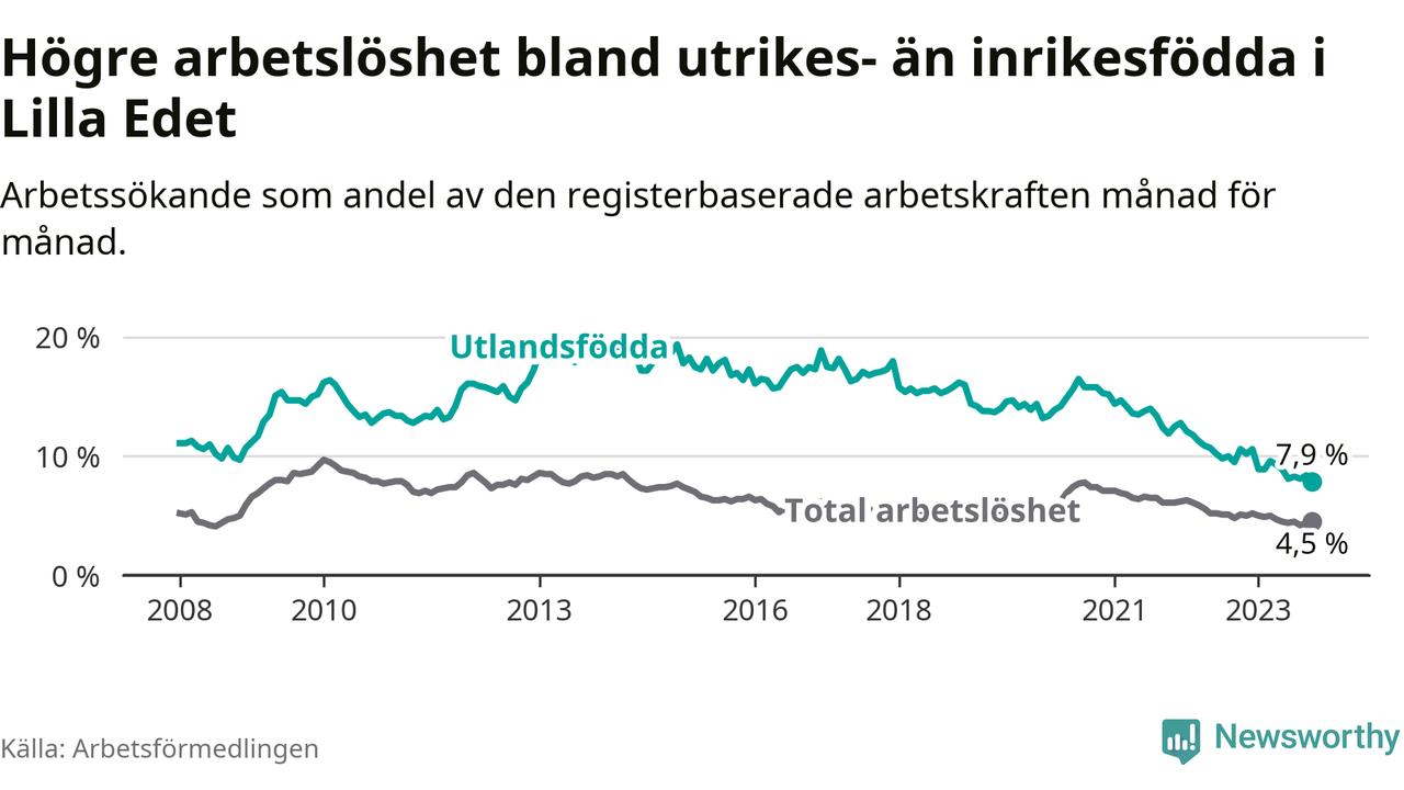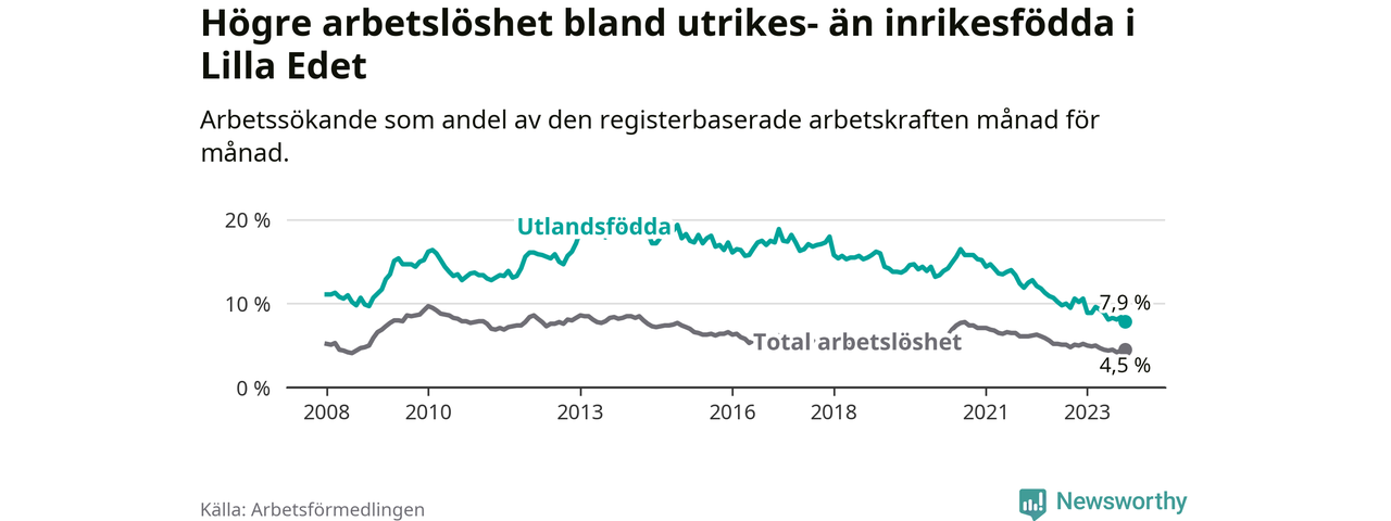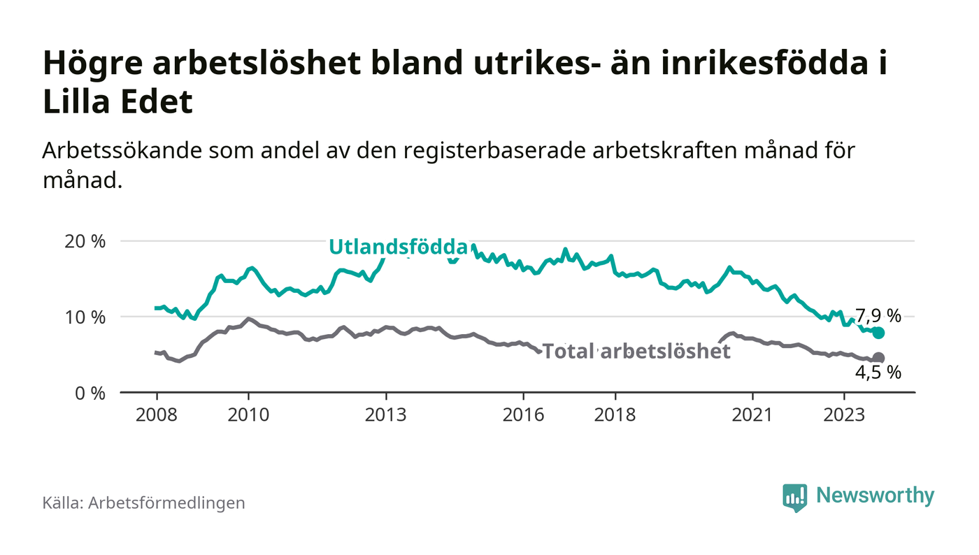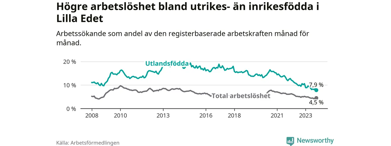 Skillnaden i arbetslöshet mellan utrikesfödda och hela befolkningen är 3,4 procentenheter i Lilla Edet. Det är en betydligt mindre skillnad än för ett år sedan (−2,1 procentenheter).