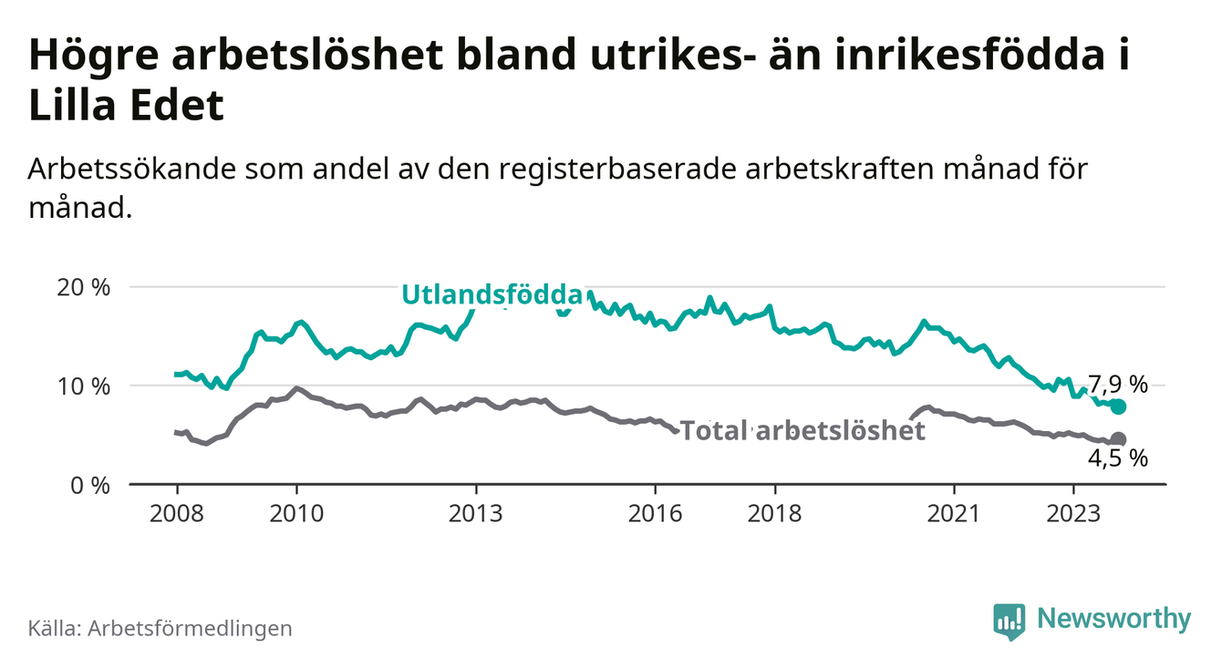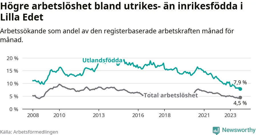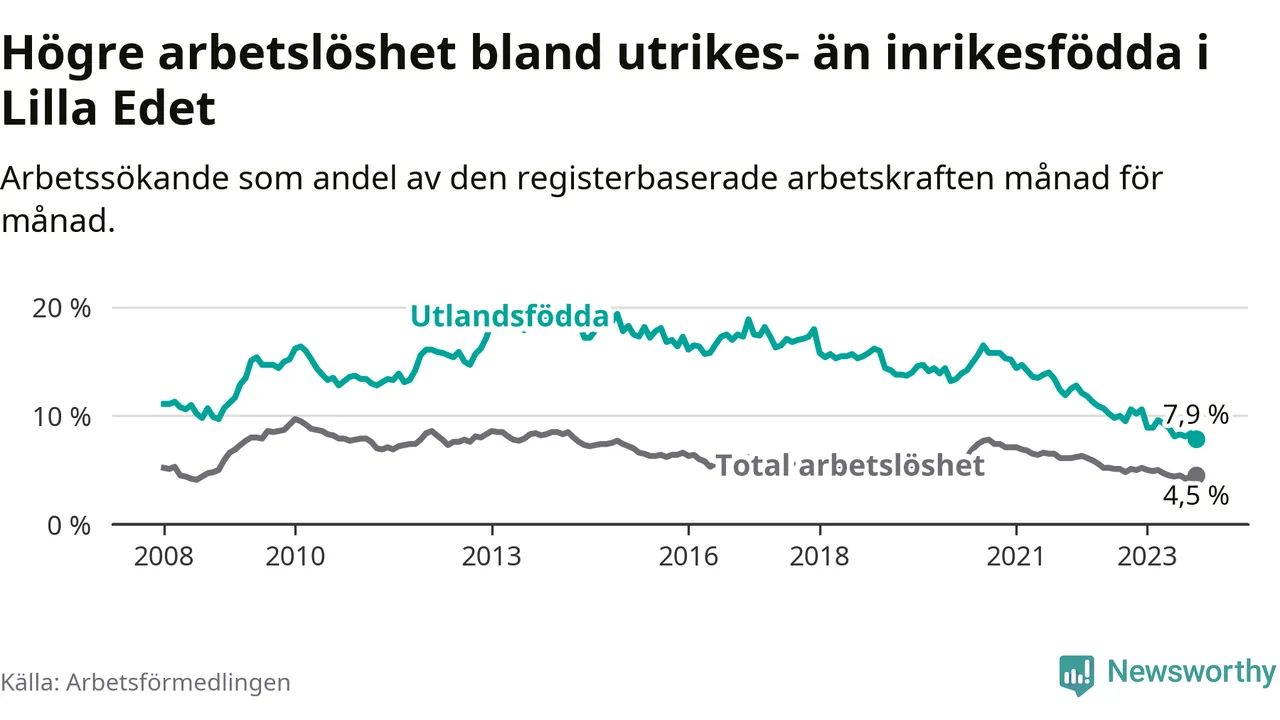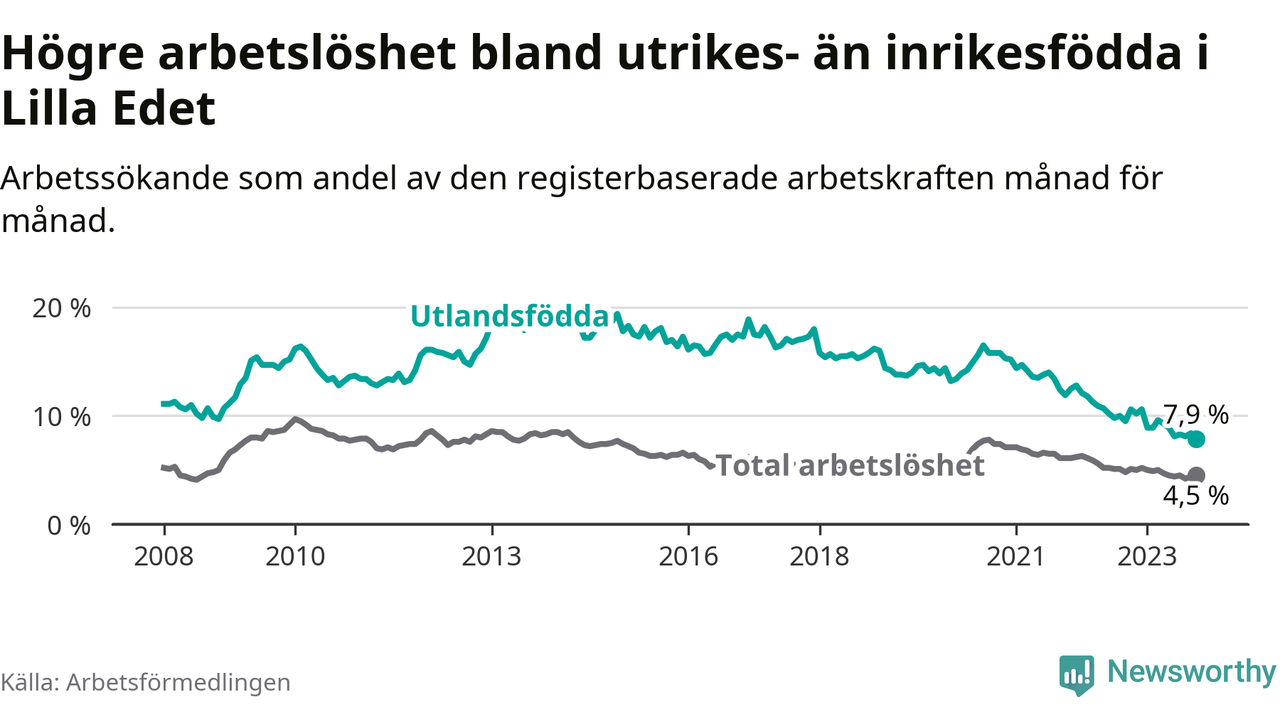 Skillnaden i arbetslöshet mellan utrikesfödda och hela befolkningen är 3,4 procentenheter i Lilla Edet. Det är en betydligt mindre skillnad än för ett år sedan (−2,1 procentenheter).