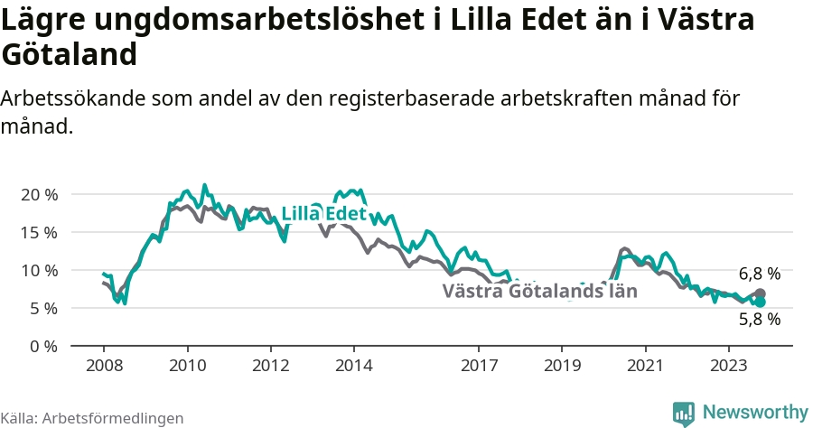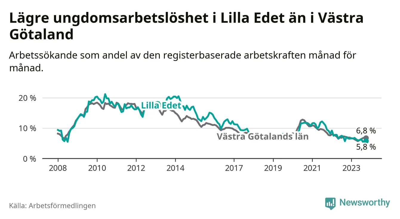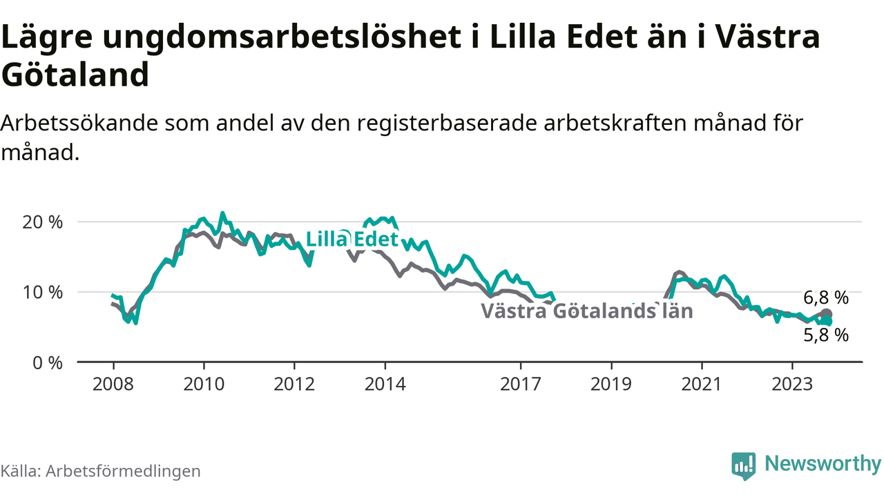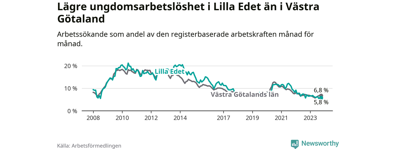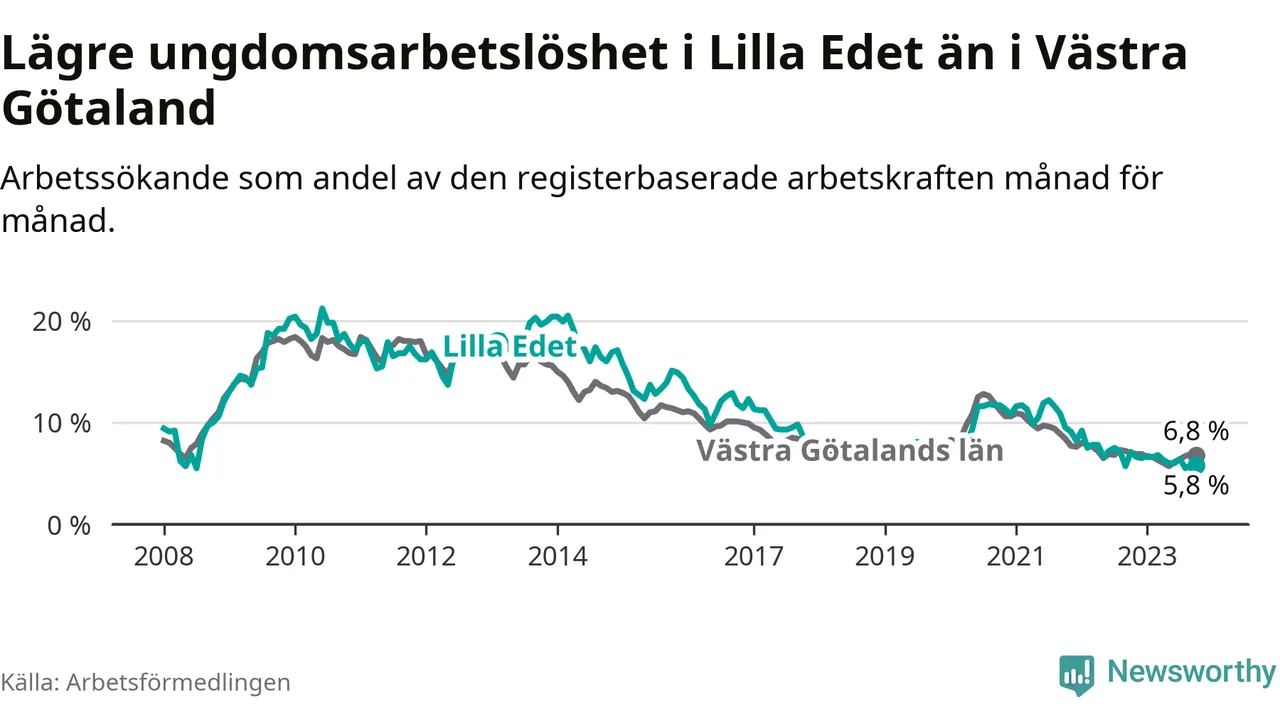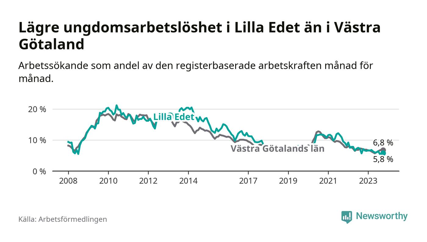Precis som den totala arbetslösheten ligger ungdomsarbetslösheten i Lilla Edet lägre än i Västra Götaland som helhet. Skillnaden mellan kommunen och länet är 1,0 procentenheter.