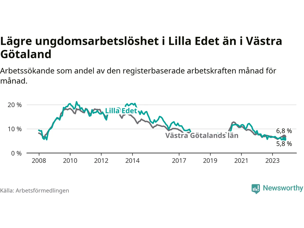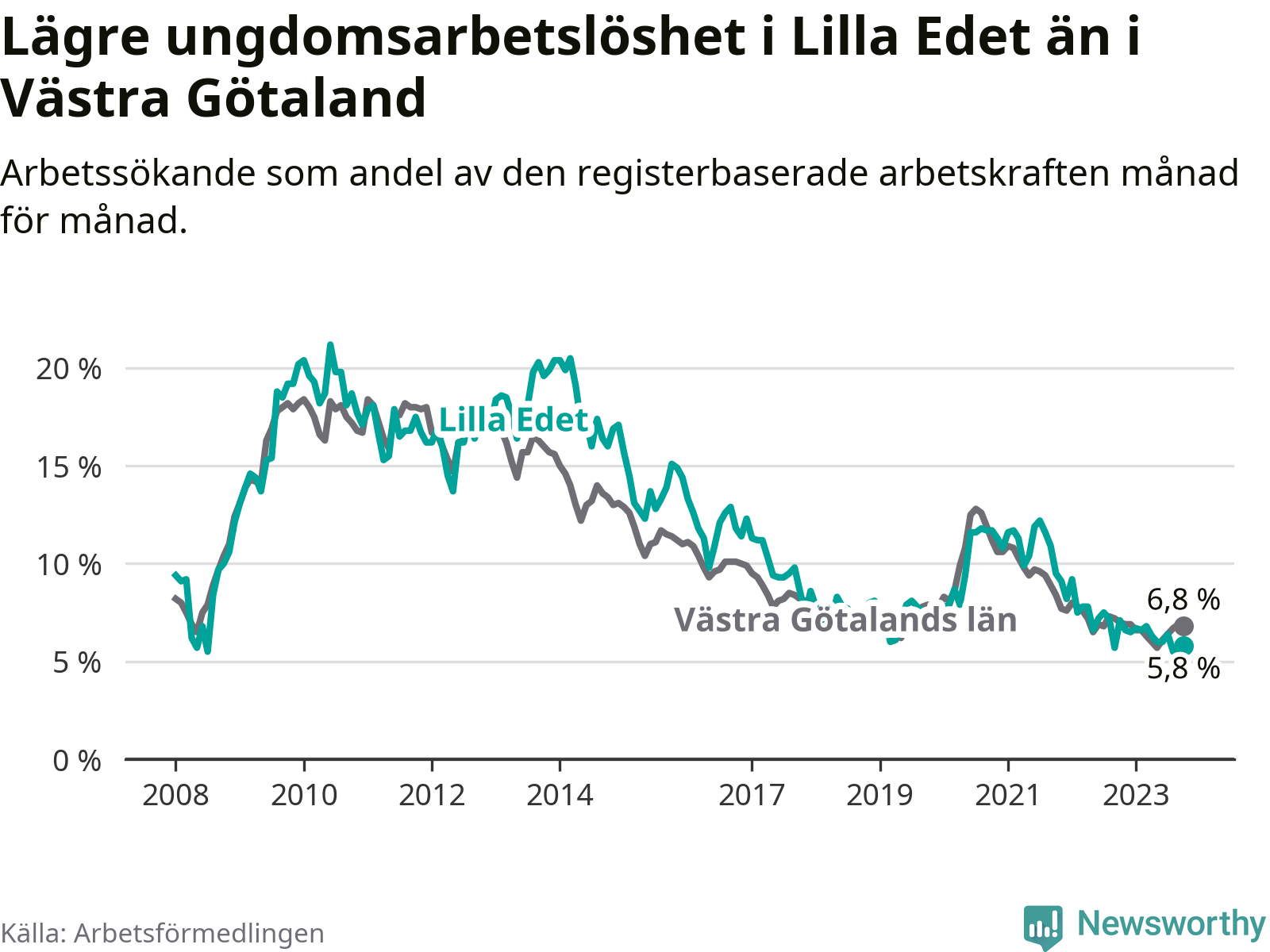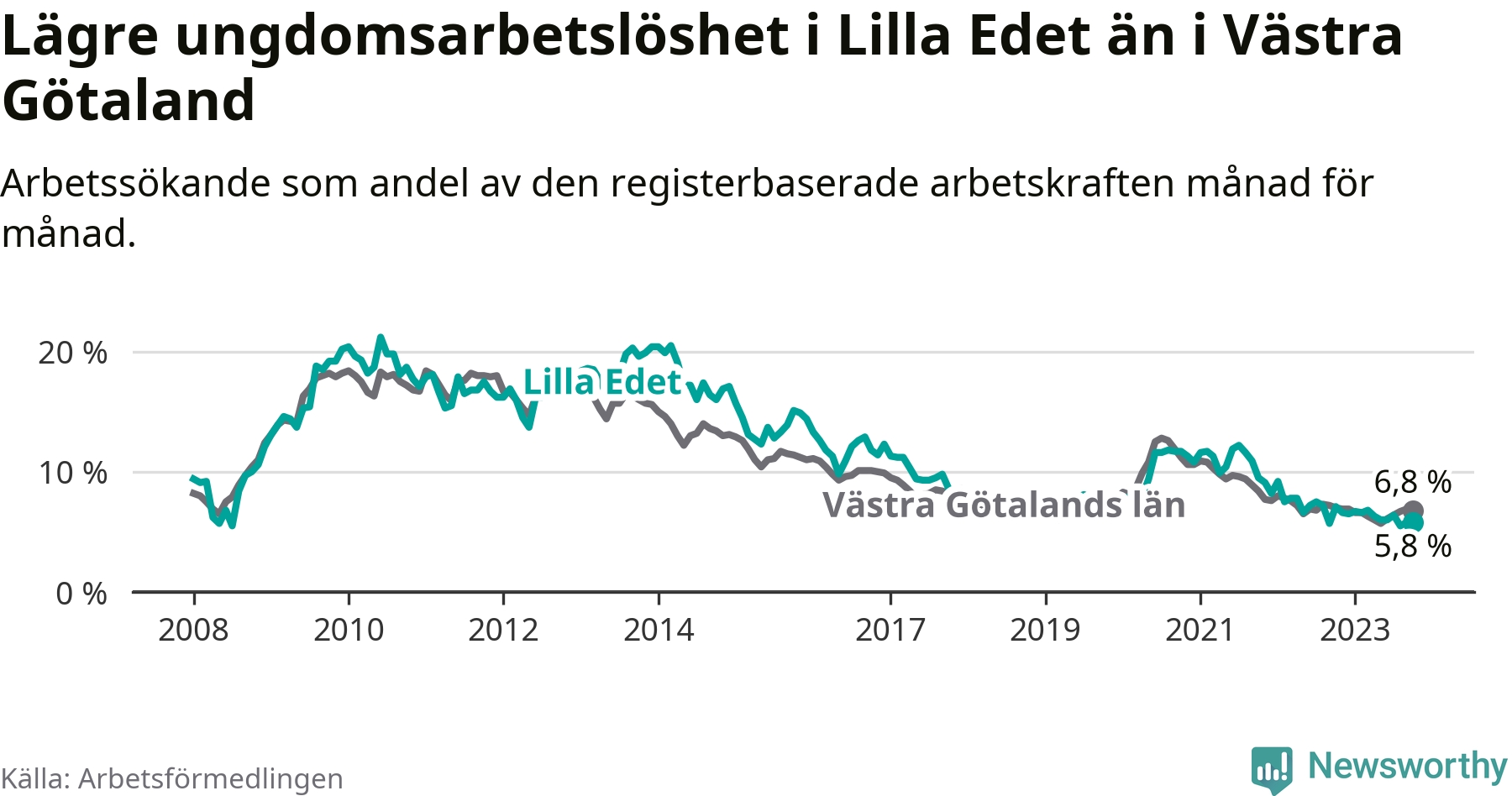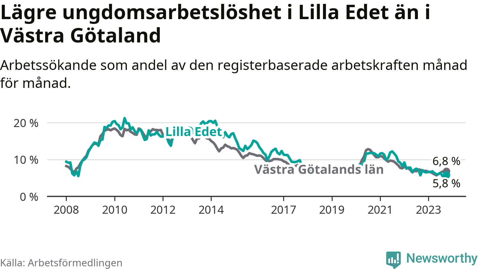 Precis som den totala arbetslösheten ligger ungdomsarbetslösheten i Lilla Edet lägre än i Västra Götaland som helhet. Skillnaden mellan kommunen och länet är 1,0 procentenheter.