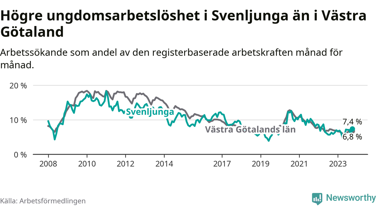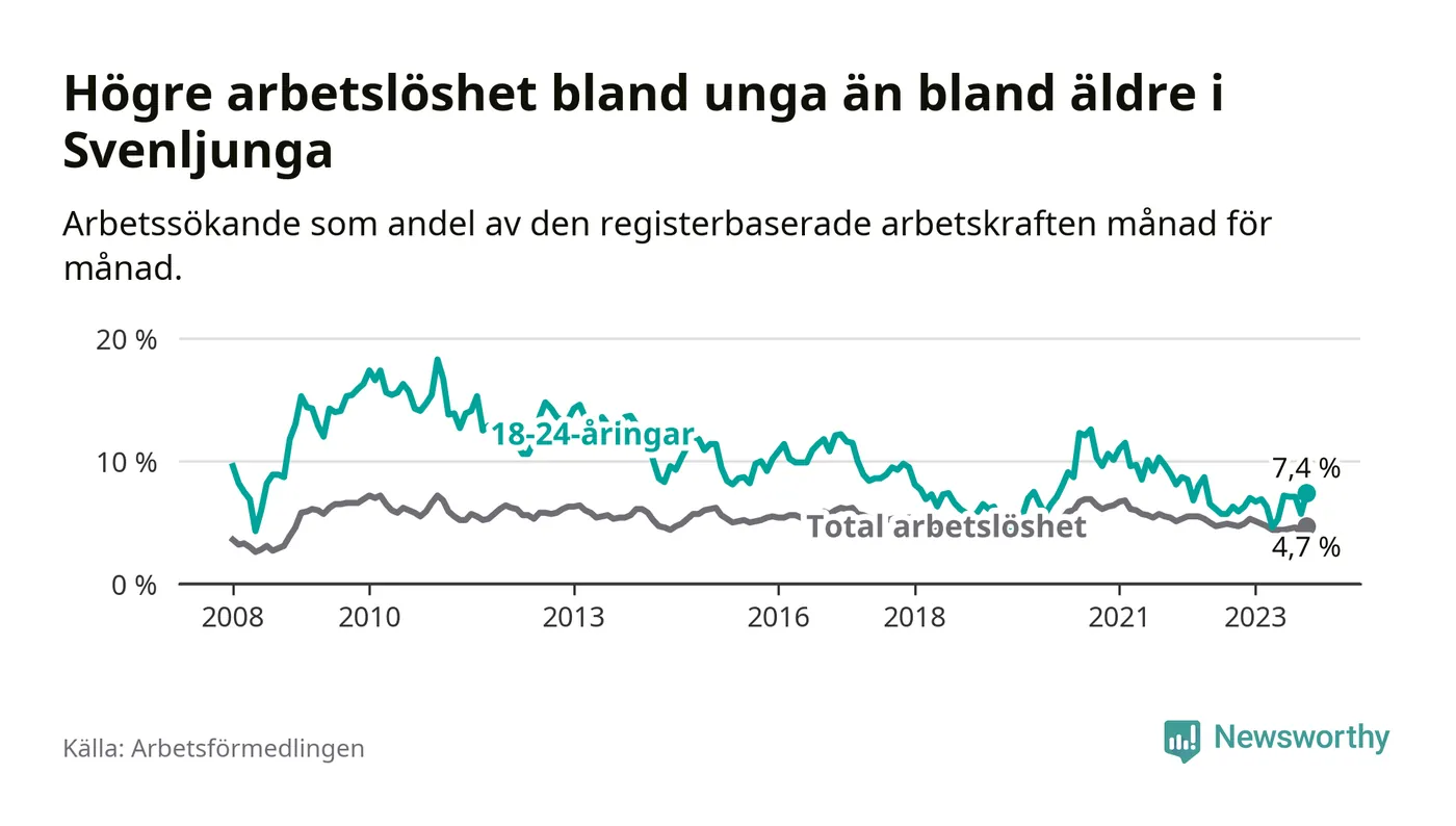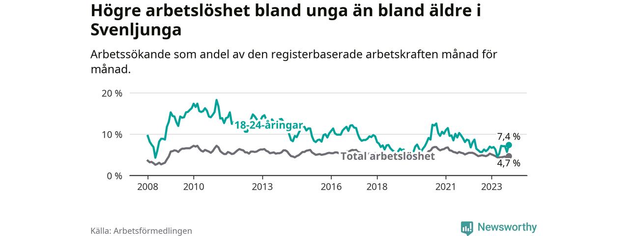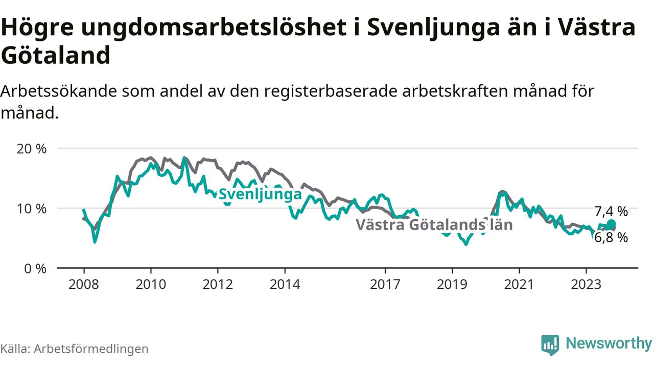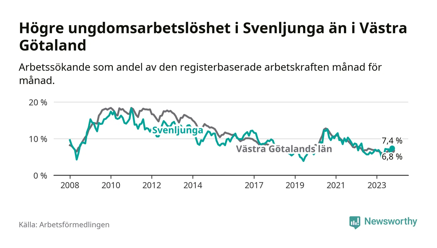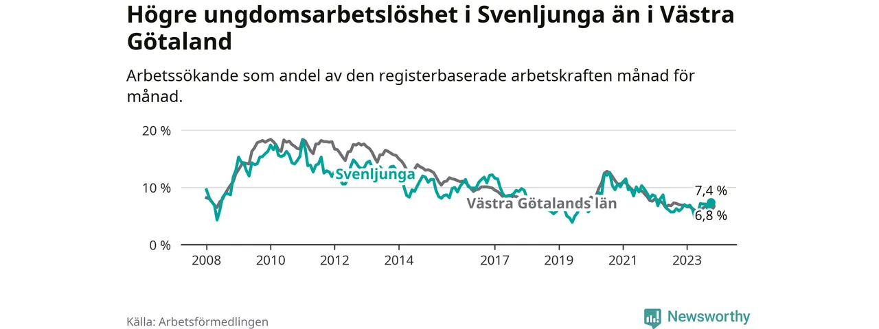 Medan Svenljunga har lägre total arbetslöshet än Västra Götaland, ligger ungdomsarbetslösheten 0,6 procentenheter högre i Svenljunga.