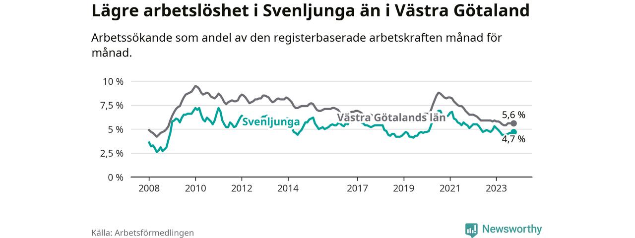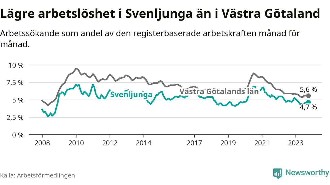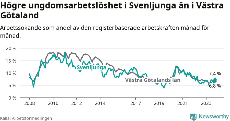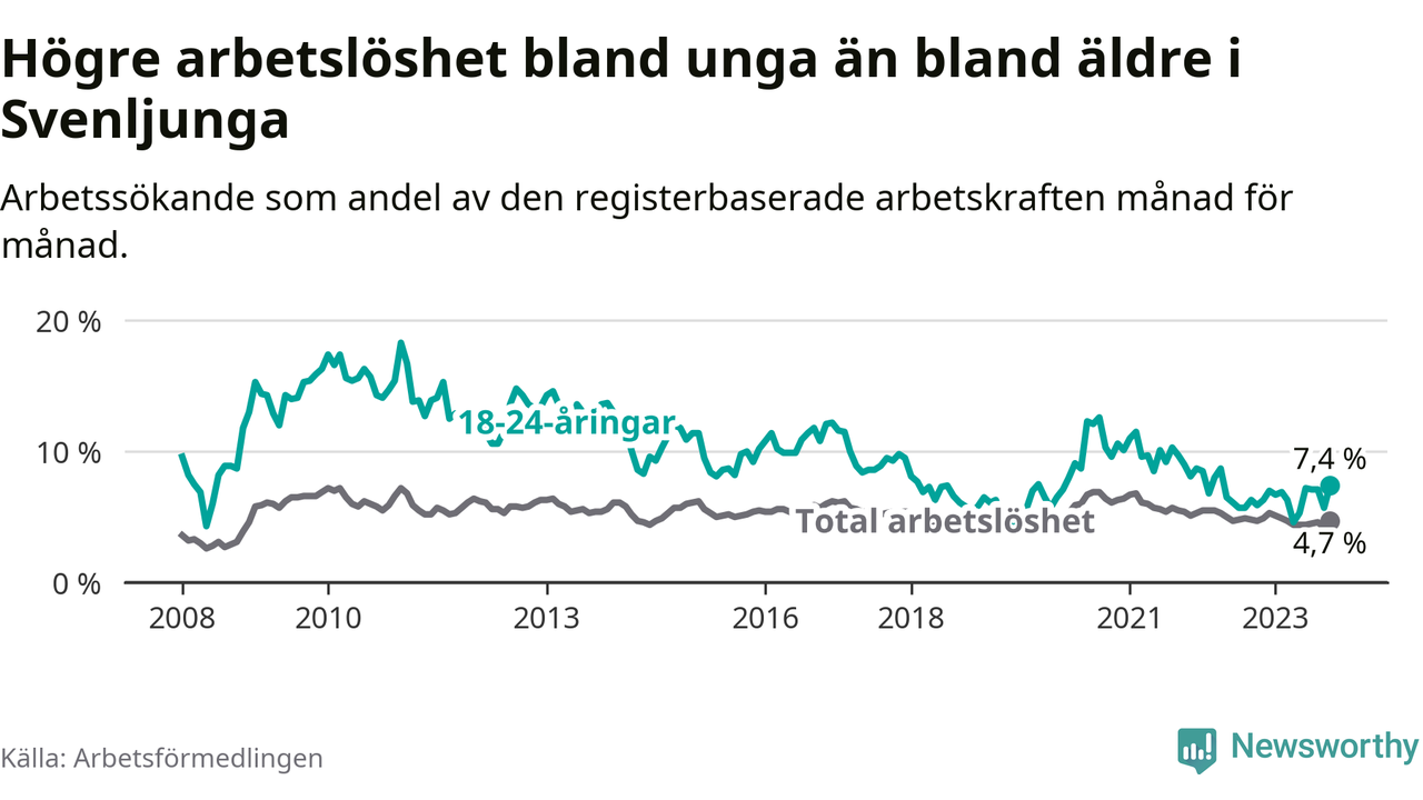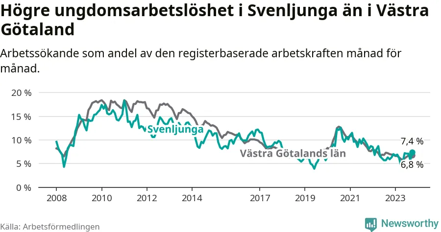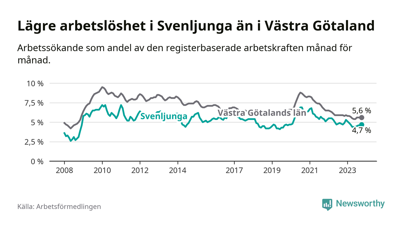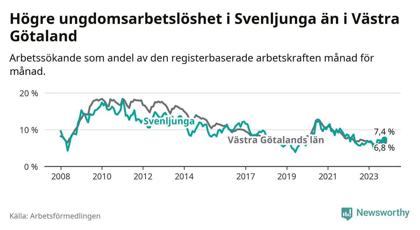Medan Svenljunga har lägre total arbetslöshet än Västra Götaland, ligger ungdomsarbetslösheten 0,6 procentenheter högre i Svenljunga.