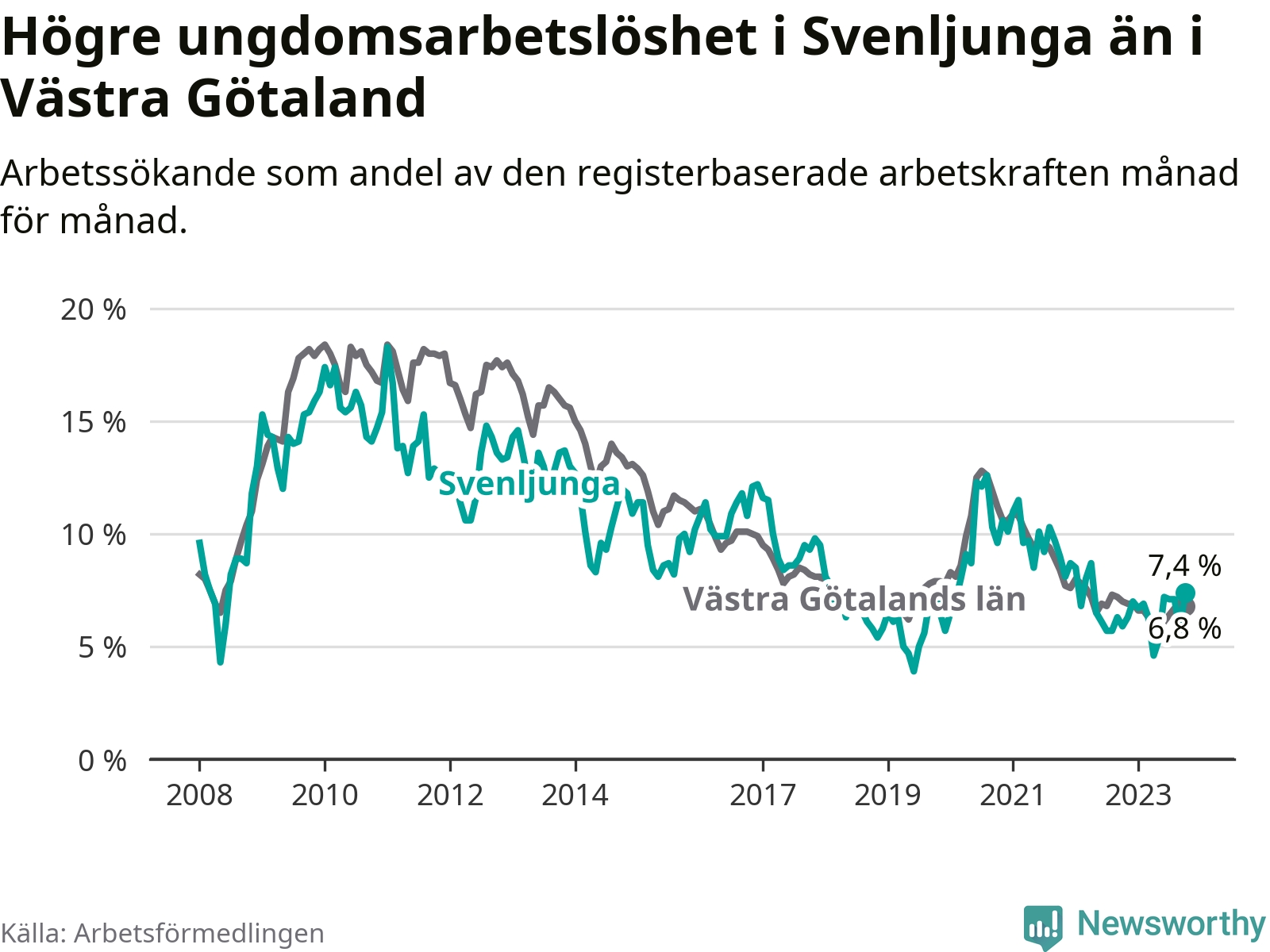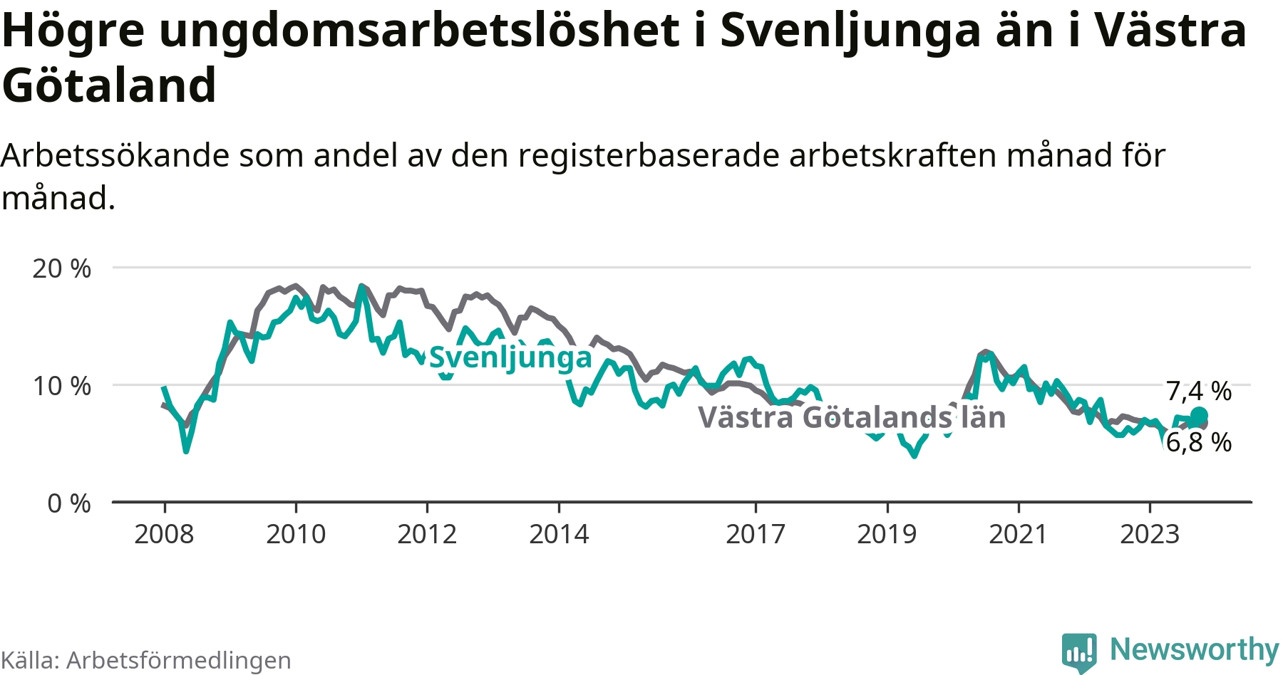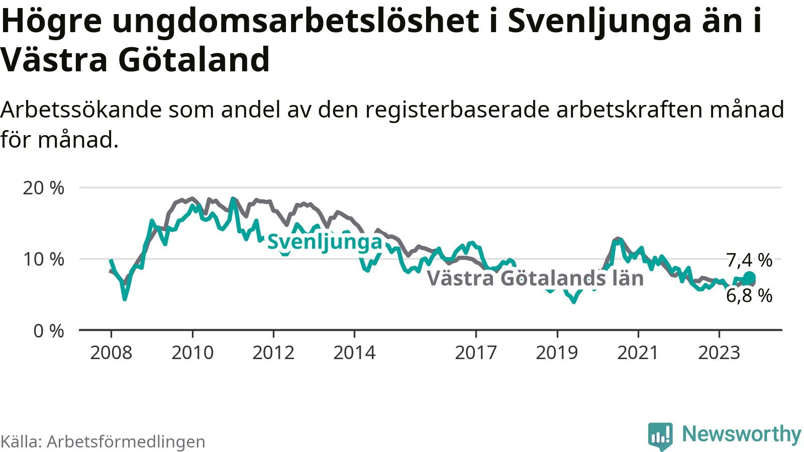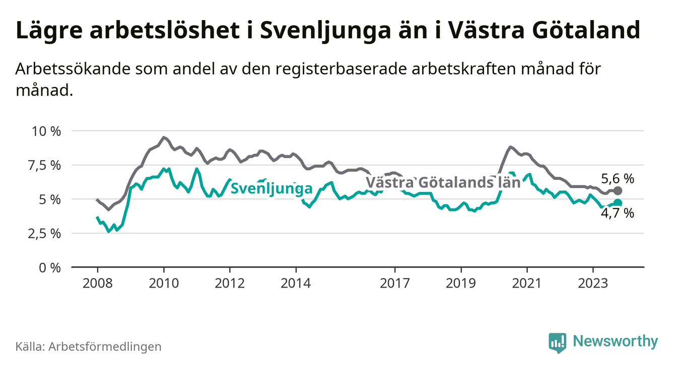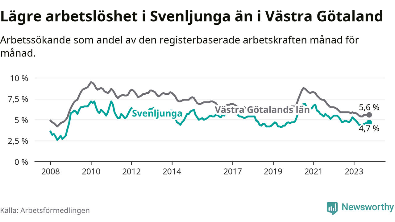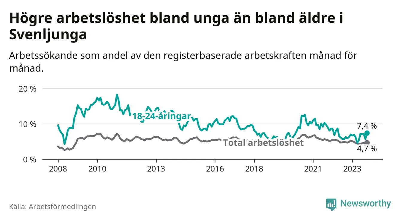 Medan Svenljunga har lägre total arbetslöshet än Västra Götaland, ligger ungdomsarbetslösheten 0,6 procentenheter högre i Svenljunga.