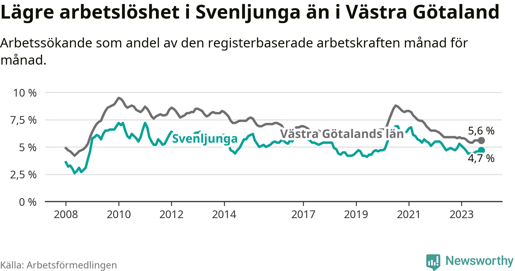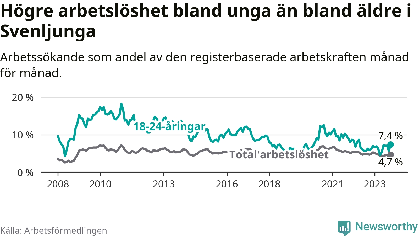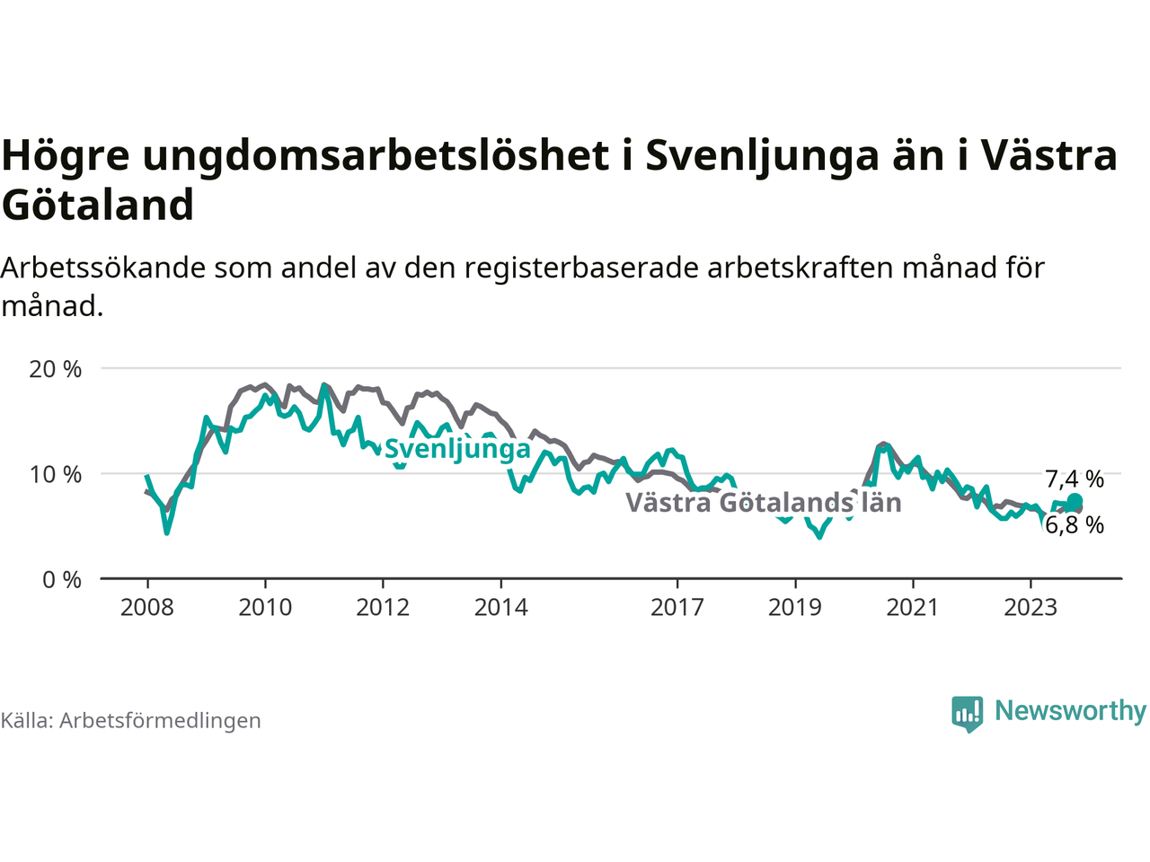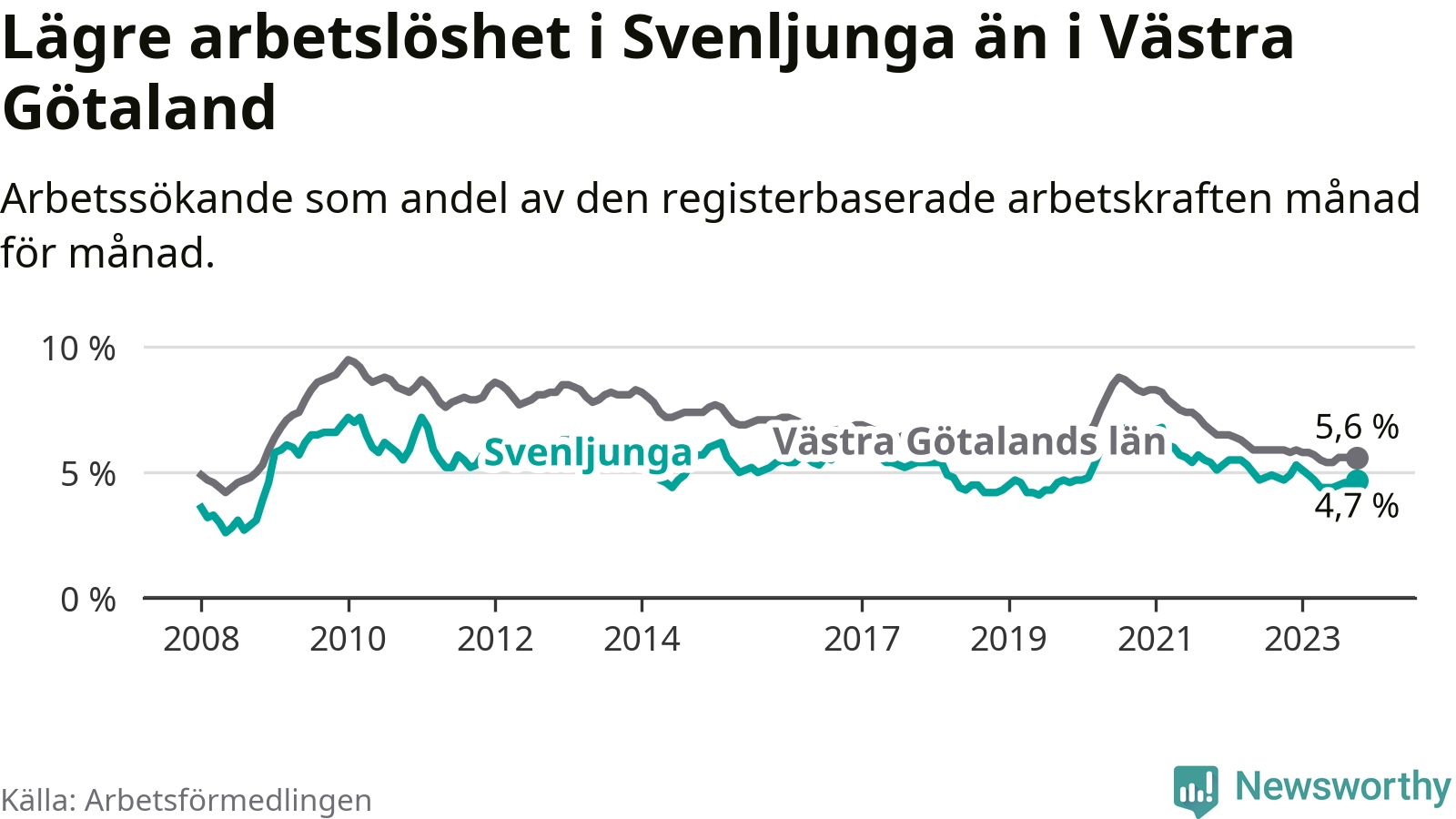 Medan Svenljunga har lägre total arbetslöshet än Västra Götaland, ligger ungdomsarbetslösheten 0,6 procentenheter högre i Svenljunga.