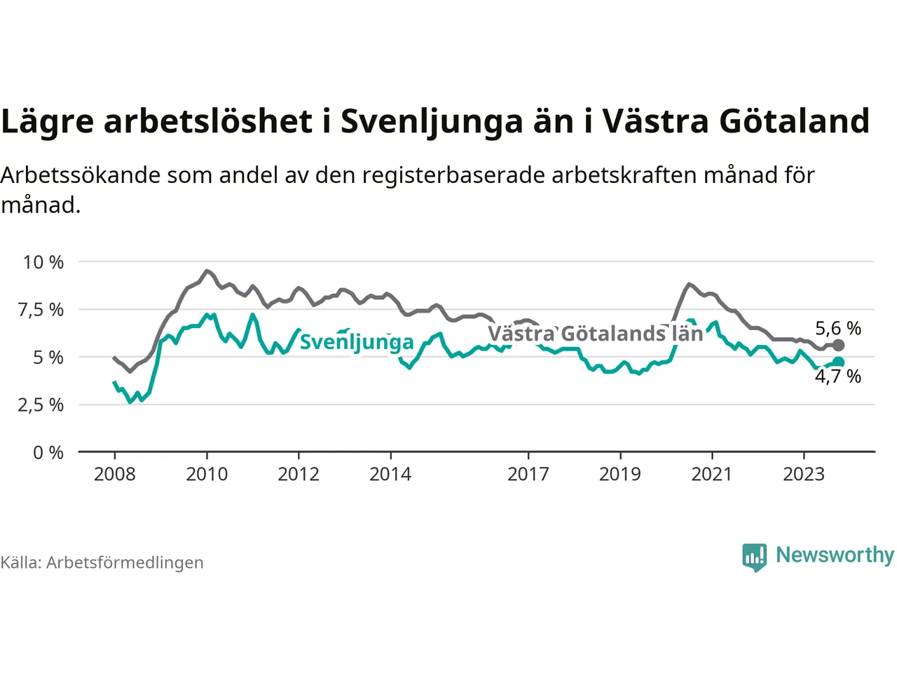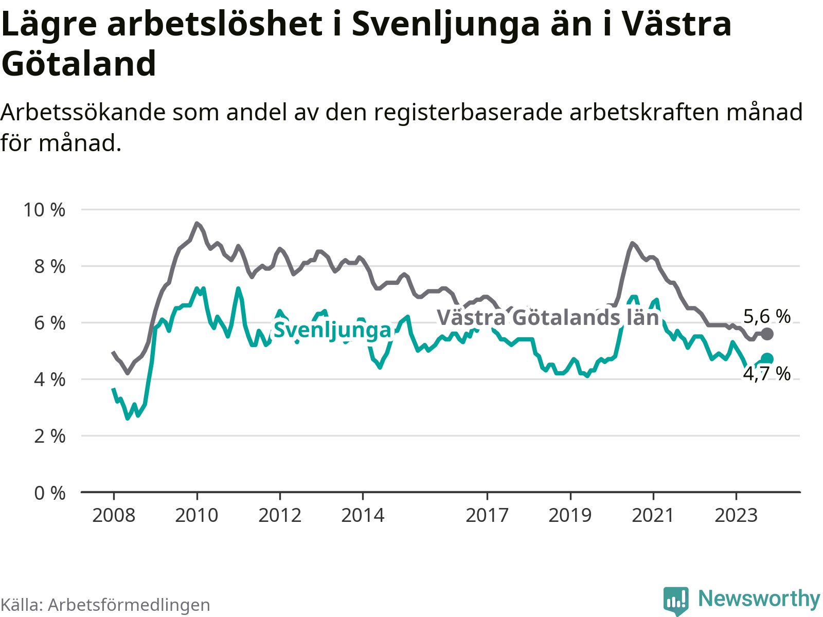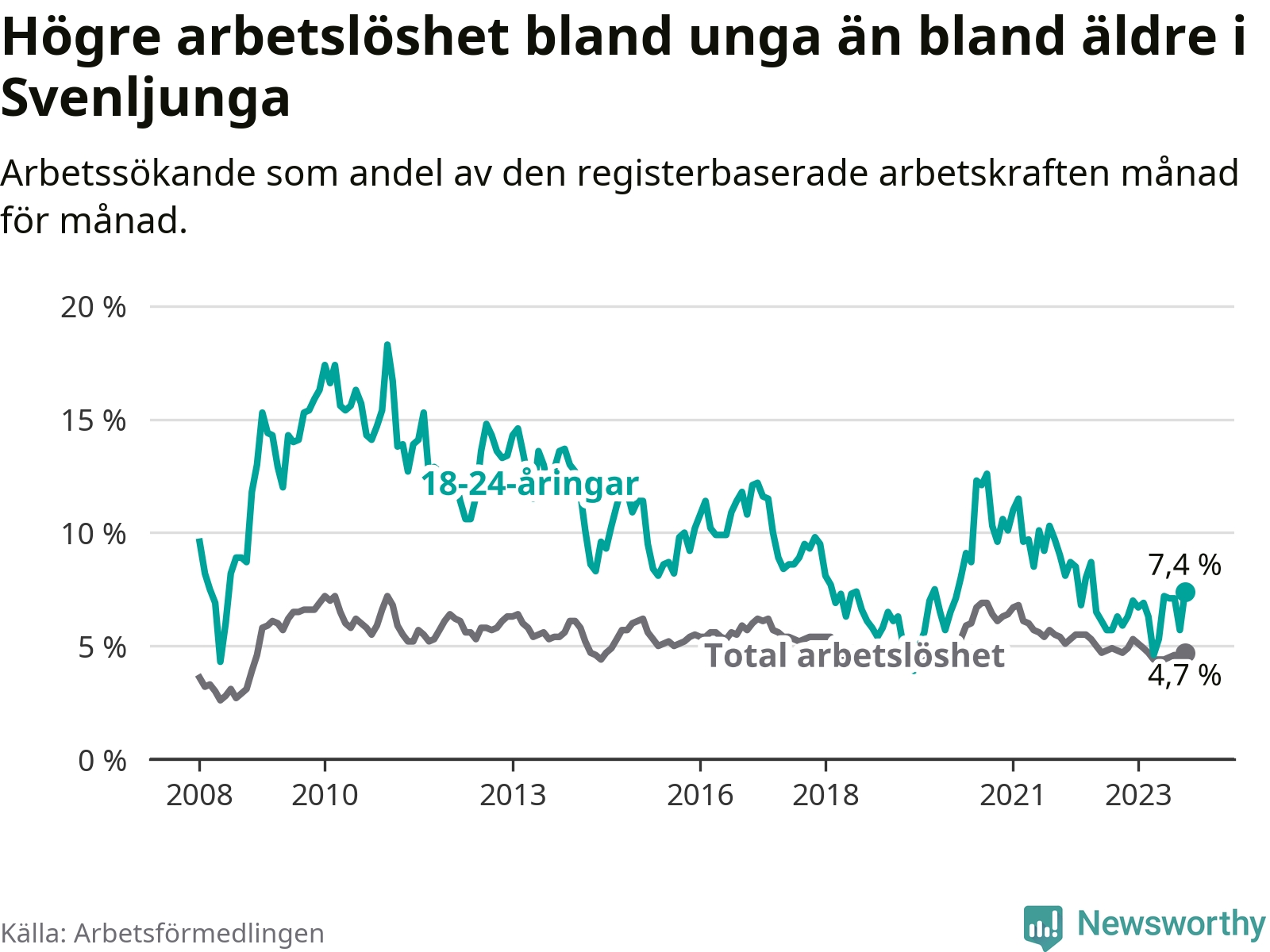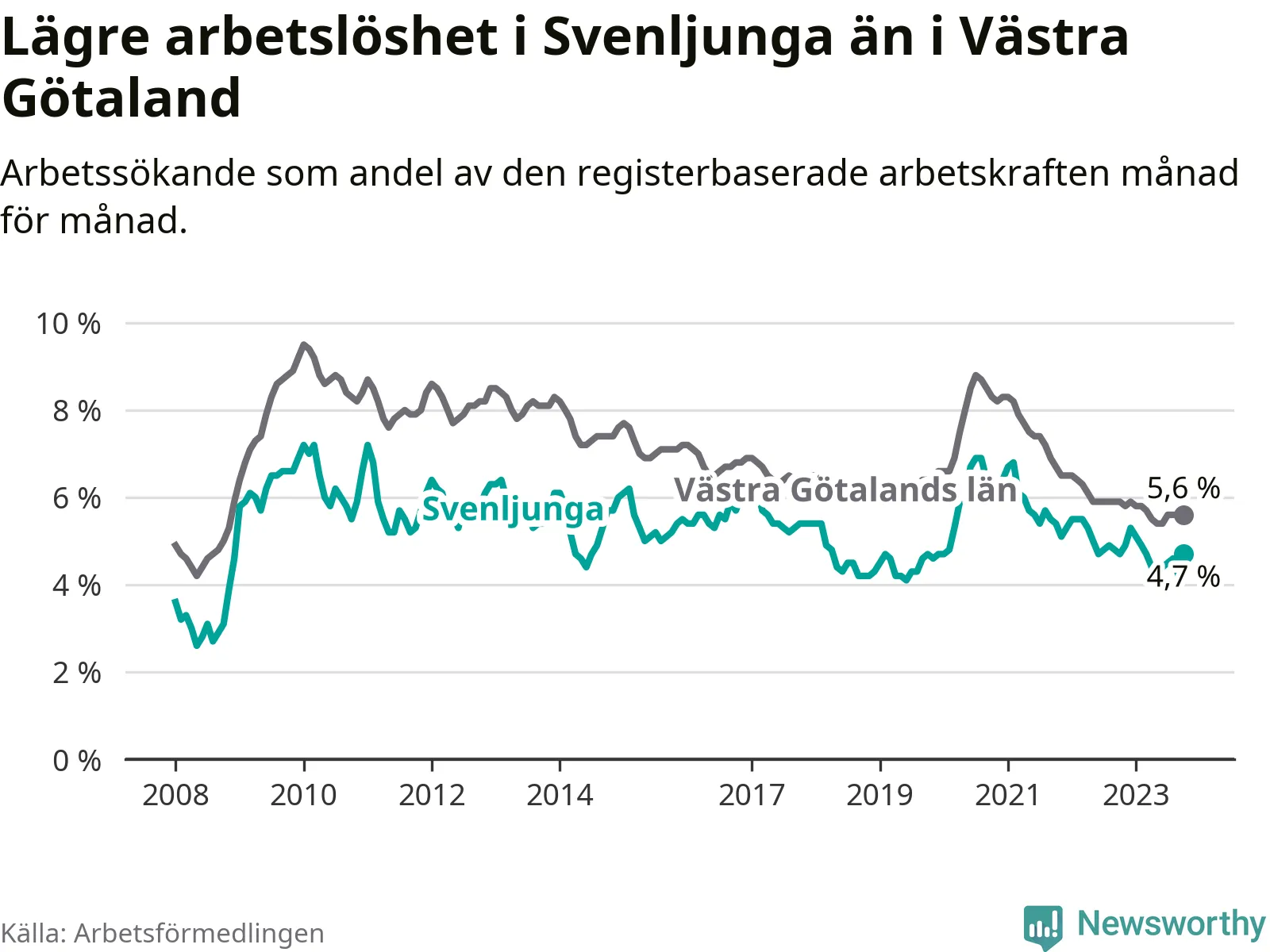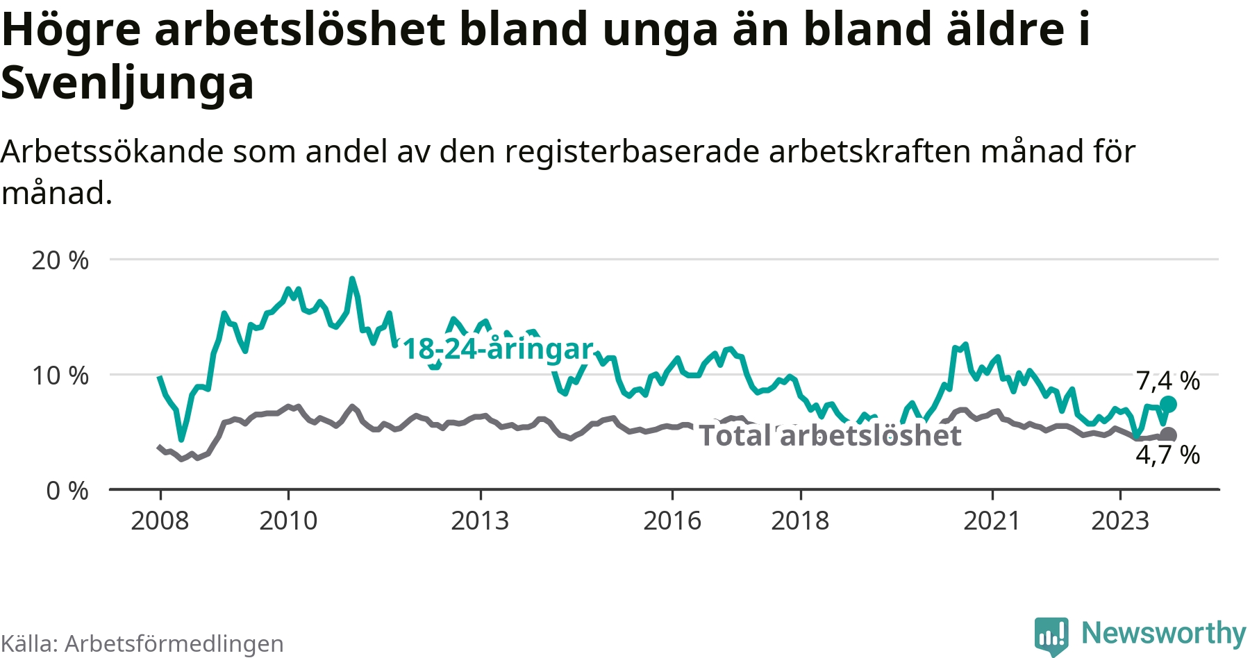 Medan Svenljunga har lägre total arbetslöshet än Västra Götaland, ligger ungdomsarbetslösheten 0,6 procentenheter högre i Svenljunga.