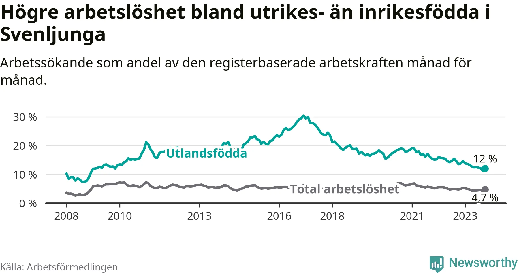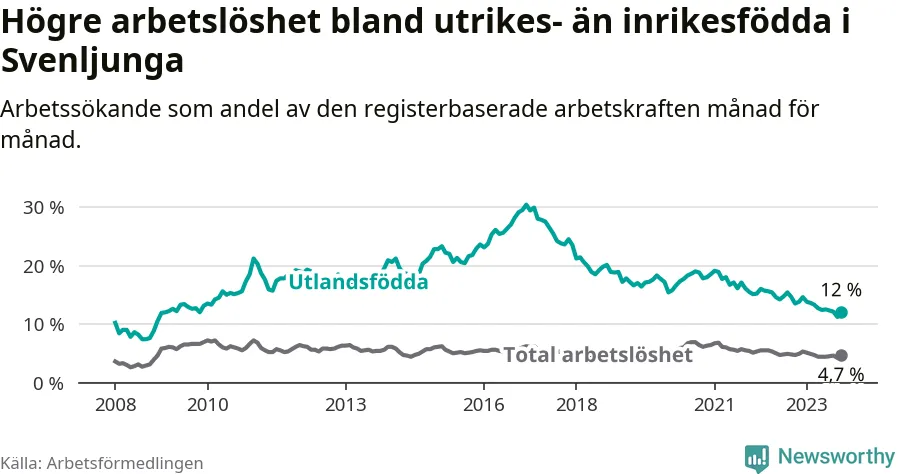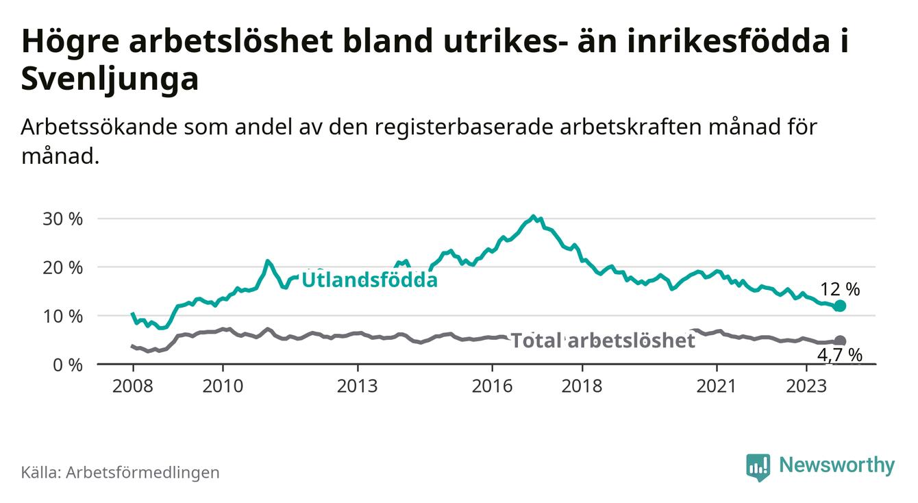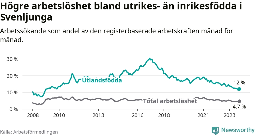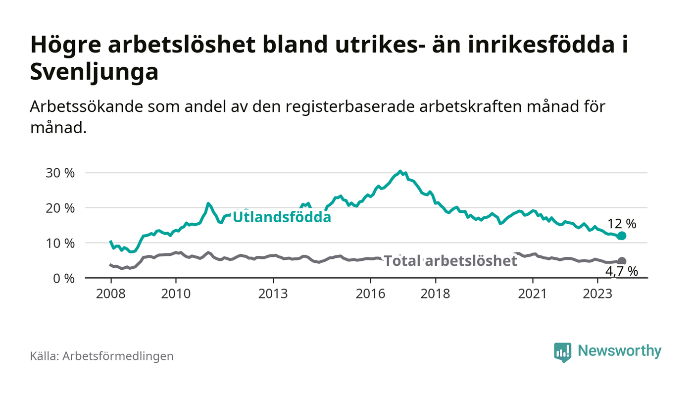 Arbetslösheten bland utlandsfödda var 12,0 procent i Svenljunga under oktober månad, motsvarande 106 av 883 personer. Det är 1,5 procentenheter färre än vid samma tidpunkt i fjol (−6 om man räknar personer). Därmed har de utlandsföddas arbetslöshet varit lägre än vid samma tidpunkt i fjol i över två år i sträck. Sedan april 2021 har arbetslösheten bland utlandsfödda minskat från 18,0 till 12,0 procent.