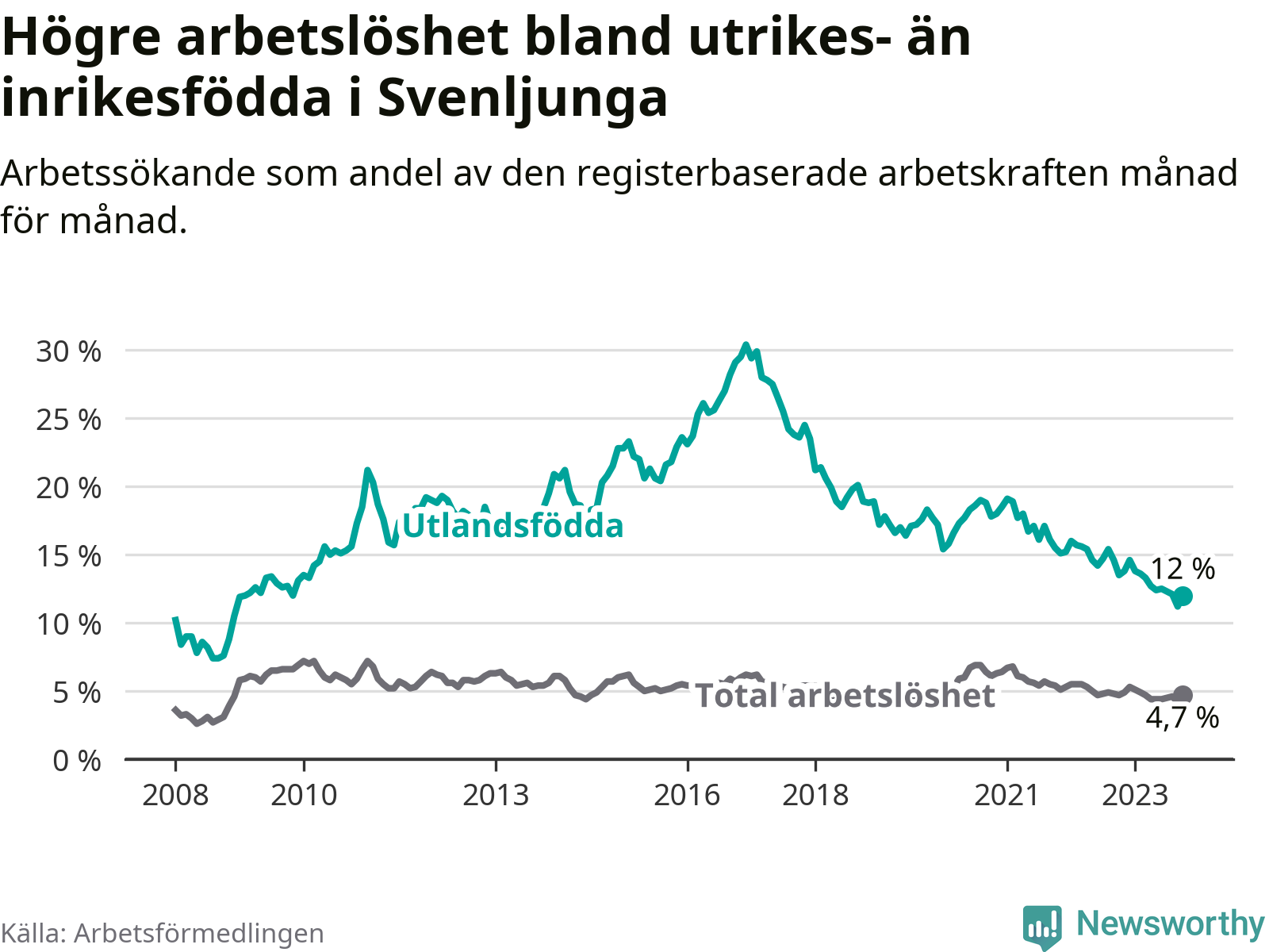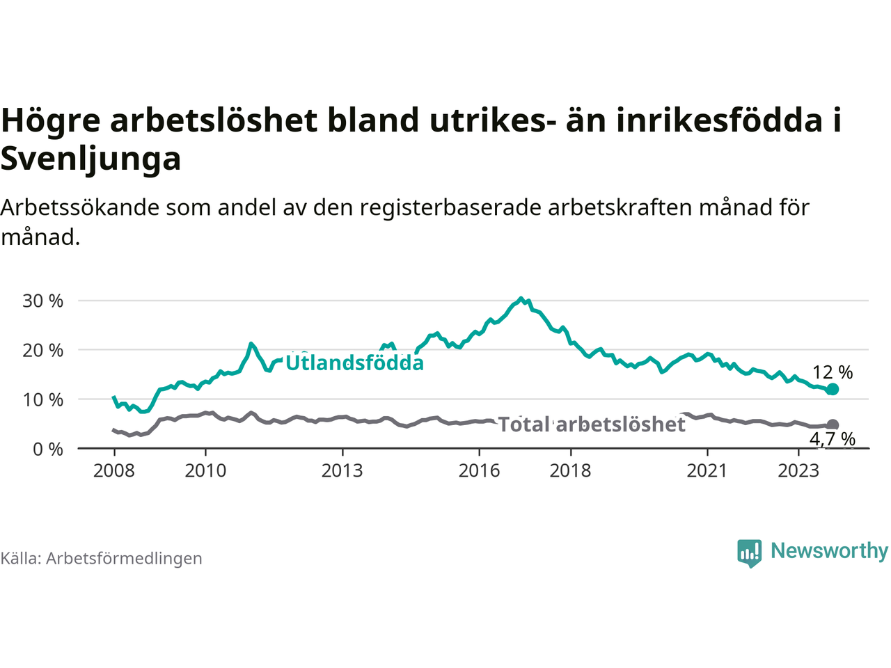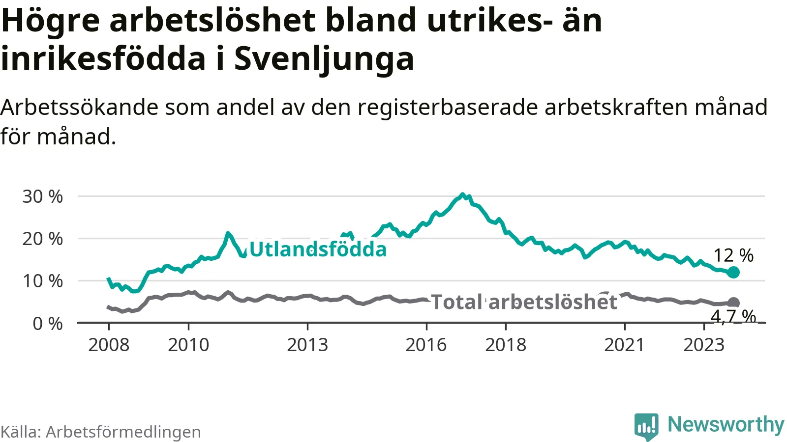 Arbetslösheten bland utlandsfödda var 12,0 procent i Svenljunga under oktober månad, motsvarande 106 av 883 personer. Det är 1,5 procentenheter färre än vid samma tidpunkt i fjol (−6 om man räknar personer). Därmed har de utlandsföddas arbetslöshet varit lägre än vid samma tidpunkt i fjol i över två år i sträck. Sedan april 2021 har arbetslösheten bland utlandsfödda minskat från 18,0 till 12,0 procent.