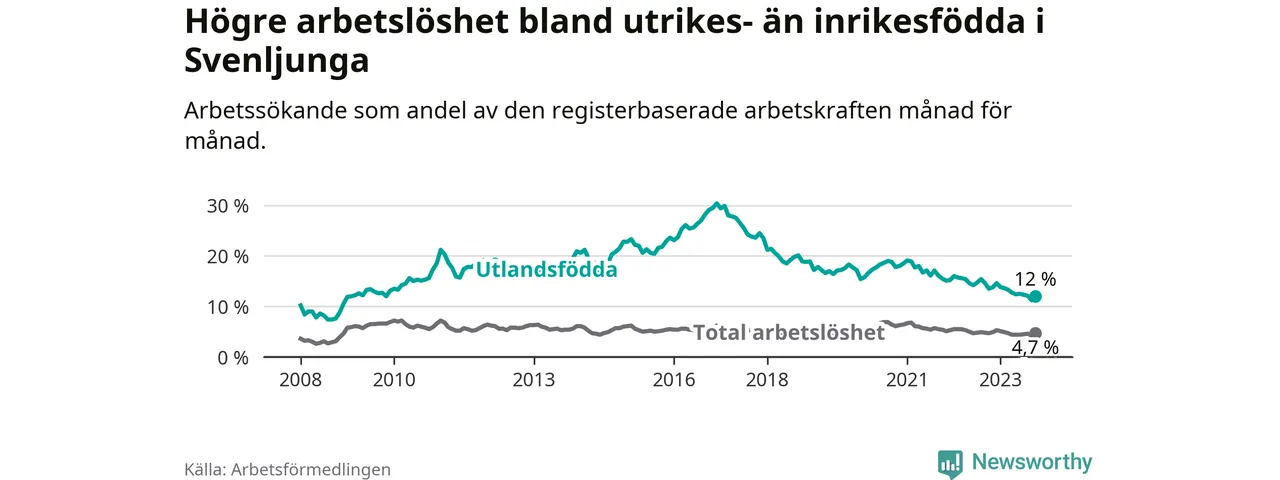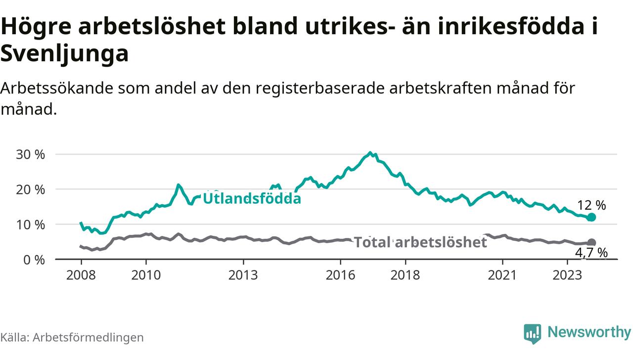 Den senaste månadsstatistiken från Arbetsförmedlingen visar på en nedgång i arbetslöshet bland utlandsfödda i Svenljunga kommun med 1,5 procentenheter. Arbetslösheten bland invånare födda i ett annat land låg i oktober på 12,0 procent.