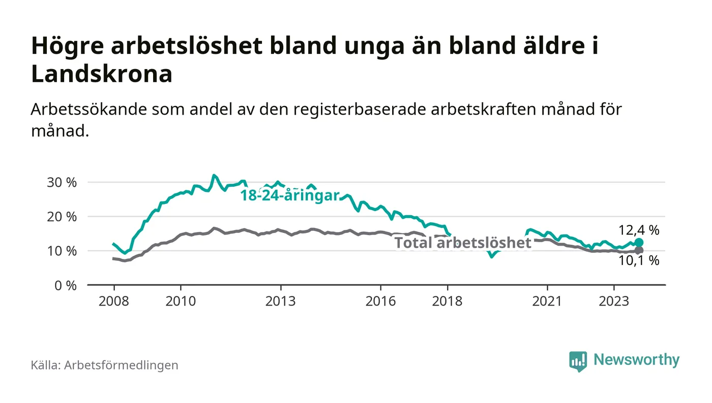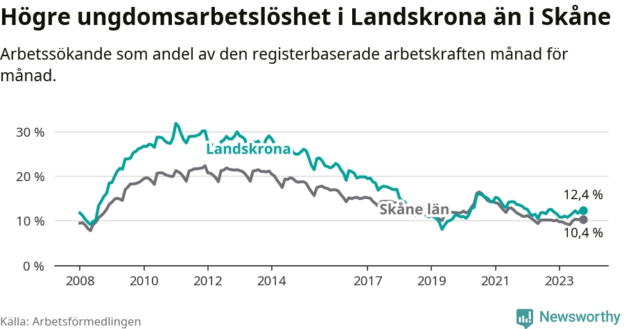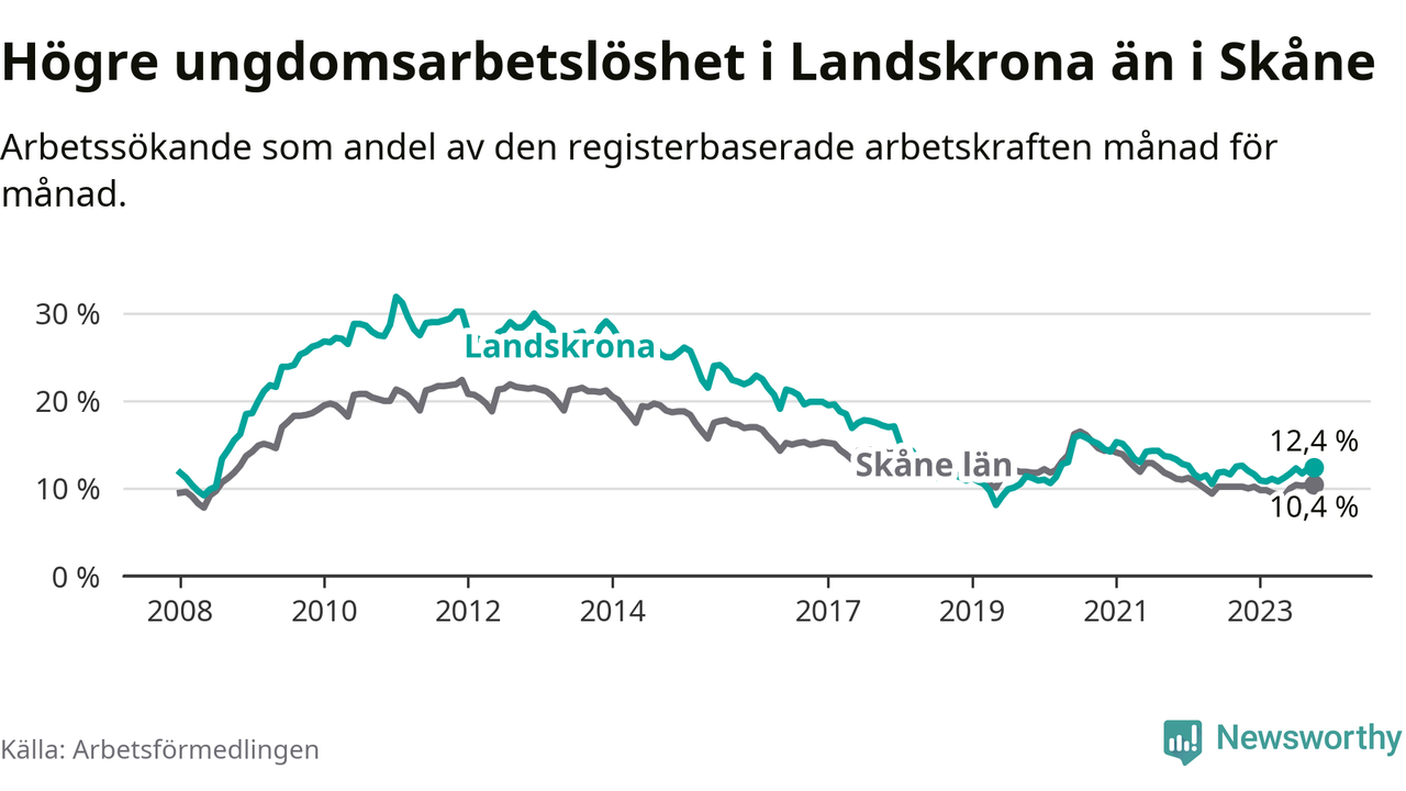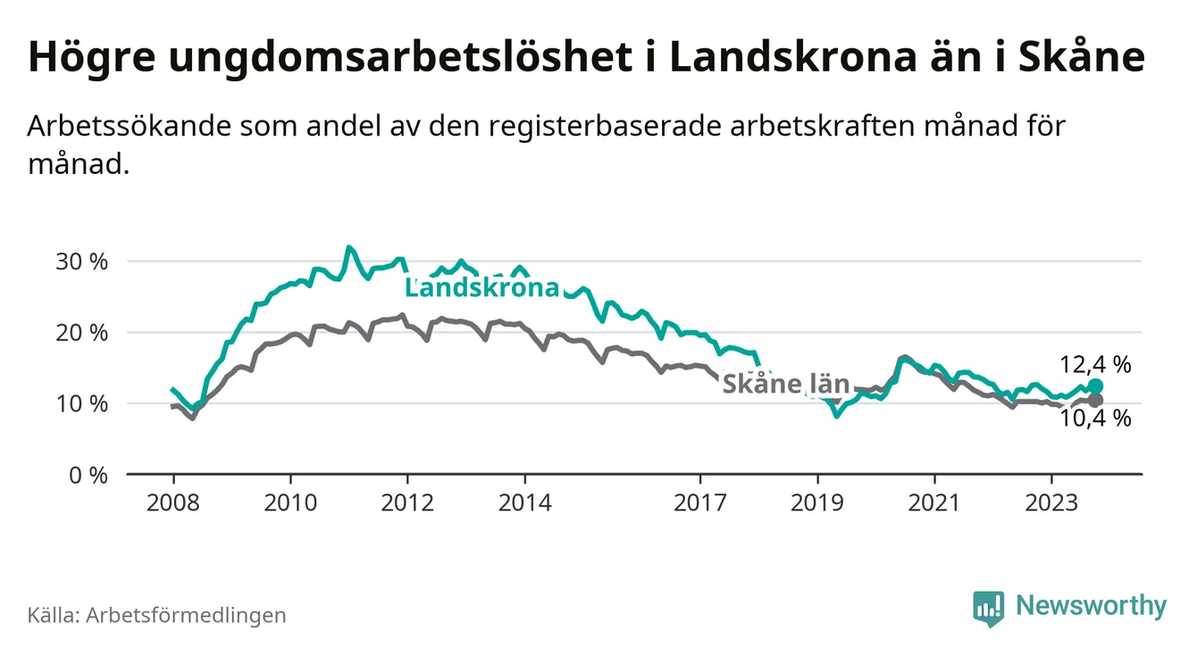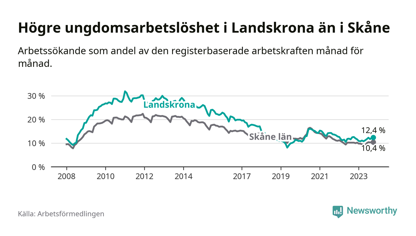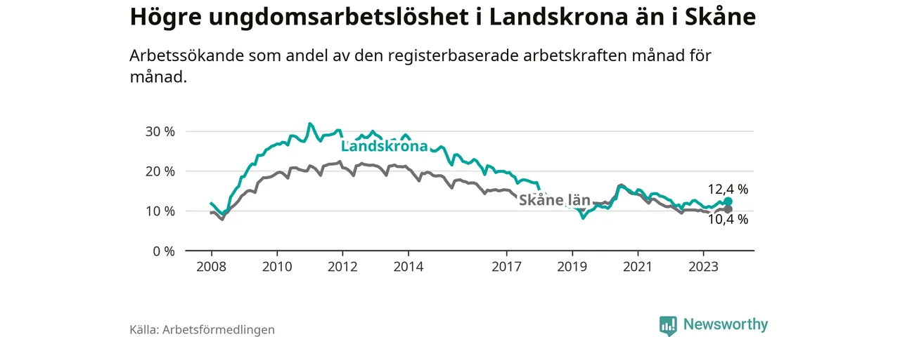 Precis som den totala arbetslösheten ligger ungdomsarbetslösheten i Landskrona högre än i Skåne som helhet. Skillnaden mellan kommunen och länet är 2,0 procentenheter.