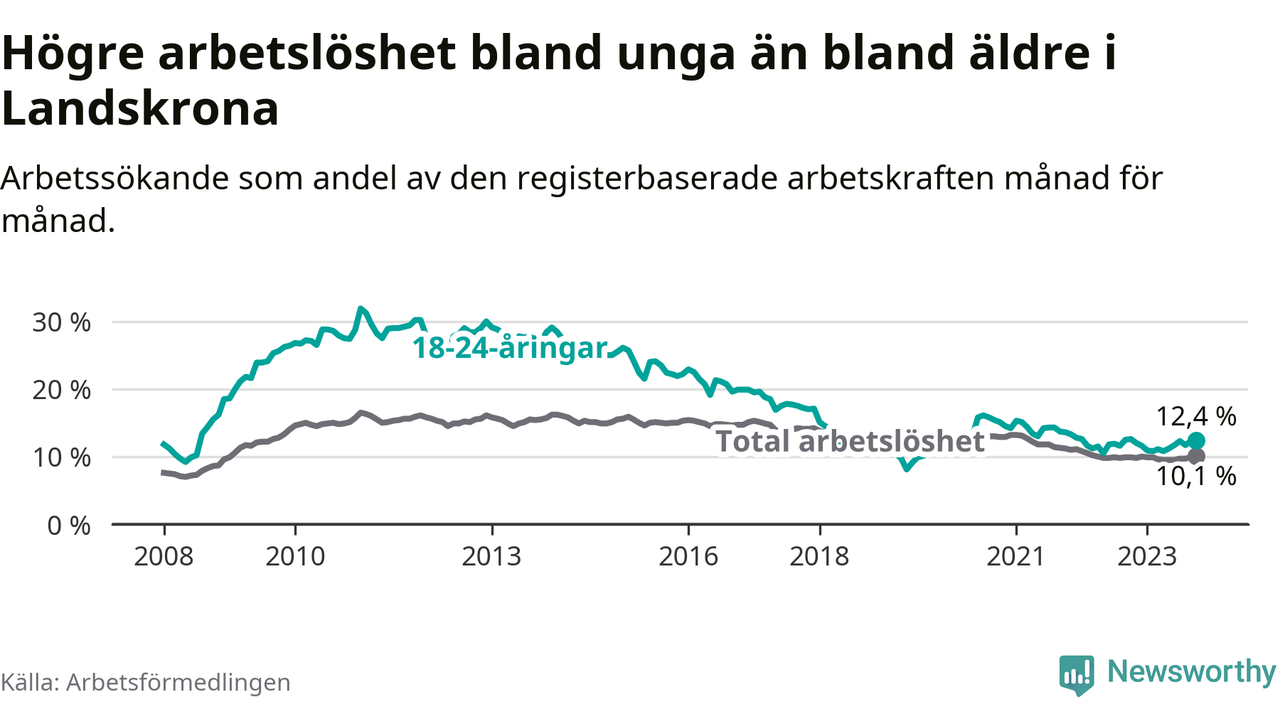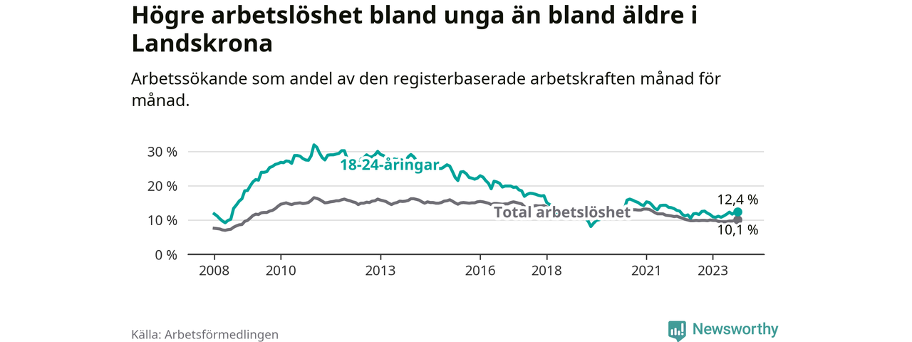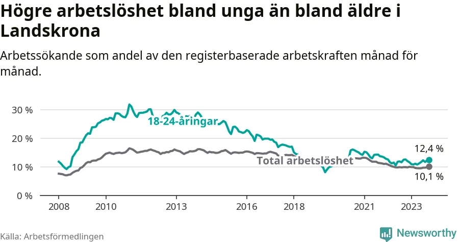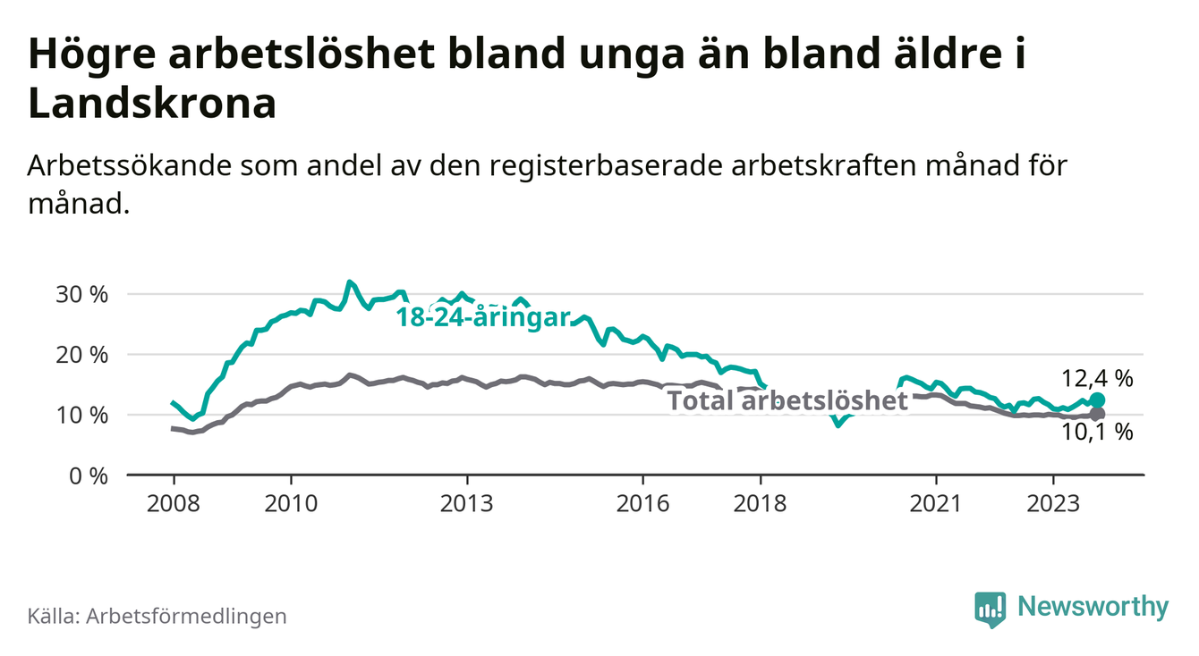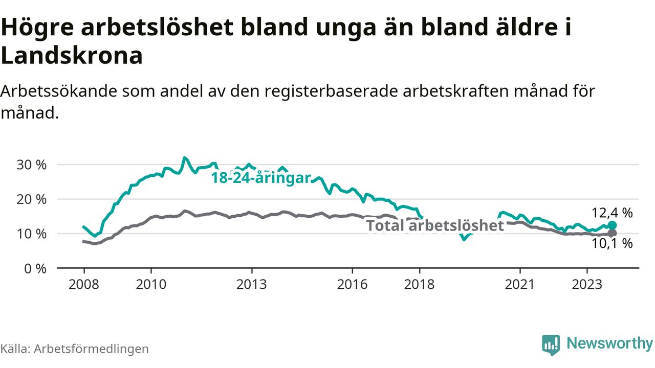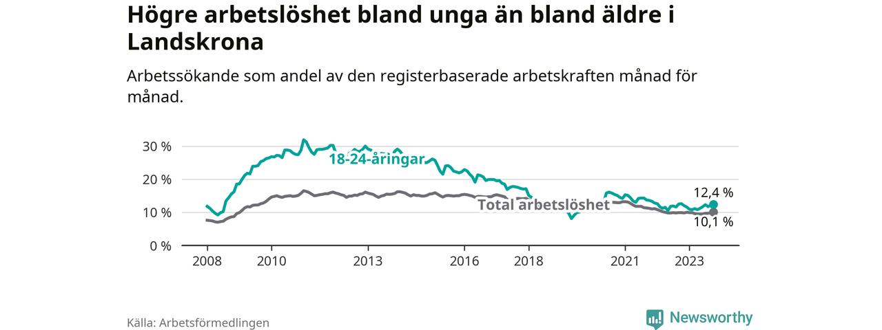 Precis som den totala arbetslösheten ligger ungdomsarbetslösheten i Landskrona högre än i Skåne som helhet. Skillnaden mellan kommunen och länet är 2,0 procentenheter.