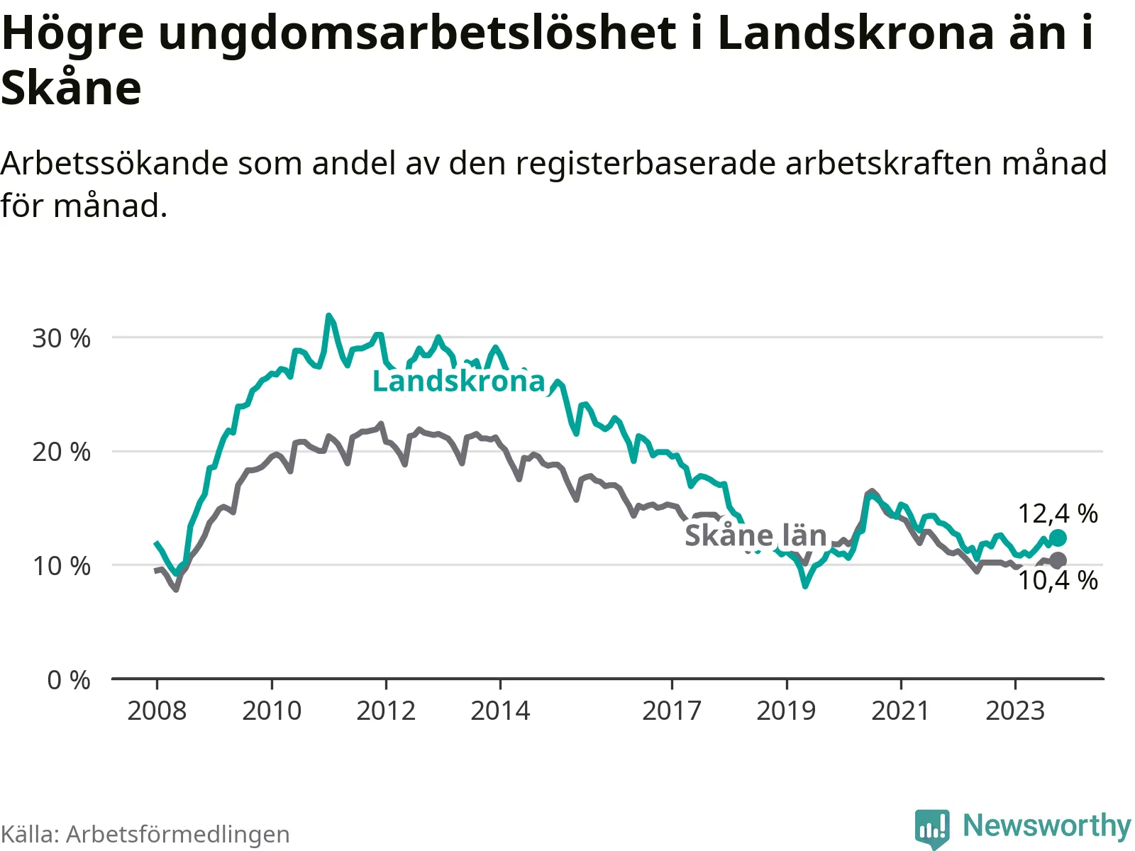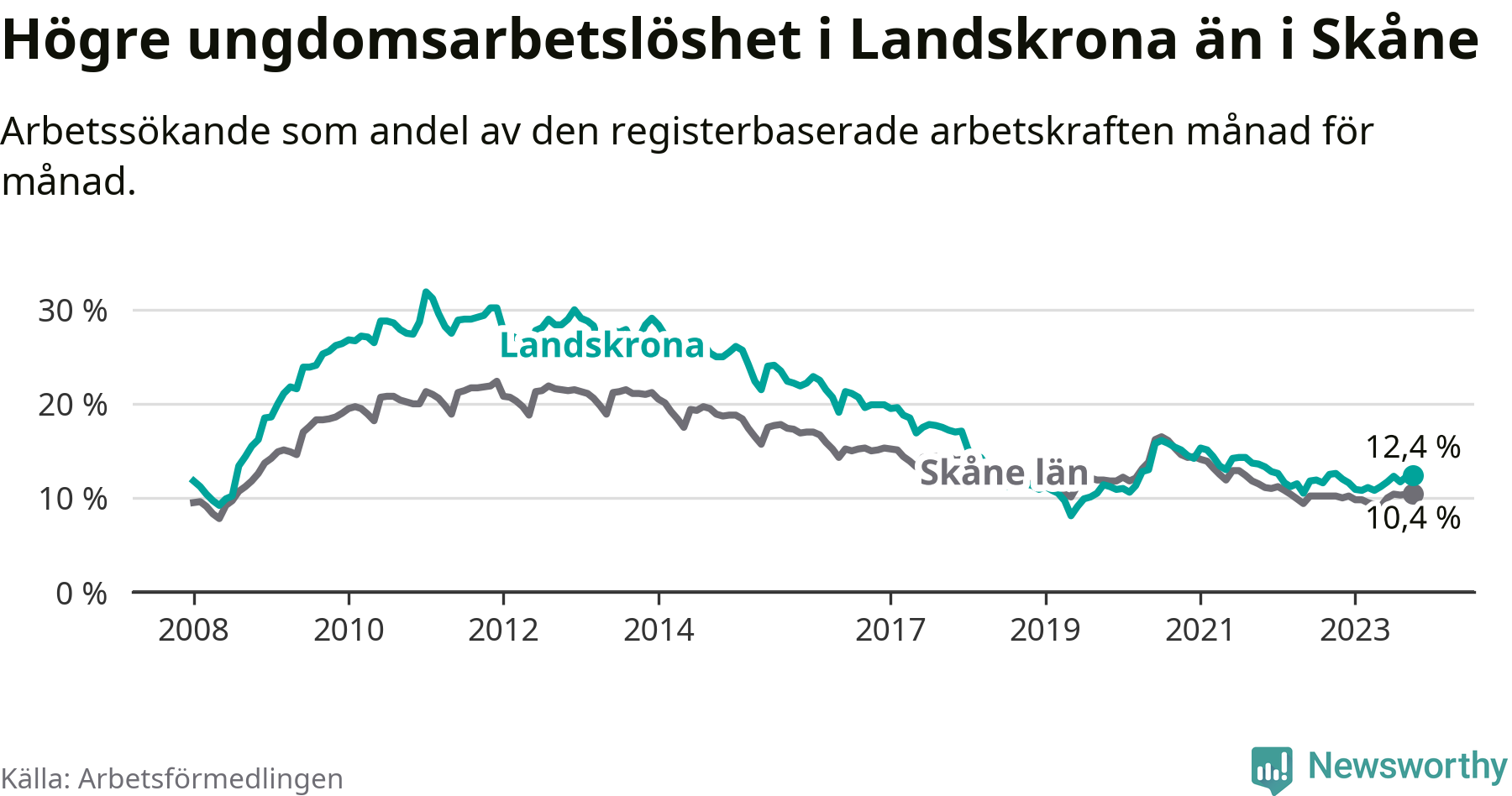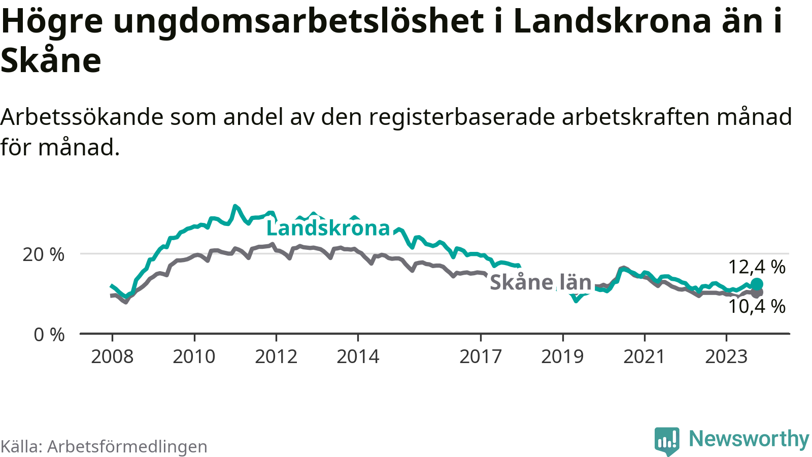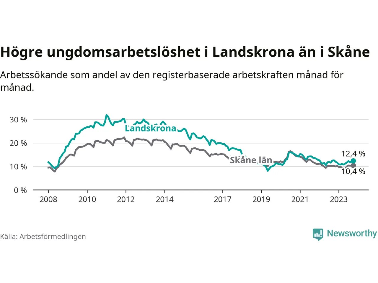 Precis som den totala arbetslösheten ligger ungdomsarbetslösheten i Landskrona högre än i Skåne som helhet. Skillnaden mellan kommunen och länet är 2,0 procentenheter.