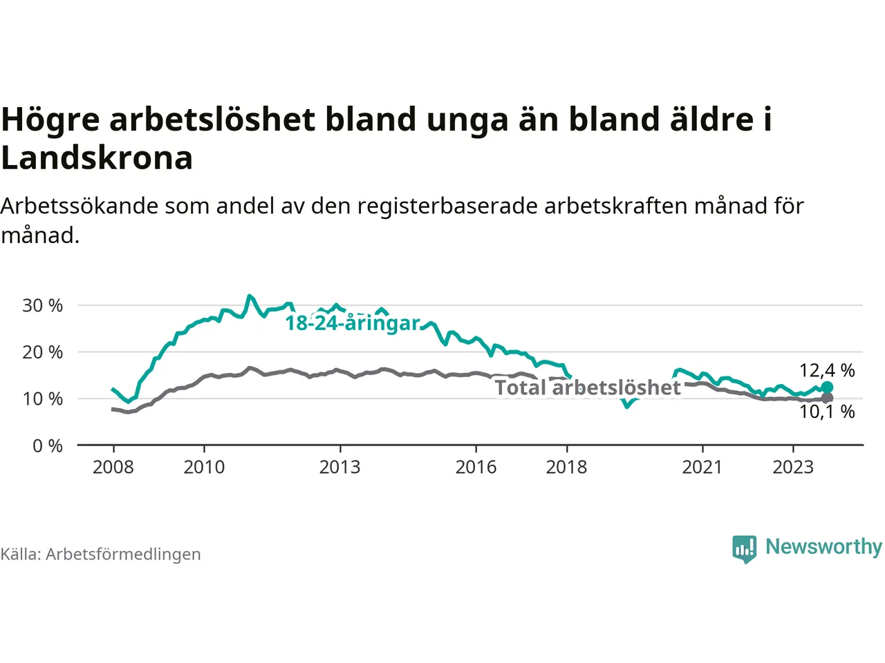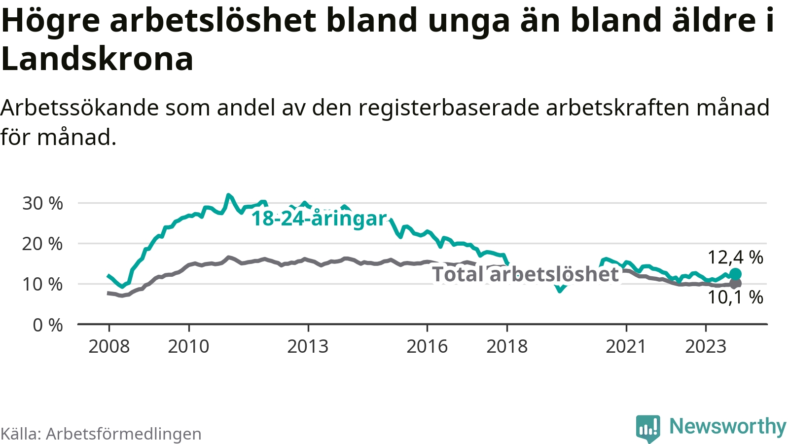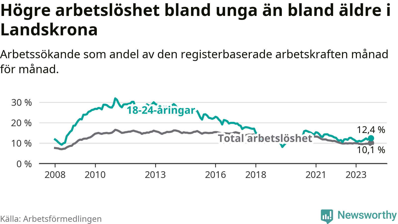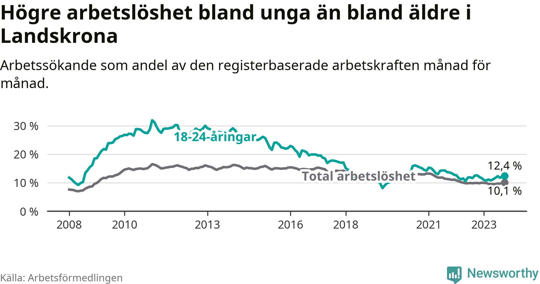 Precis som den totala arbetslösheten ligger ungdomsarbetslösheten i Landskrona högre än i Skåne som helhet. Skillnaden mellan kommunen och länet är 2,0 procentenheter.
