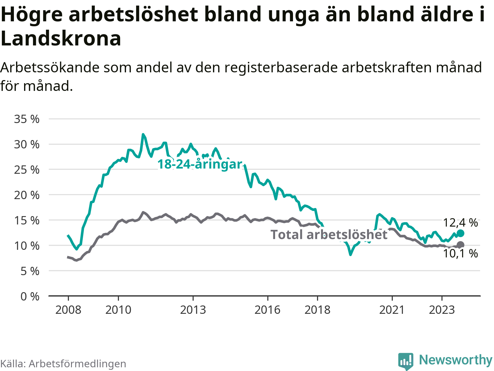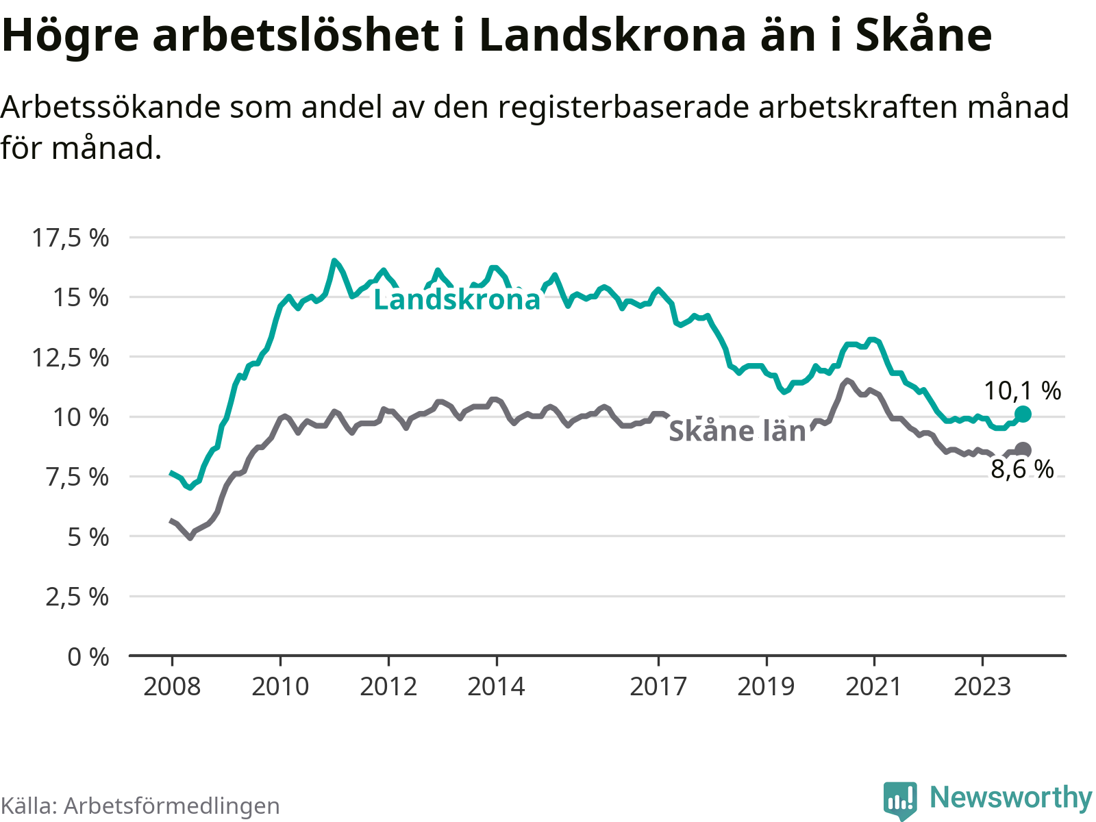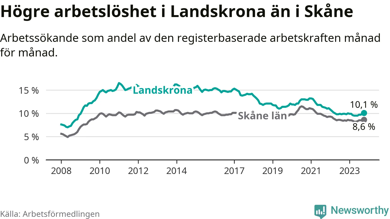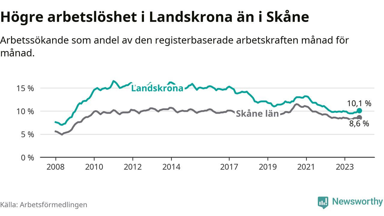 Malmö är den kommun som har högst arbetslöshet just nu (12,3 procent) i landet som helhet, medan Kiruna har den lägsta (2,2 procent). Landskronas arbetslöshet sticker ut som den nionde högsta i hela landet.