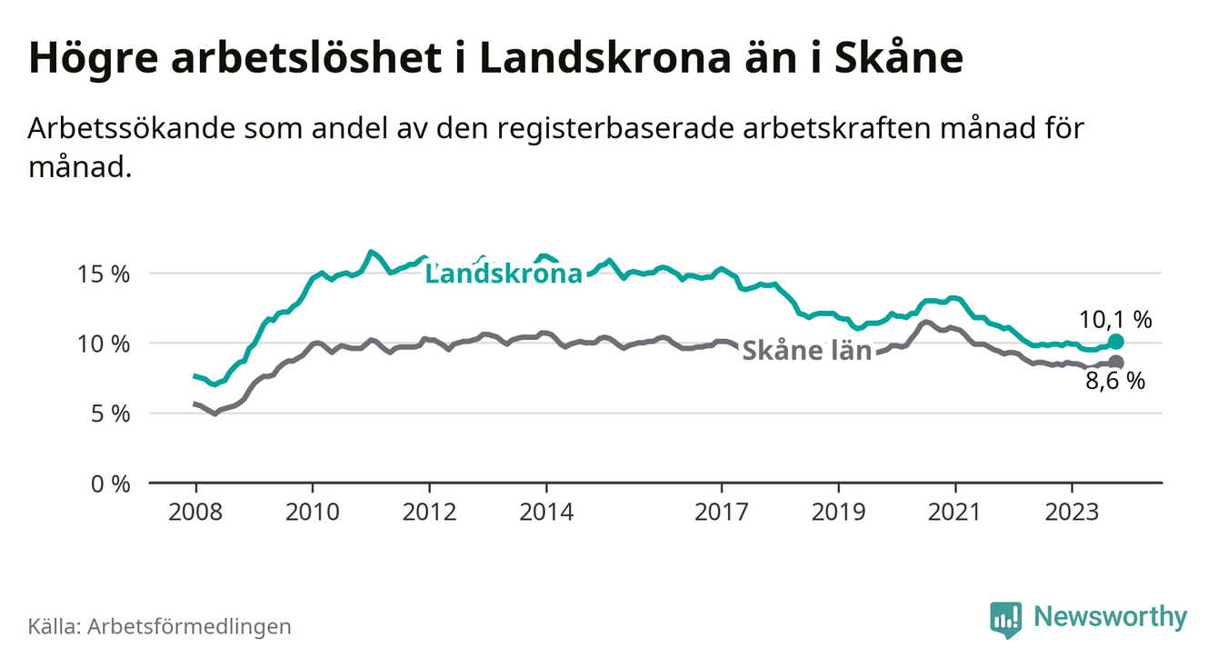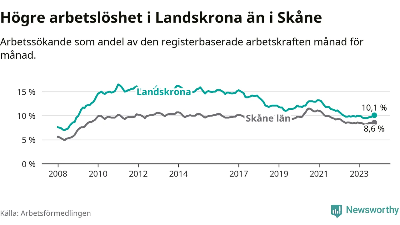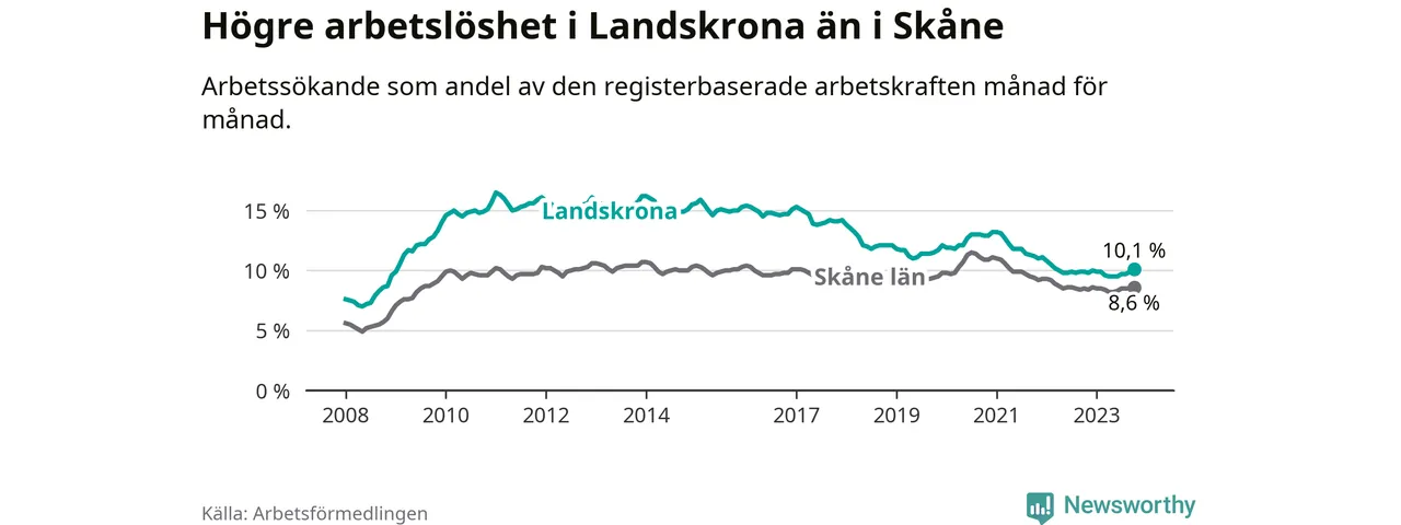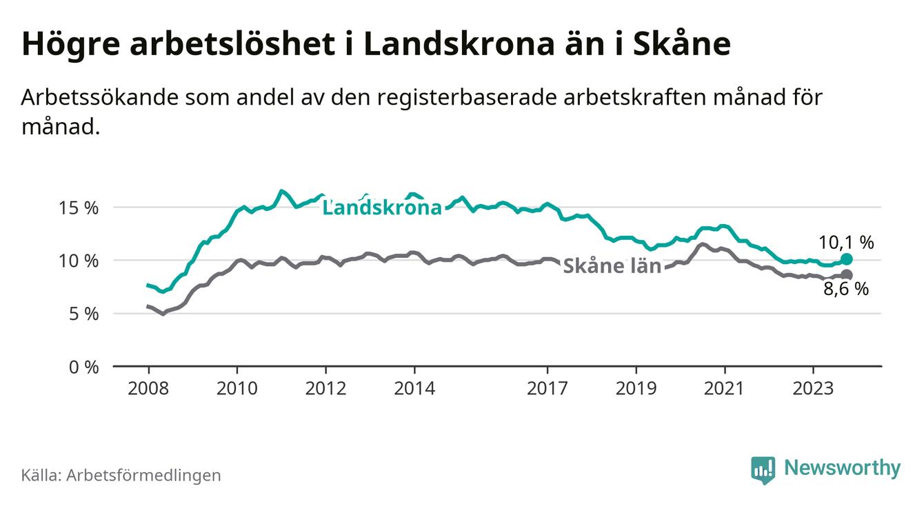 Landskrona hade redan tidigare högre arbetslöshet än snittet i hela Skåne län och nu växer klyftan (10,1 procent i kommunen, jämfört med 8,6 procent i hela länet). Vellinge har den lägsta arbetslösheten i länet (3,3 procent), medan Malmö har den högsta (12,3 procent). För att Landskrona skulle komma ner i samma arbetslöshetsnivå som Vellinge skulle 1 501 personer behöva sysselsättas.